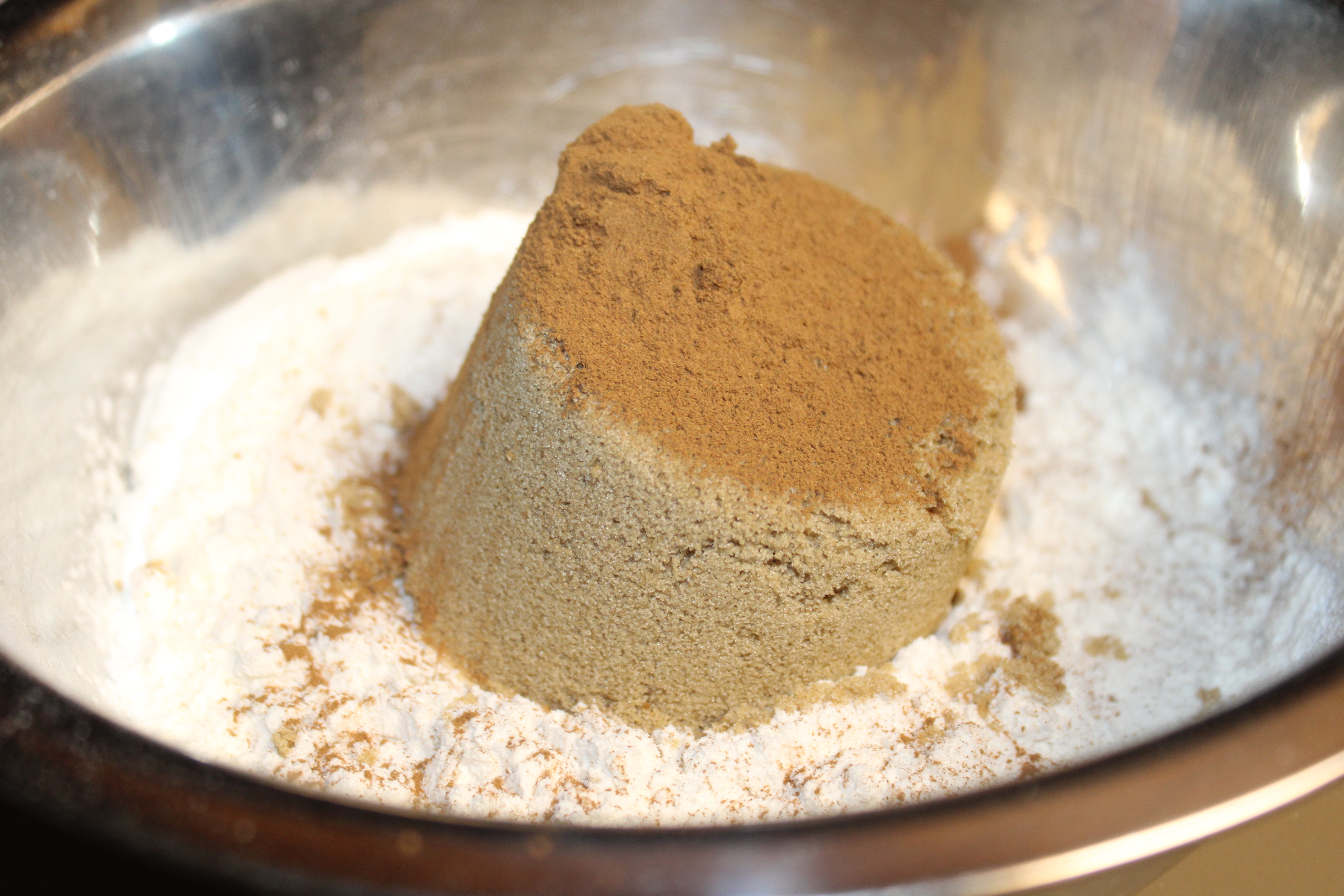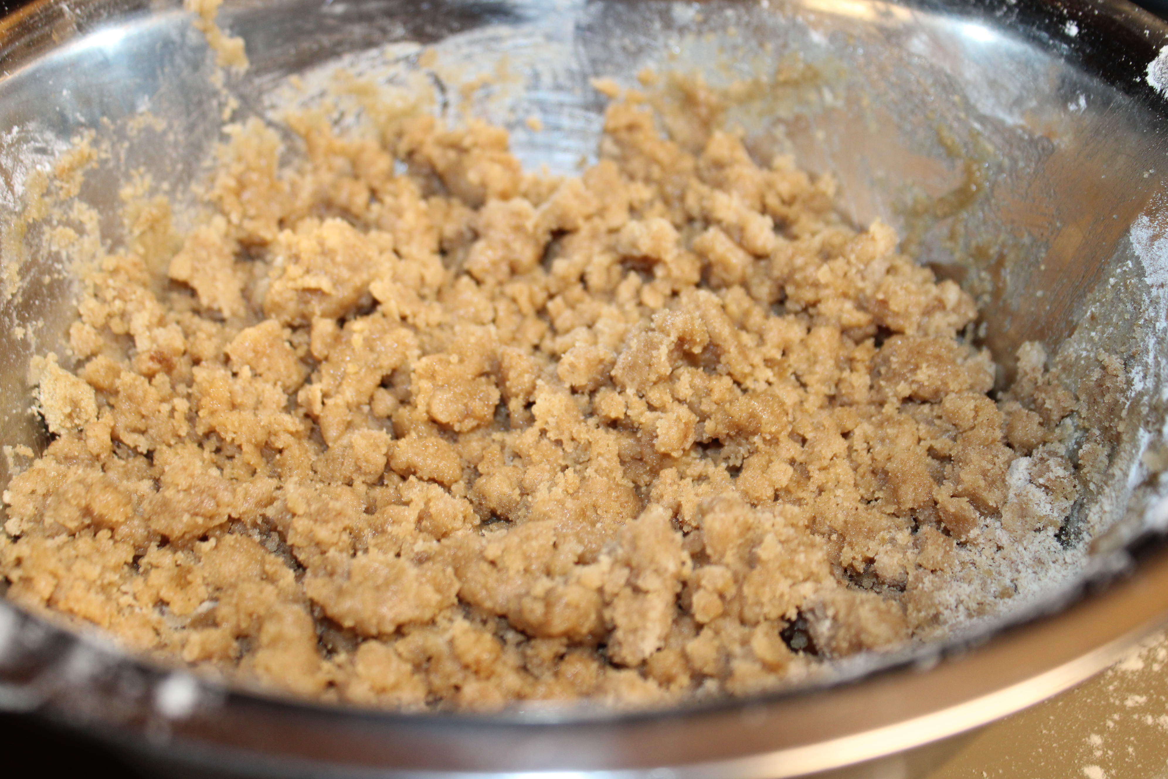 In a clean mixing bowl combine remaining 2-1/2 cups flour, brown sugar and cinnamon. Melt butter, pour over flour mixture. Toss with a rubber spatula until large crumbs form. Sprinkle crumbs over the batter.