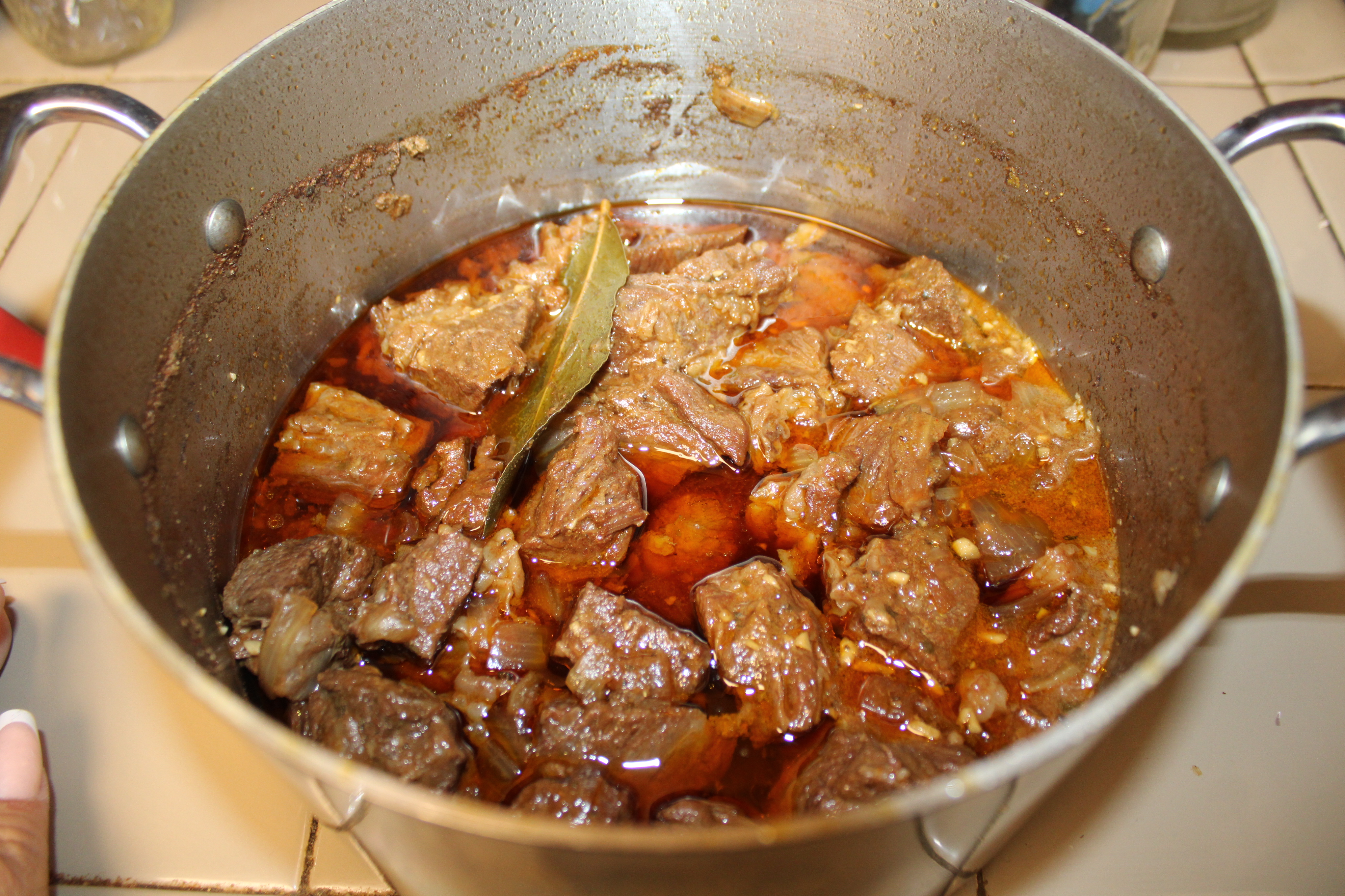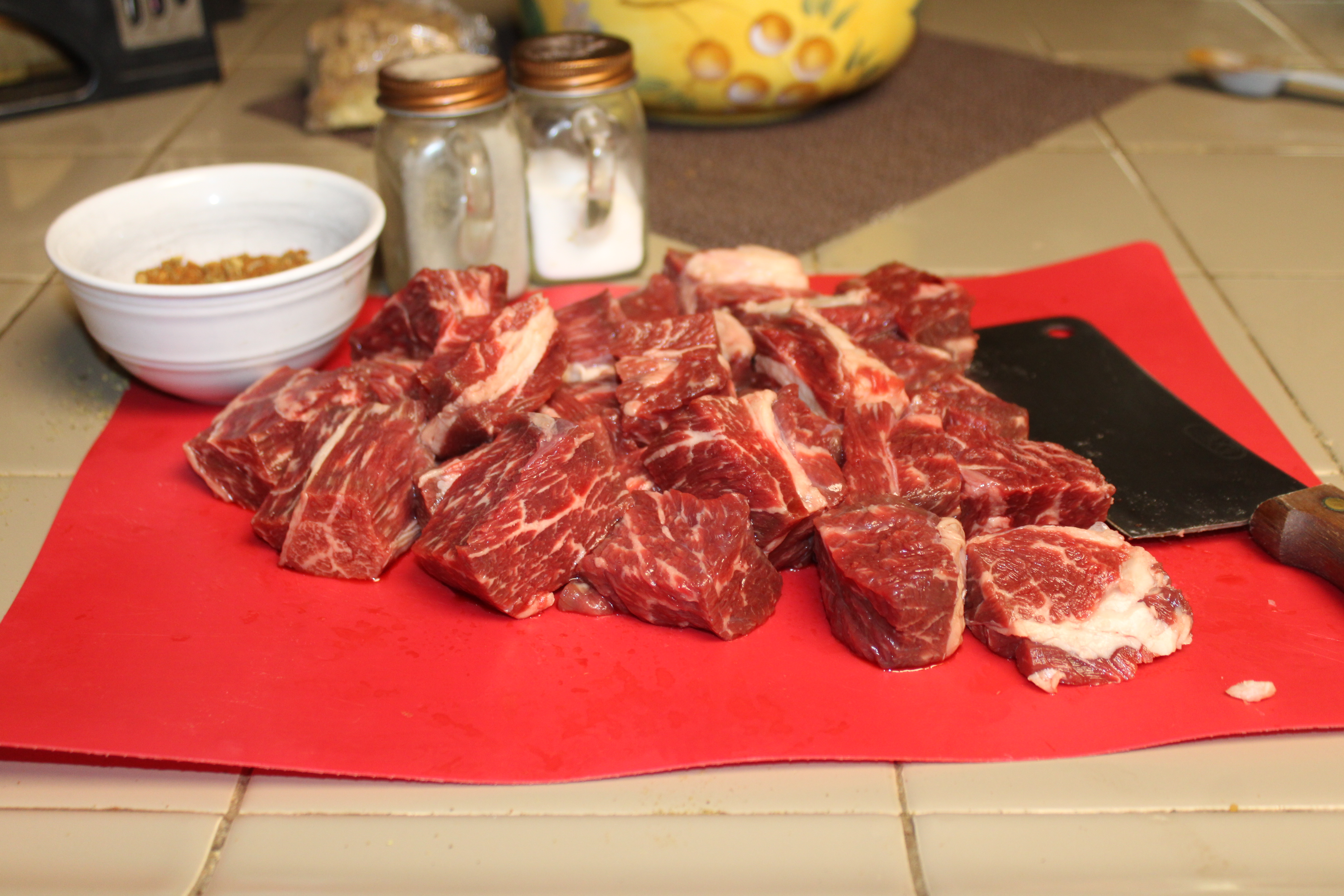 Cut roast into 1 inch cubes. Peel and roughly chop onion. Peel and dice garlic cloves. Set aside. In a bowl mix together cumin, oregano and chili powder.