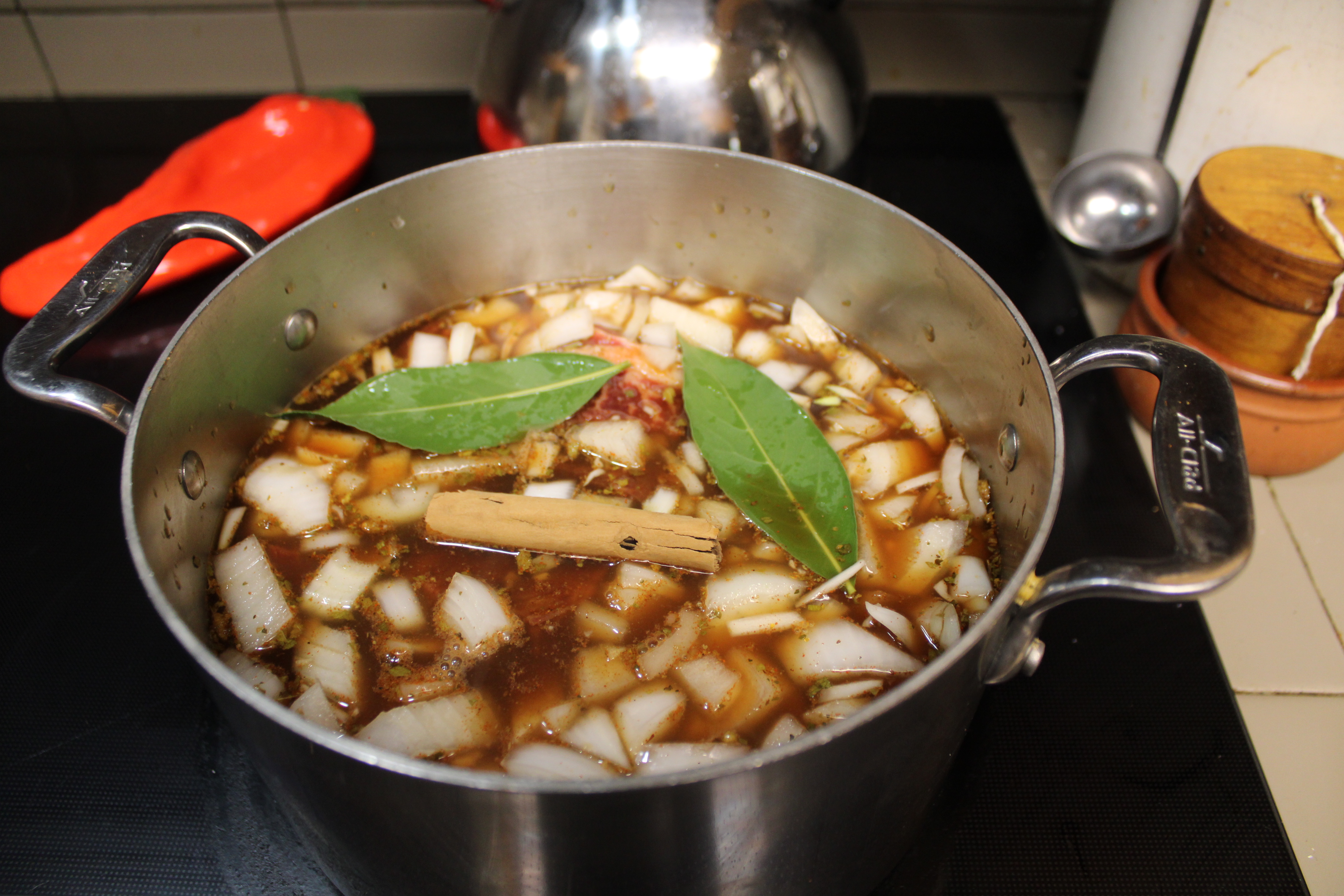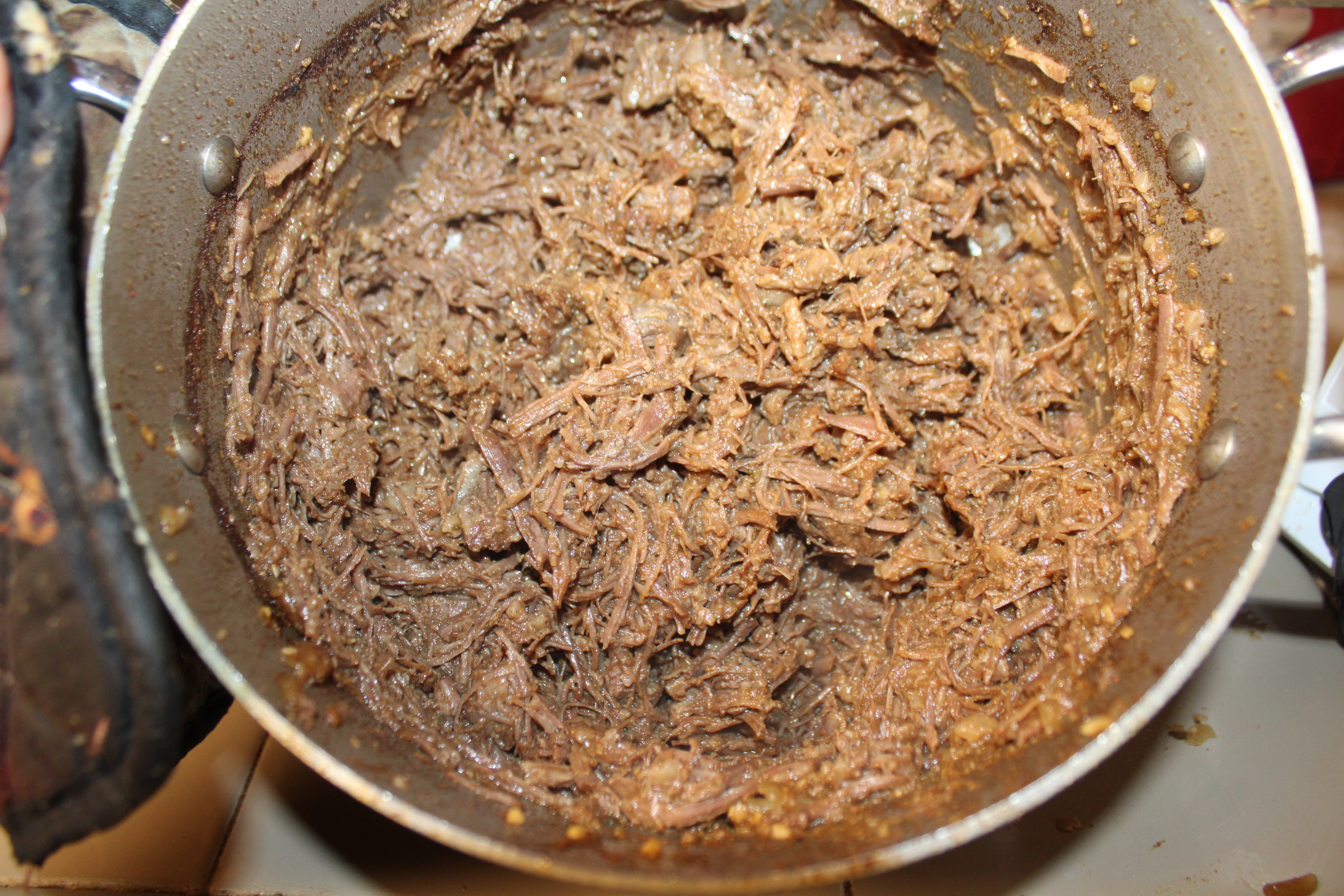Remove bay leaves and cinnamon stick from the meat. Shred meat, moisten with a little reserved cooking liquid.