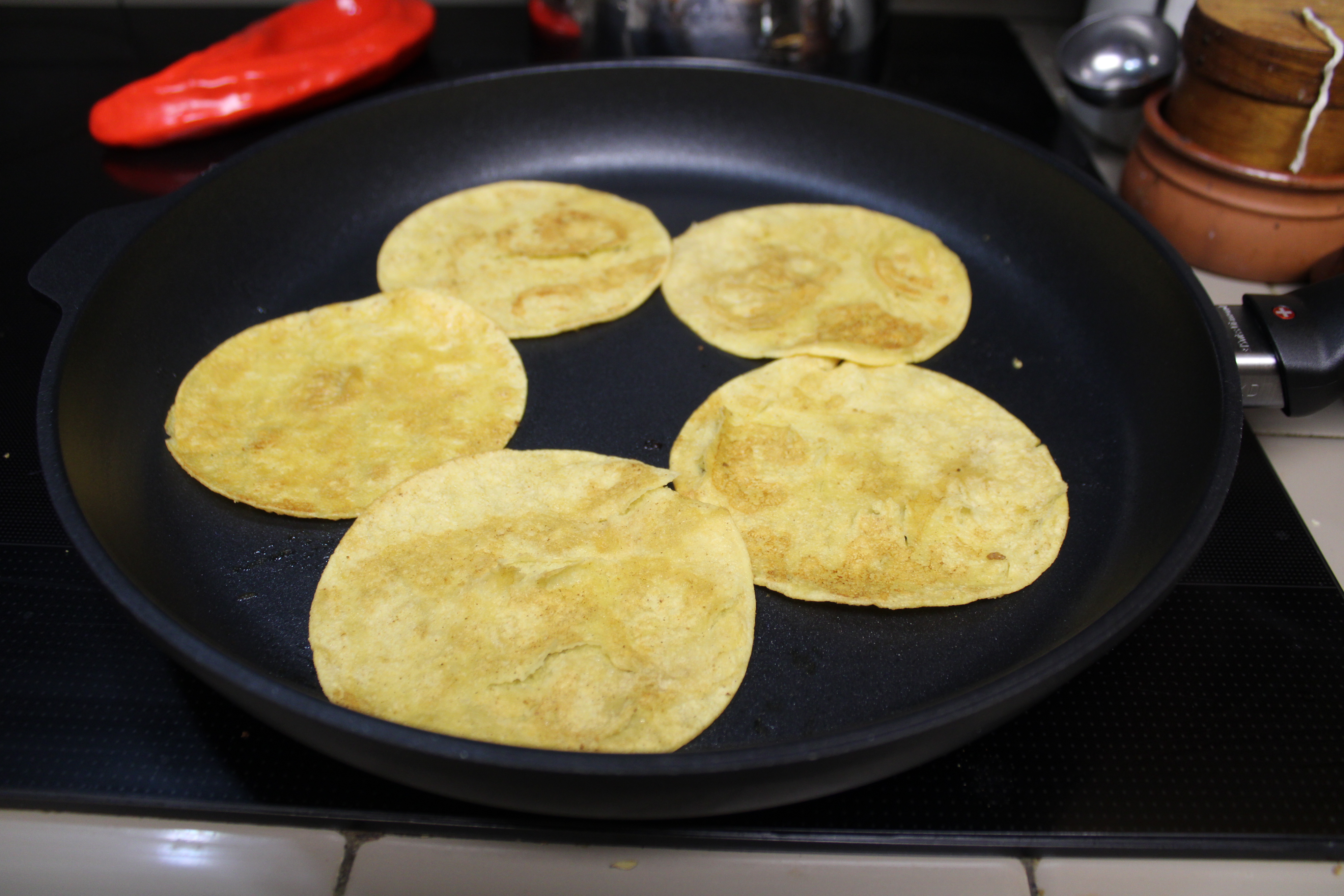 When the meat is almost ready, shred lettuce, set aside. Seed and dice tomatoes. Drain meat, reserving cooking liquid. Dip tortillas in cooking liquid just to moisten. Fry tortillas, keep warm