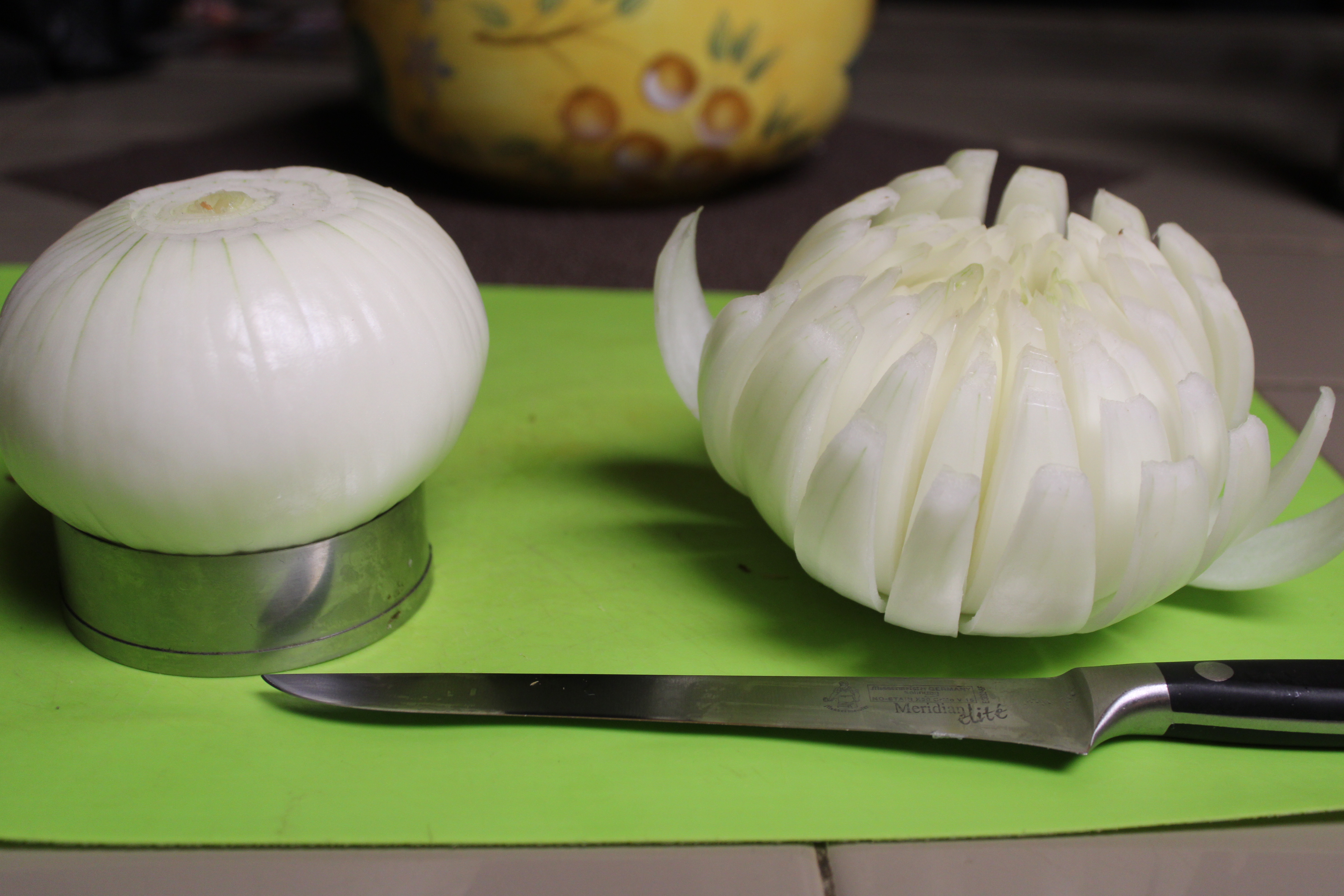 Note: I used a round cutter to hold the onion and prevent knife from slicing all the way through. It worked perfectly as a guide.