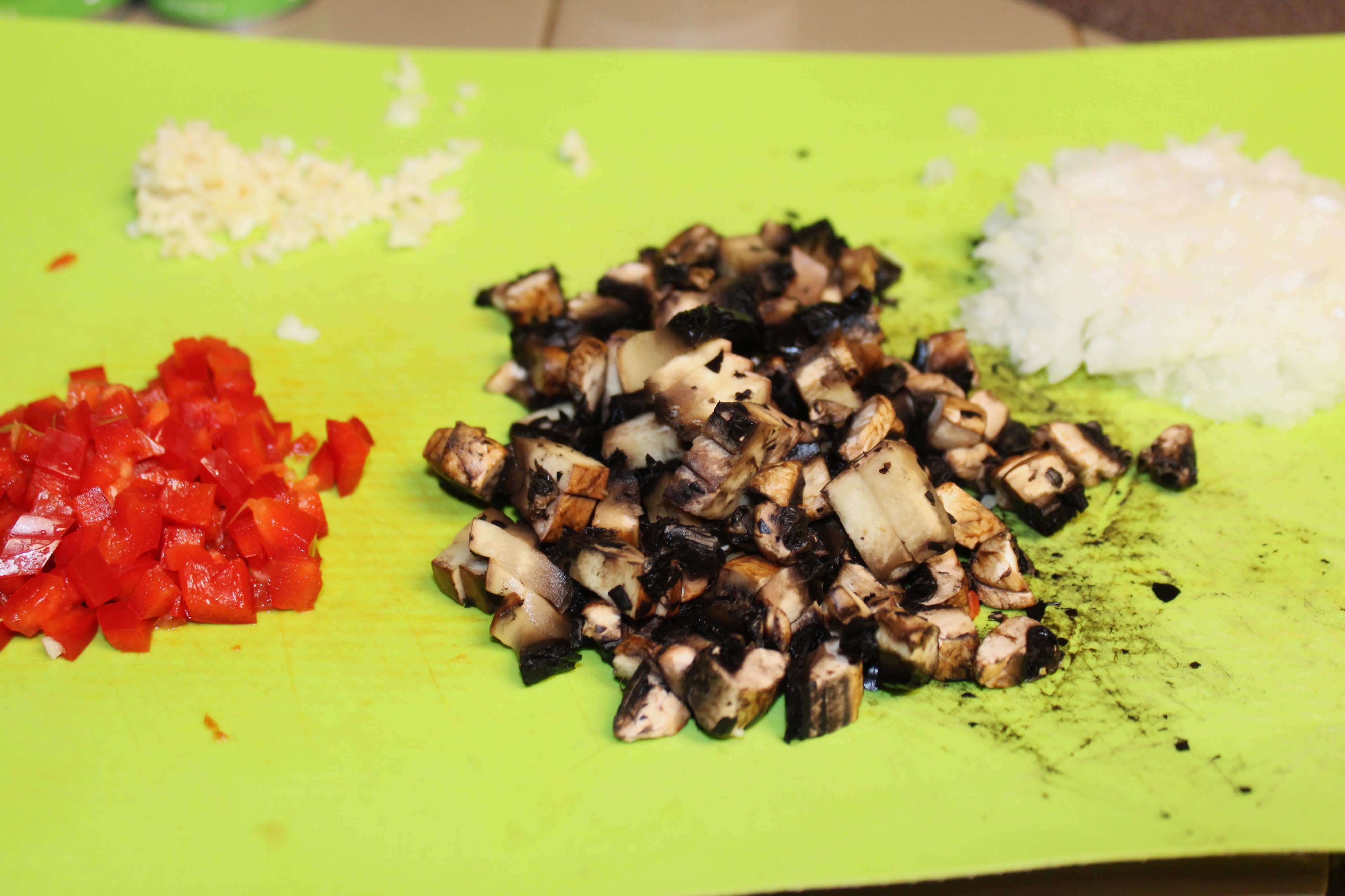 Peel and mince onion and garlic. Stem, core and dice bell pepper. Clean and slice mushroom.