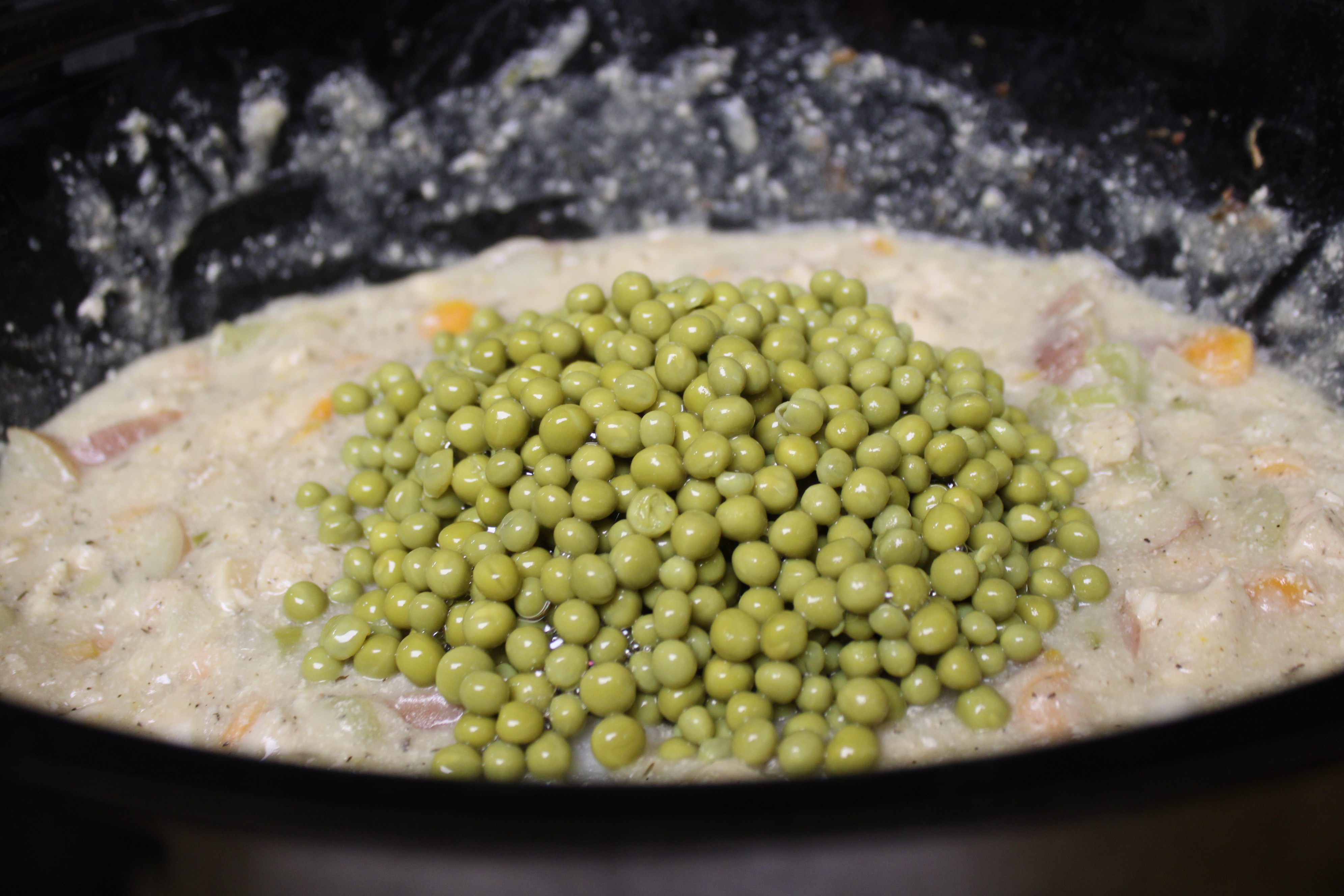 Cook until sauce begins to thicken and resembles the consistency of stew, about 10 minutes. Taste and adjust seasoning with salt and pepper as desired. Add gravy roux to the slow cooker. Add young peas, simmer another 10 minutes.