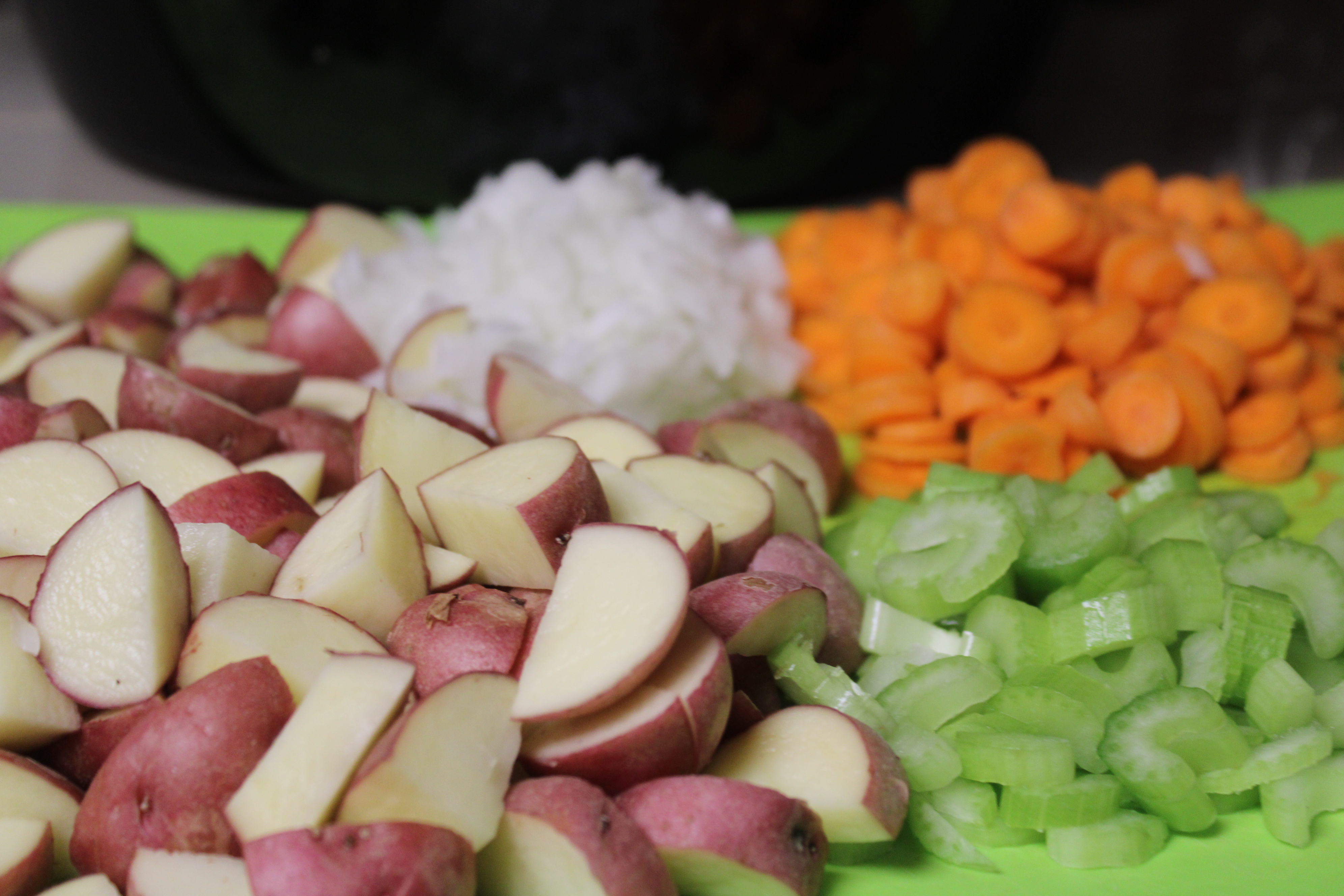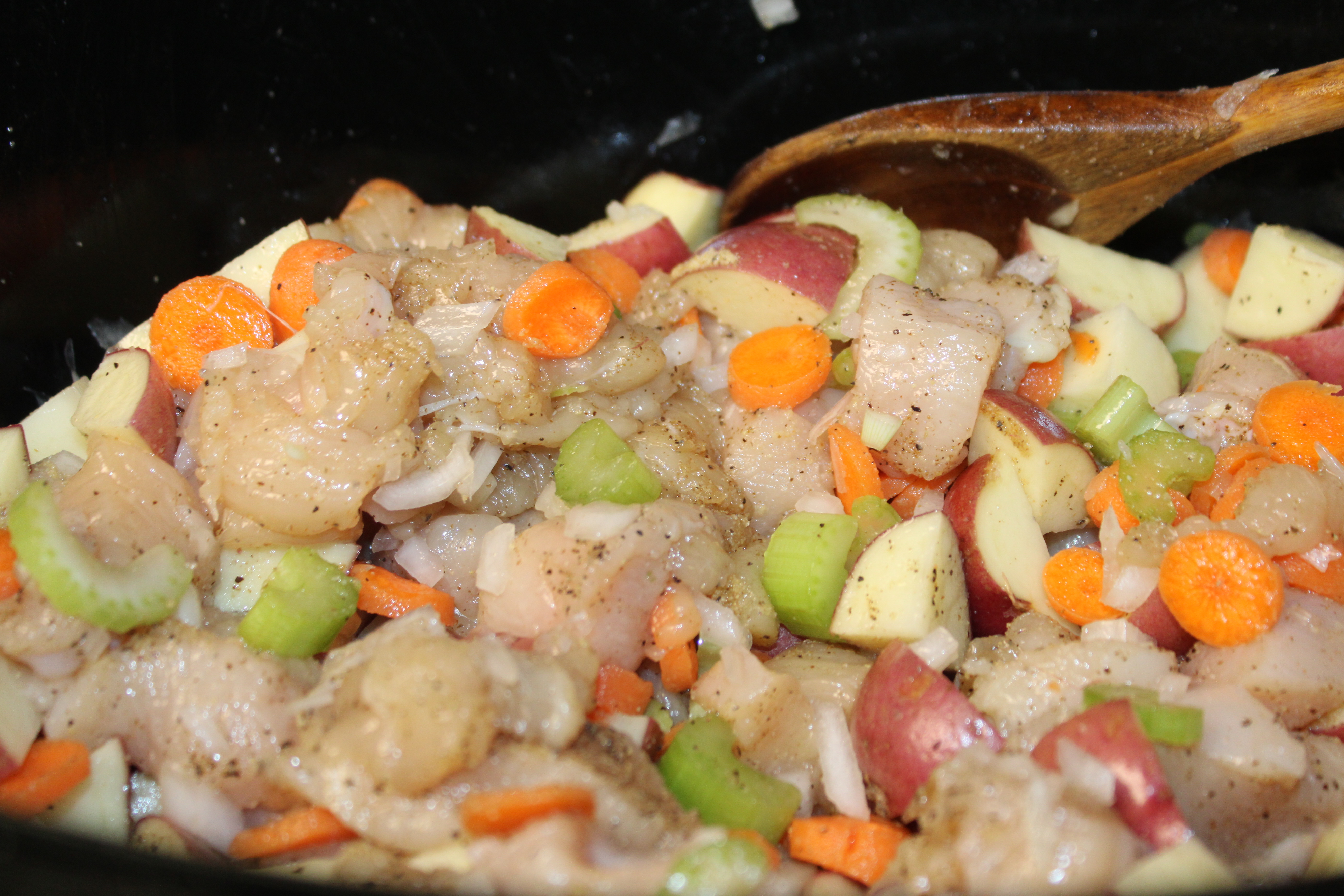 Cut chicken into cubes. Clean and quarter potatoes. Chop carrots and celery. Peel and dice onions. Place cued chicken and prepared vegetables into the slow cooker. Season with garlic powder, celery salt and black pepper. Add 2 cups of chicken stock over the top. Place lid n place, set to HIGH and let simmer for 3 hours.