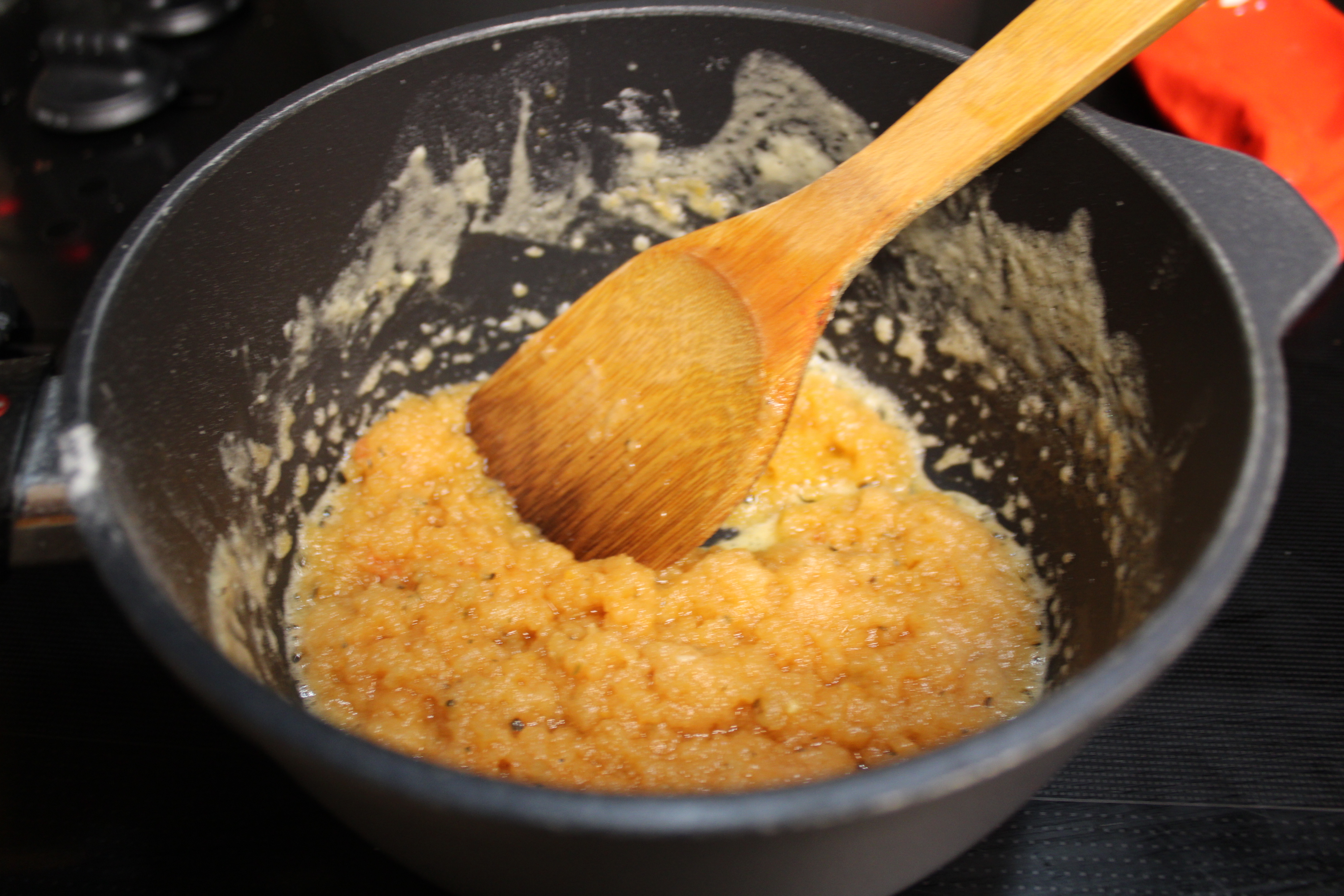 While the soup simmers, prepare a roux. In a medium saucepan over low heat melt the butter. Add the flour and cook, stirring constantly, until the roux becomes a golden color, about 3 minutes.