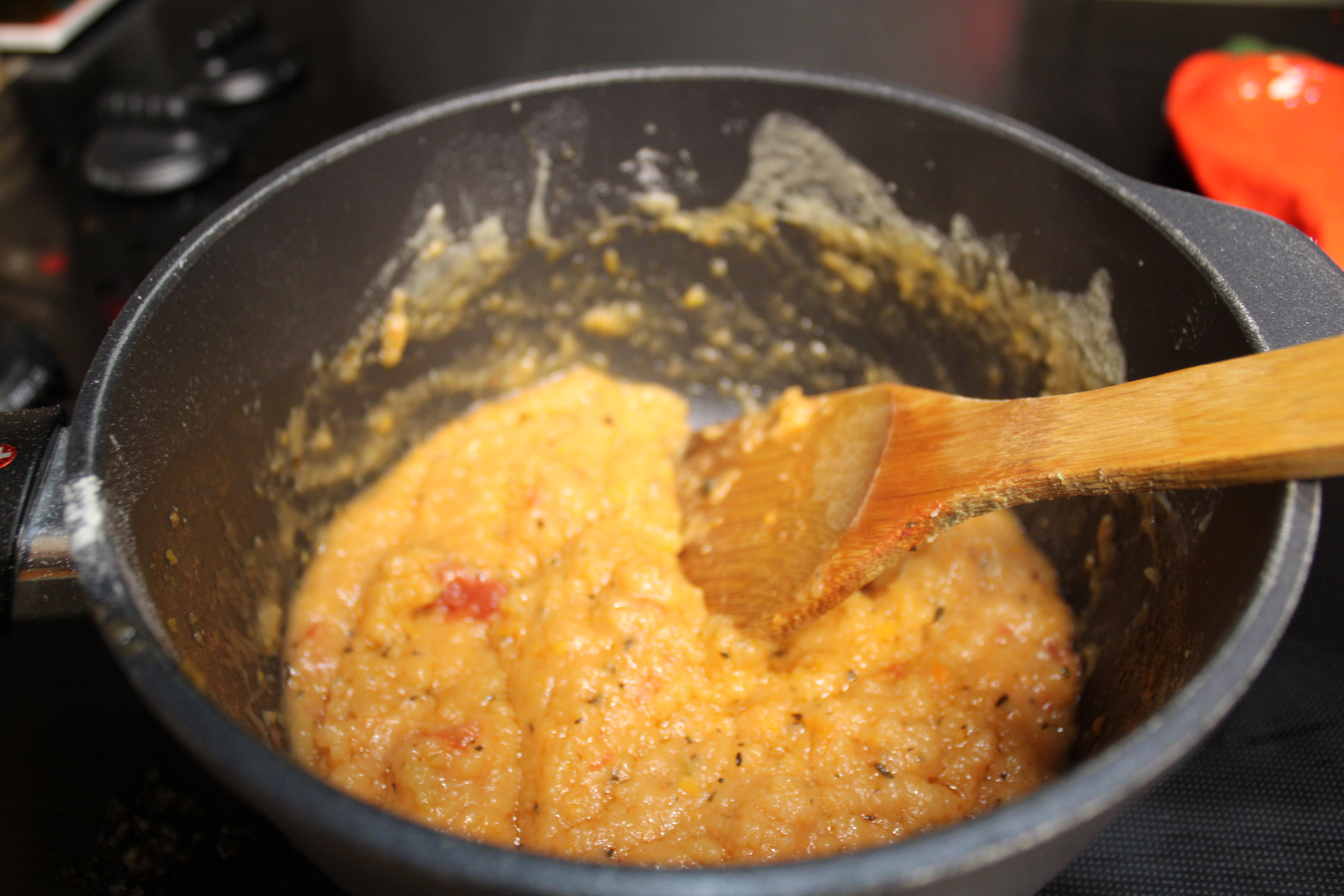 Whisking constantly, slowly add a ladle-full of the hot soup liquid to the roux. Whisk until smooth and bubbly. Add a second ladle-full of liquid and stir again until smooth. Add a final ladle-full of hot liquid and stir until smooth.