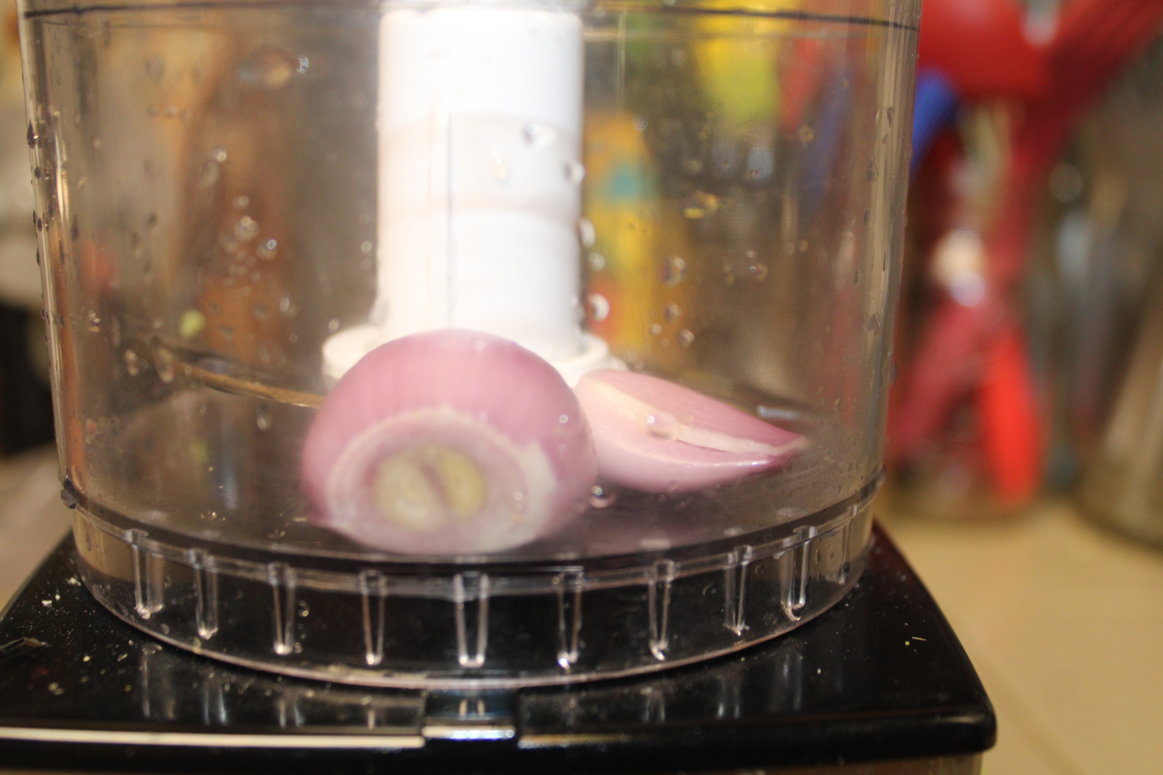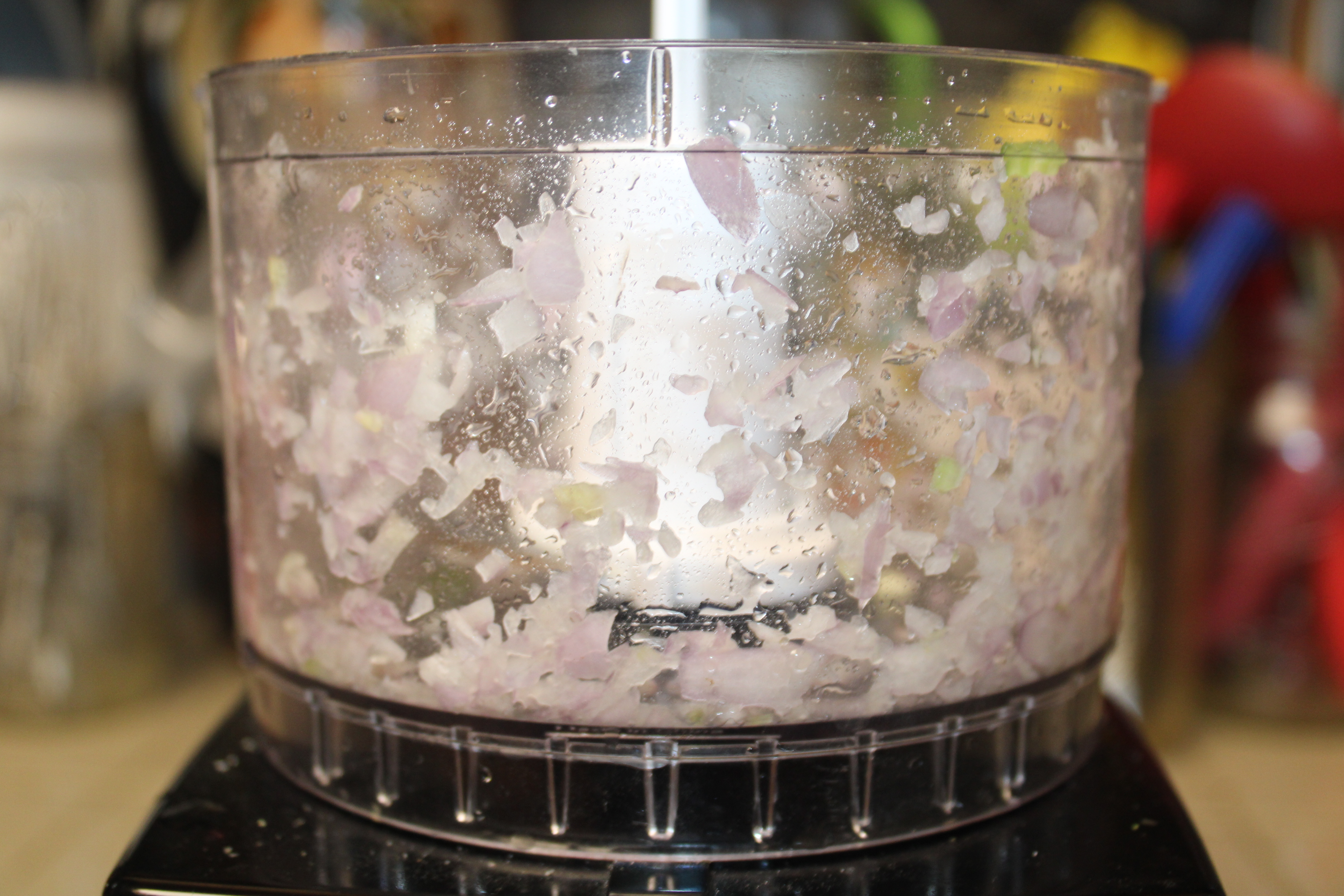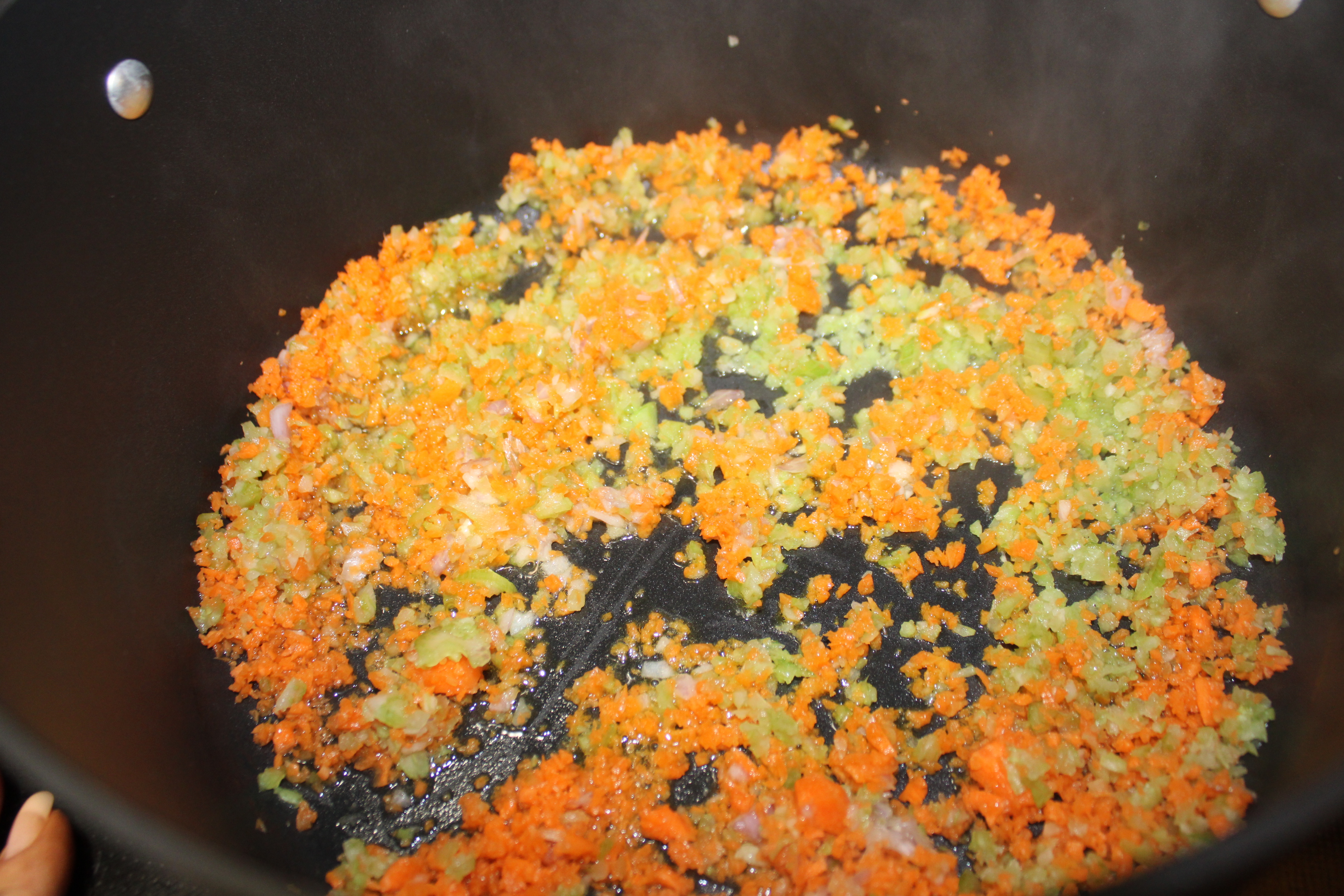 Trim and dice celery. Finely dice carrots. Peel and finely dice shallots. Set vegetables aside.