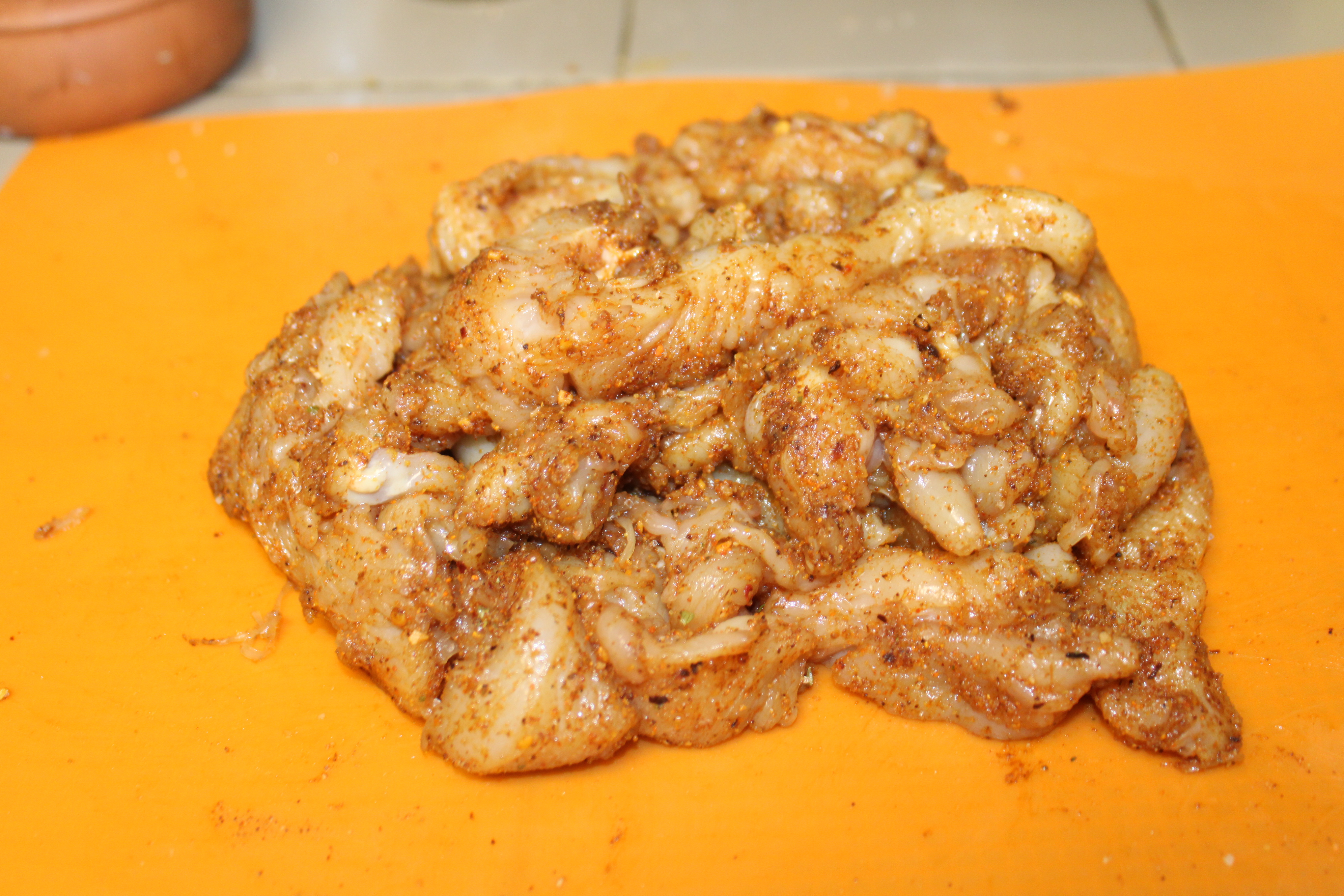 Cut chicken into strips. Sprinkle half of the seasoning blend over the chicken strips. Toss to coat. Sprinkle remaining seasoning ix over the chicken a second time, making sure the chicken is well-coated.