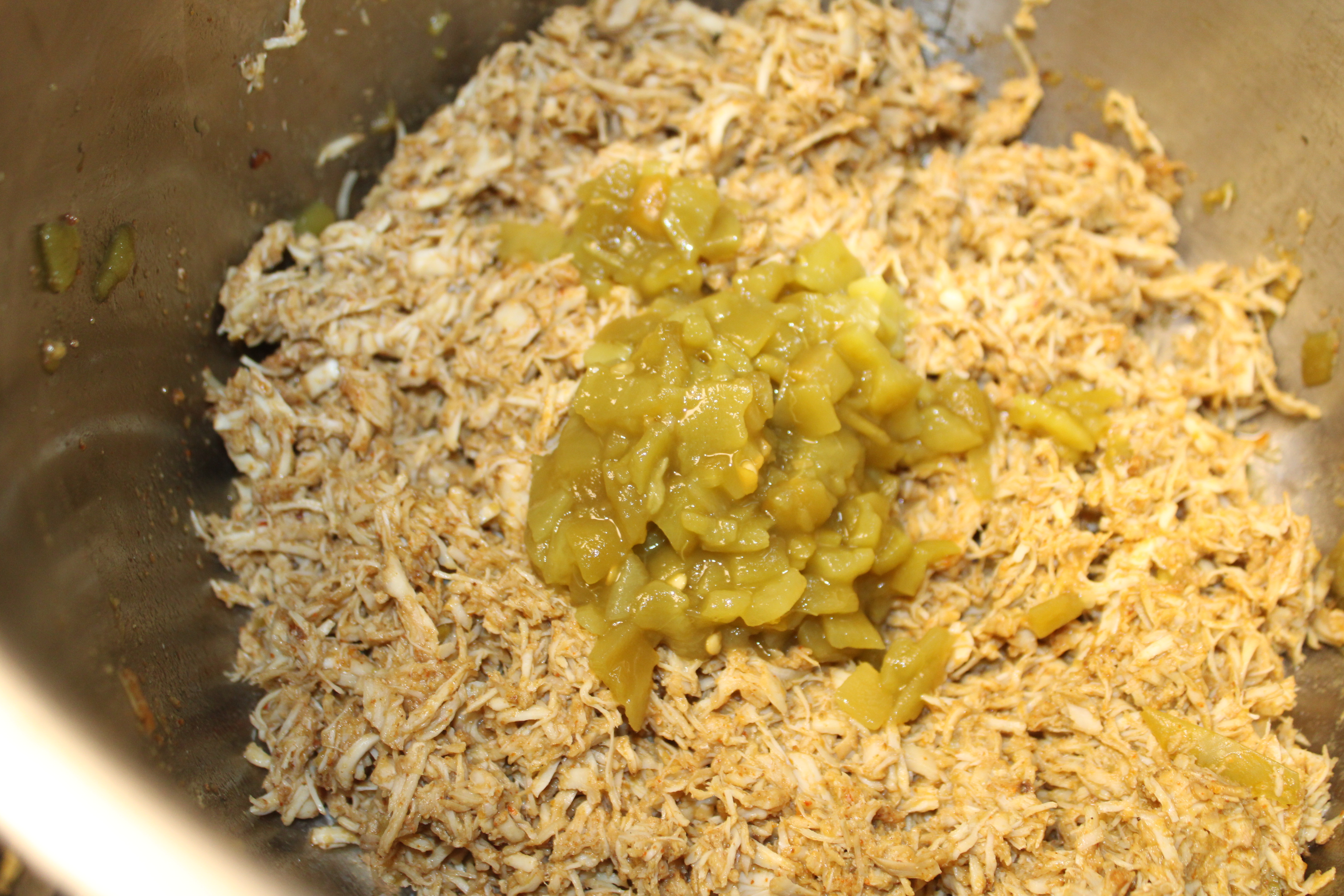 Shred chicken strips with the two fork method or use a hand-held blender. Once shredded, add remaining can of green chilies, toss to blend. Keep shredded chicken warm until ready to use.