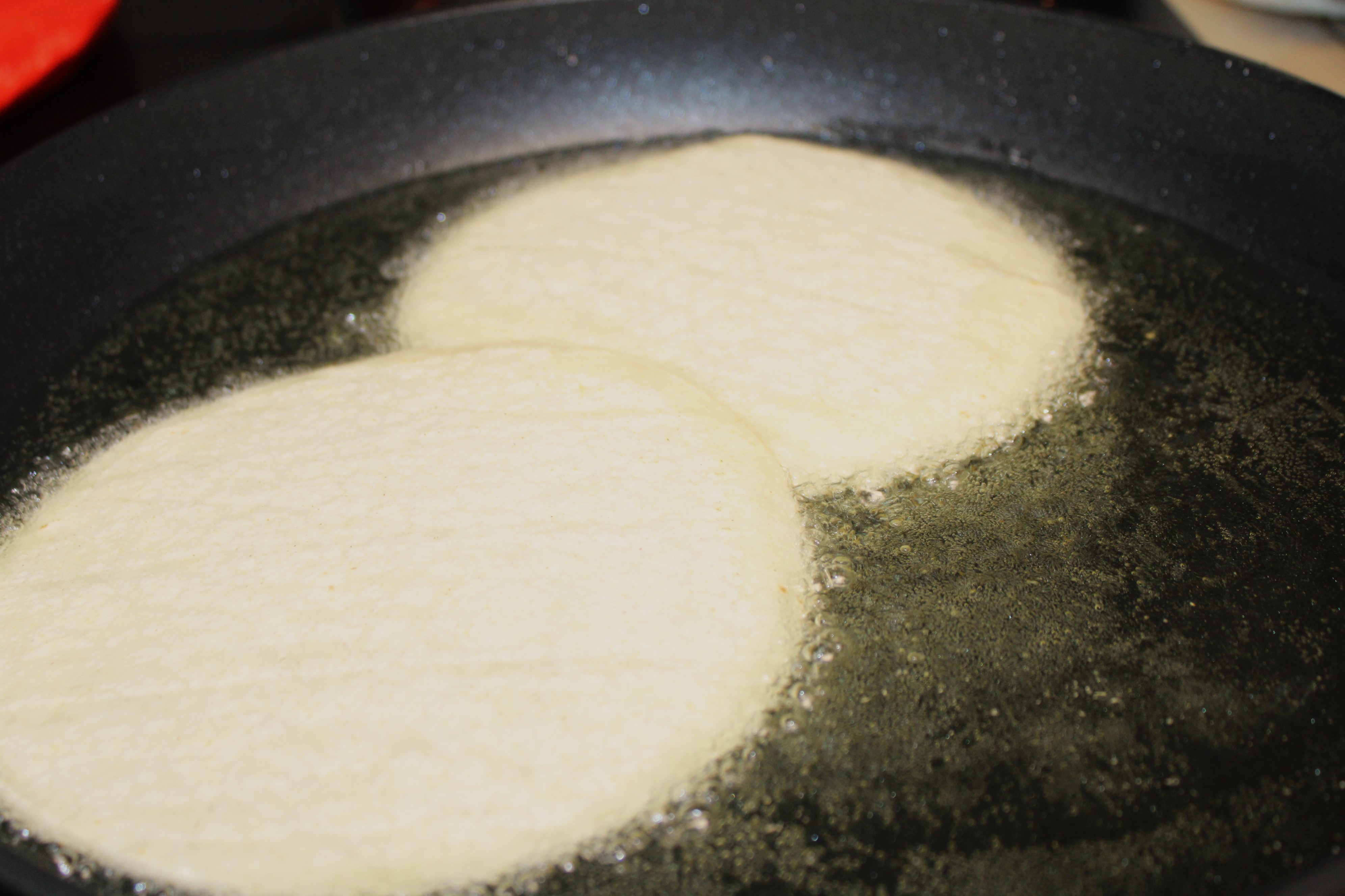 Heat vegetable oil in a large skillet. Dip corner of tortilla in the oil. Once it begins to hiss and bubble, the oil is hot. Quick fry the tortollas less than a minute per side or less, just enoough to crisp the edge while the tortilla remains soft. Keep tortillas warm