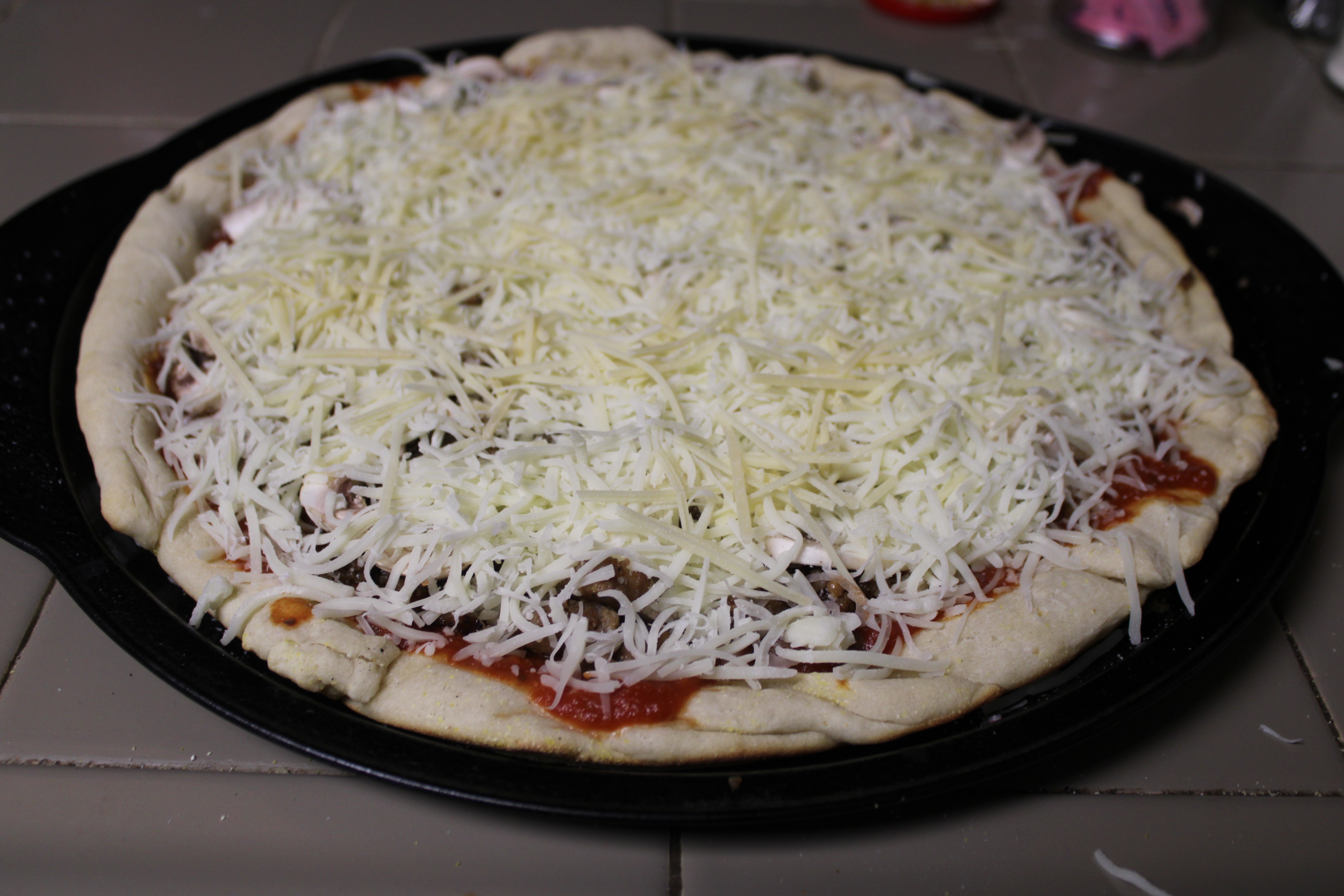 Spread pizza sauce evenly over the crust. Top sauce with the pepperoni, Italian Sausage, mushrooms and shallt. Sprinkle Mozzarella first, then Parmesan over the top of the pizza.