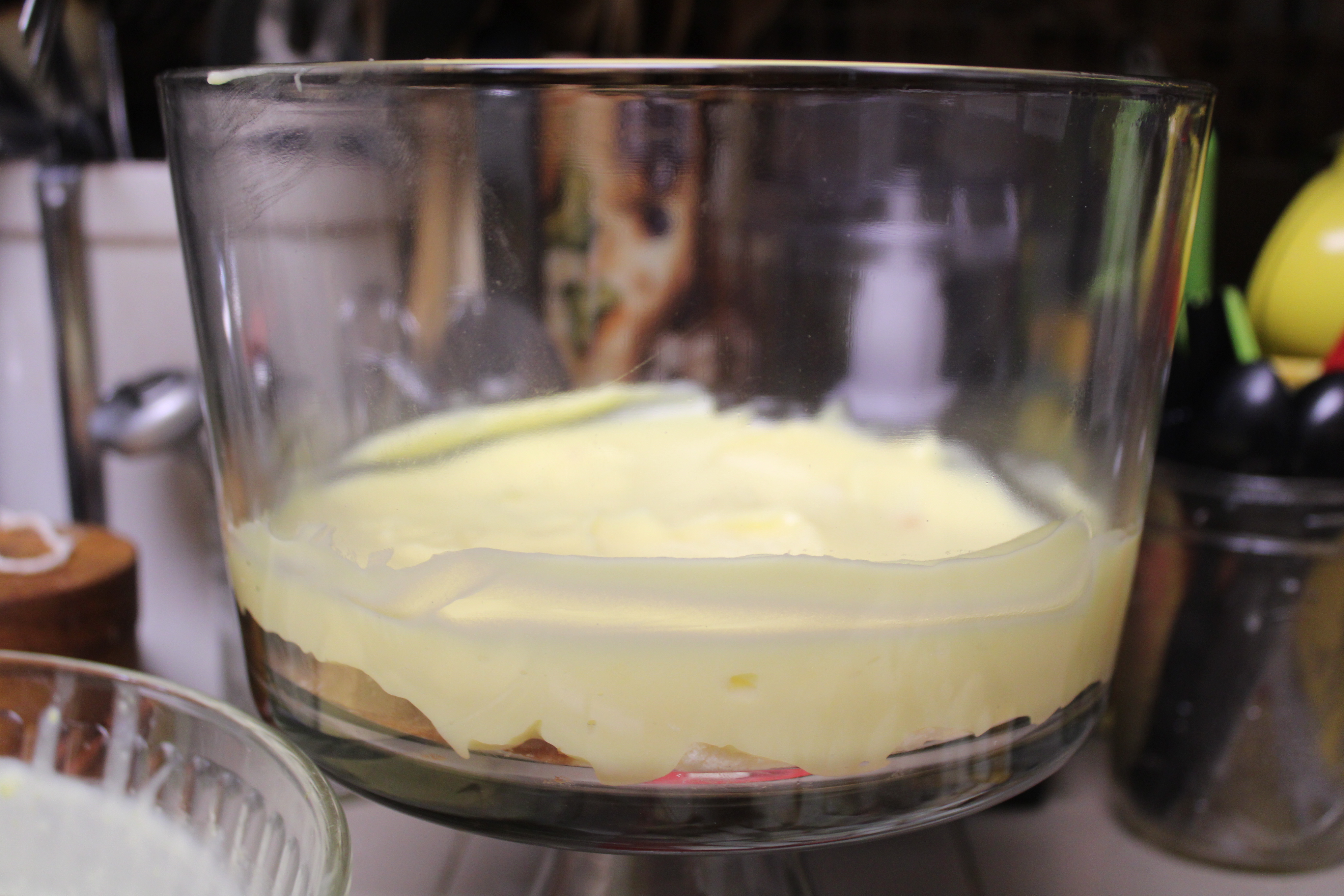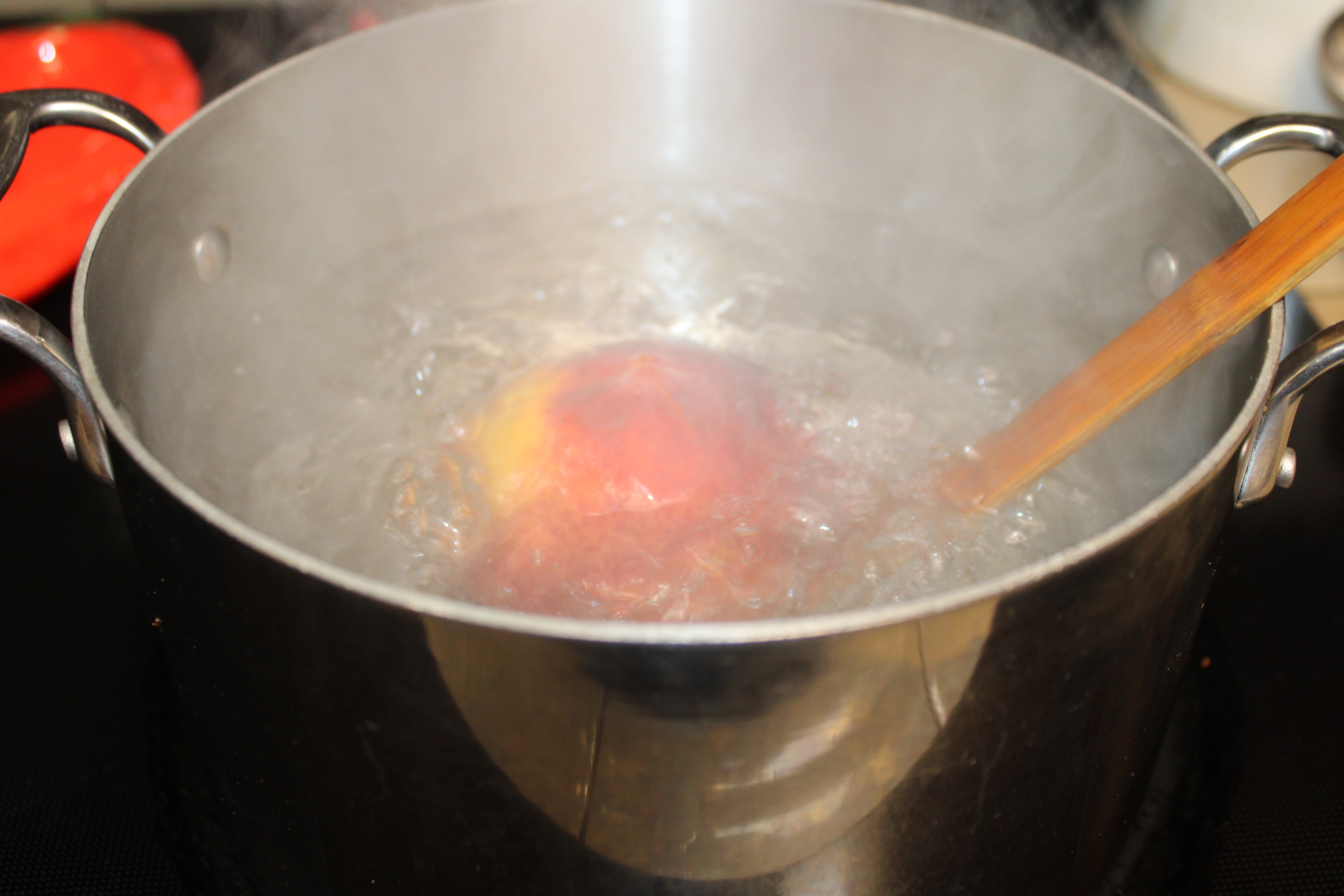 Bring a pot of water to a boil. Score the bottom of each peach then blanch for just a minute to loosen the skin. Peel peaches, slice into wedges. Use a circle the same size as the top of the trifle dish. Select the prettiest peach slices, arrange on the cirlce. Dice remaining peaches, set aside.
