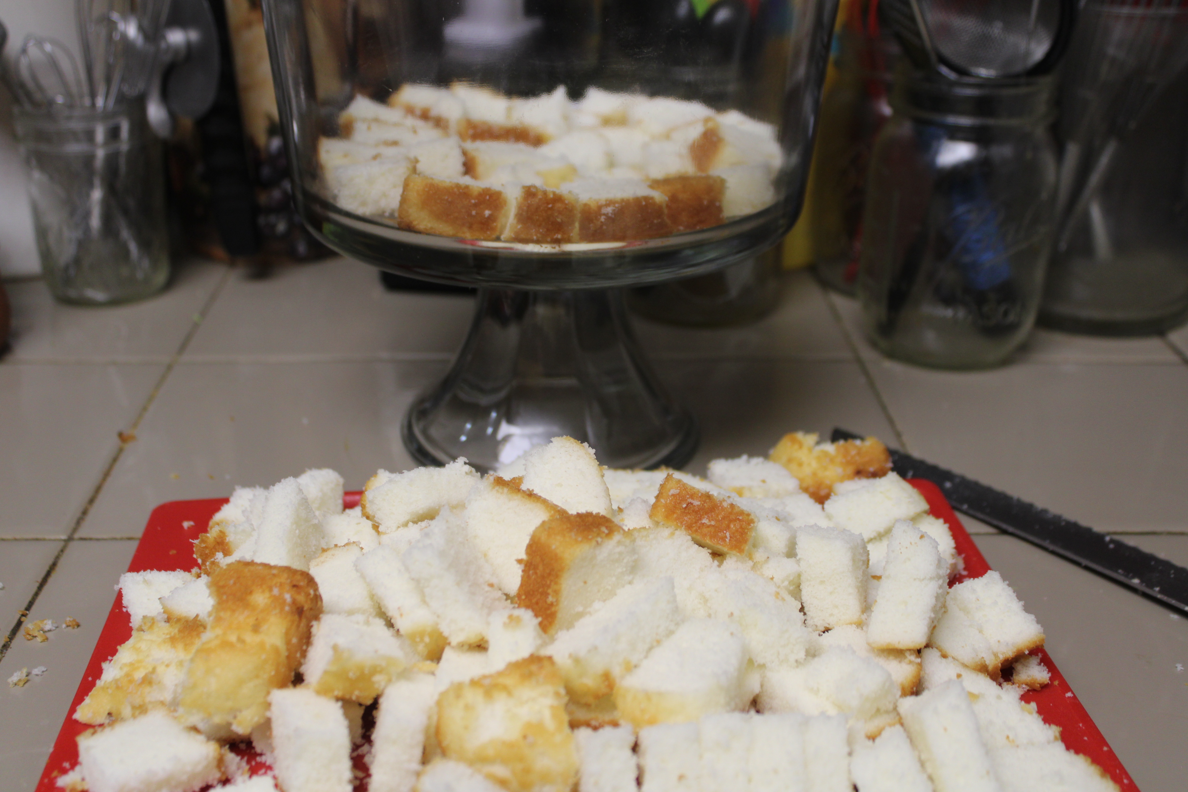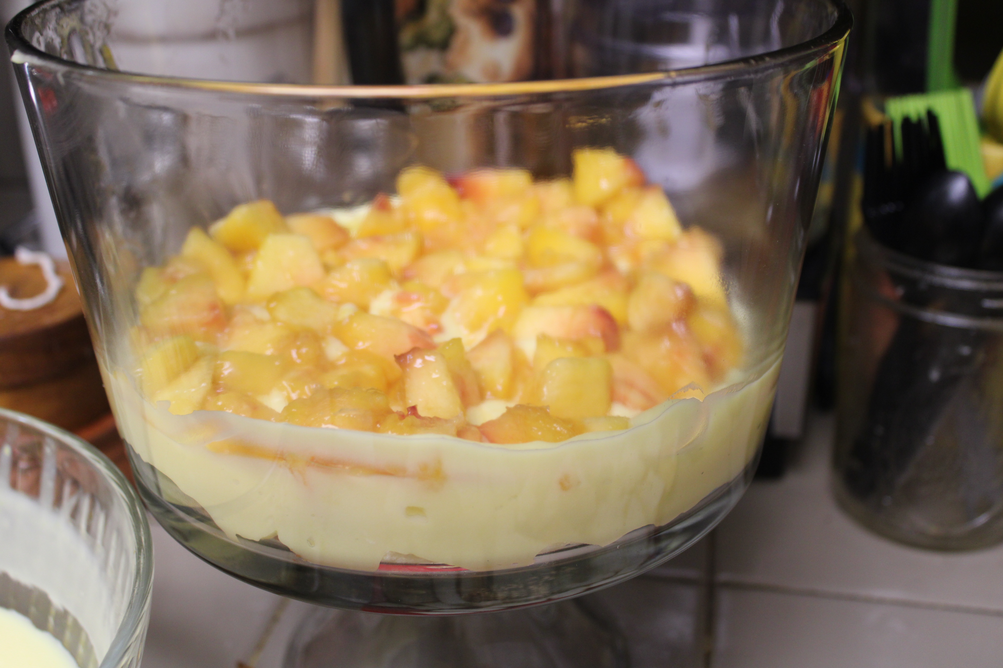 Cut cake into cubes. Layer the bottom of a trifle dish with a quarter of cake. Top cake with a third of pudding, then a third of diced peaches. Repeat cake, pudding, peaches. Begin the final layer with remaining cake.