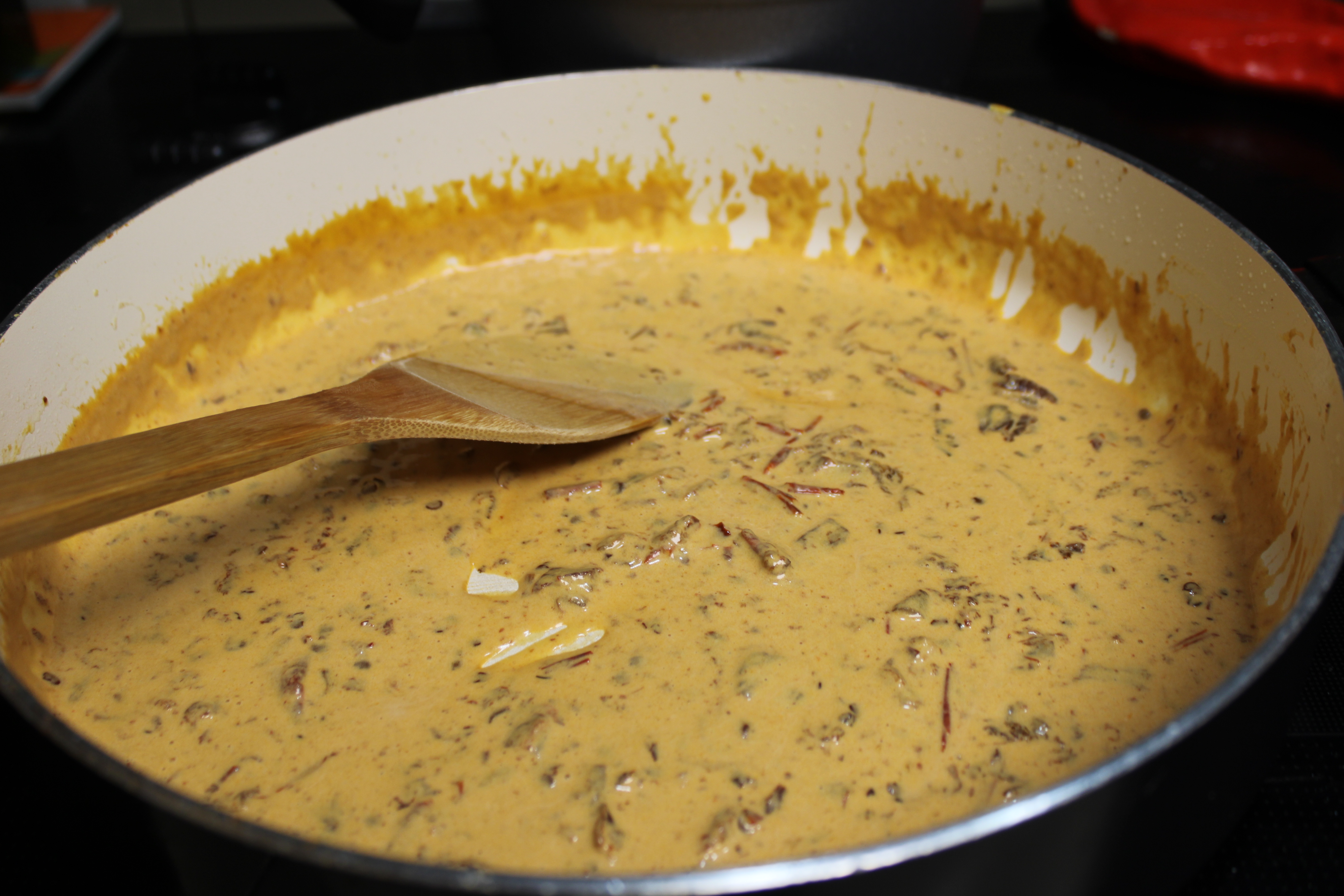 Remove from heat, add remaining butter, one tablespoon at a time. Thin cream sauce slightly with Chicken Stock if necessary to create a thick yet silky sauce. Taste, elevate heat as desired with Scorpion Pepper Sauce. Warm tortillas for serving.