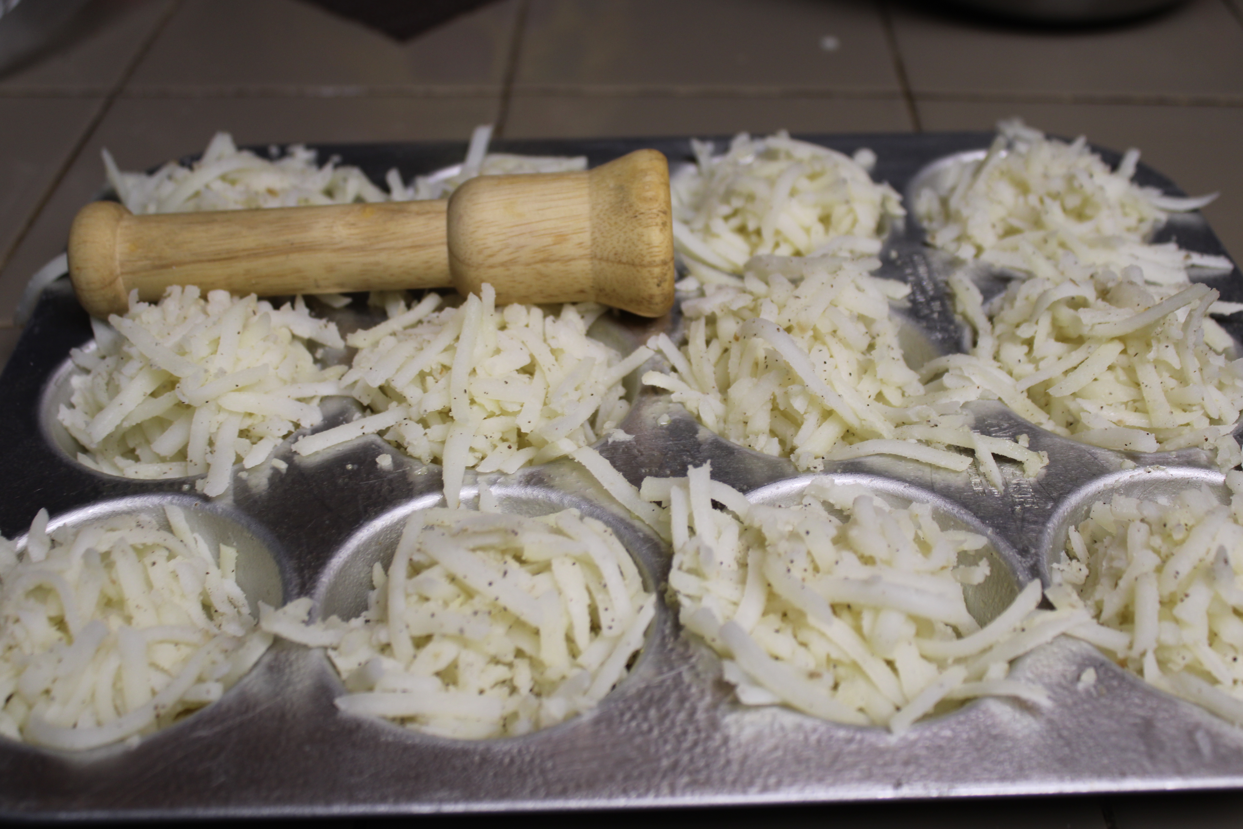 Press about 1/4 cup shredded potato mixture into the bottom and up the sides of each prepared muffin cup. Place in the heated oven to bake for about 18 minutes, until soft and beginning to brown. Remove from oven, tap a second time to redefine well in center. Reduce oven to 400-degrees, set tin aside.