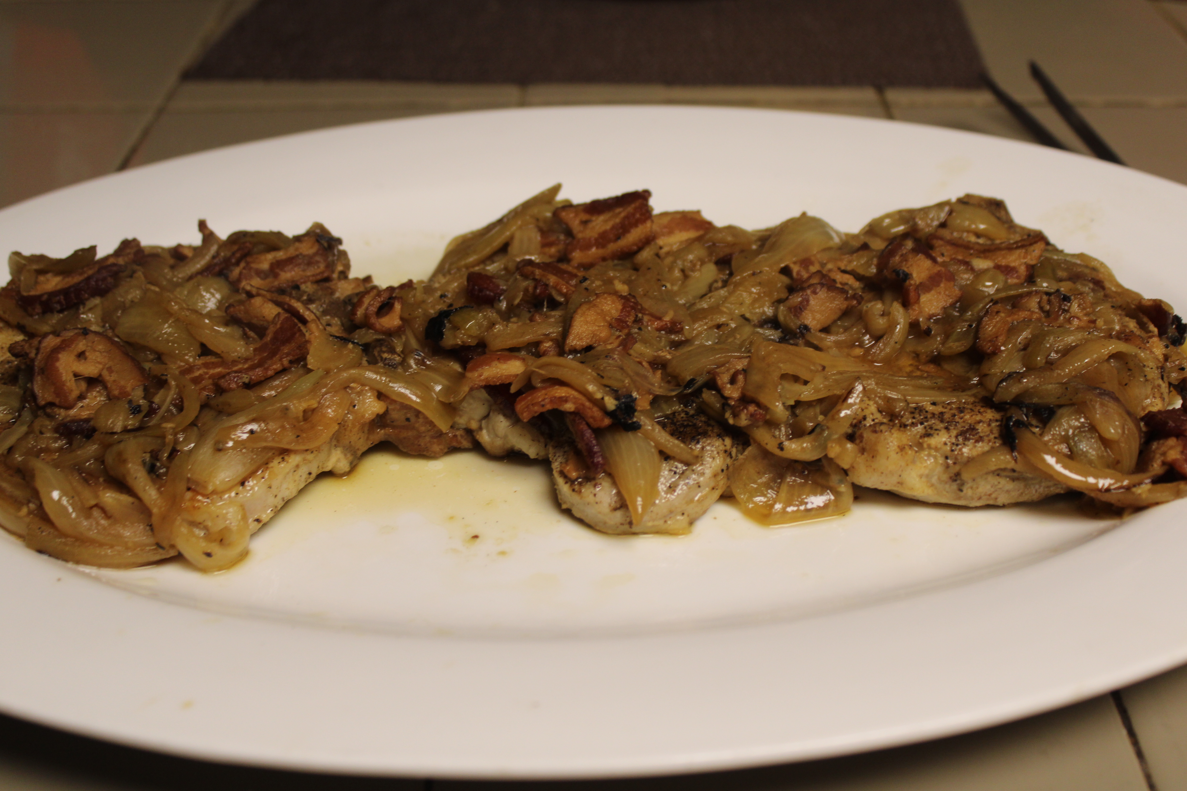 Remove pork chops, arrange on a large rimmed serving platter. Remove and discard bay leaves. With a large slotted spoon, remove onions and bacon from the liquid, spread out over the pork chops.