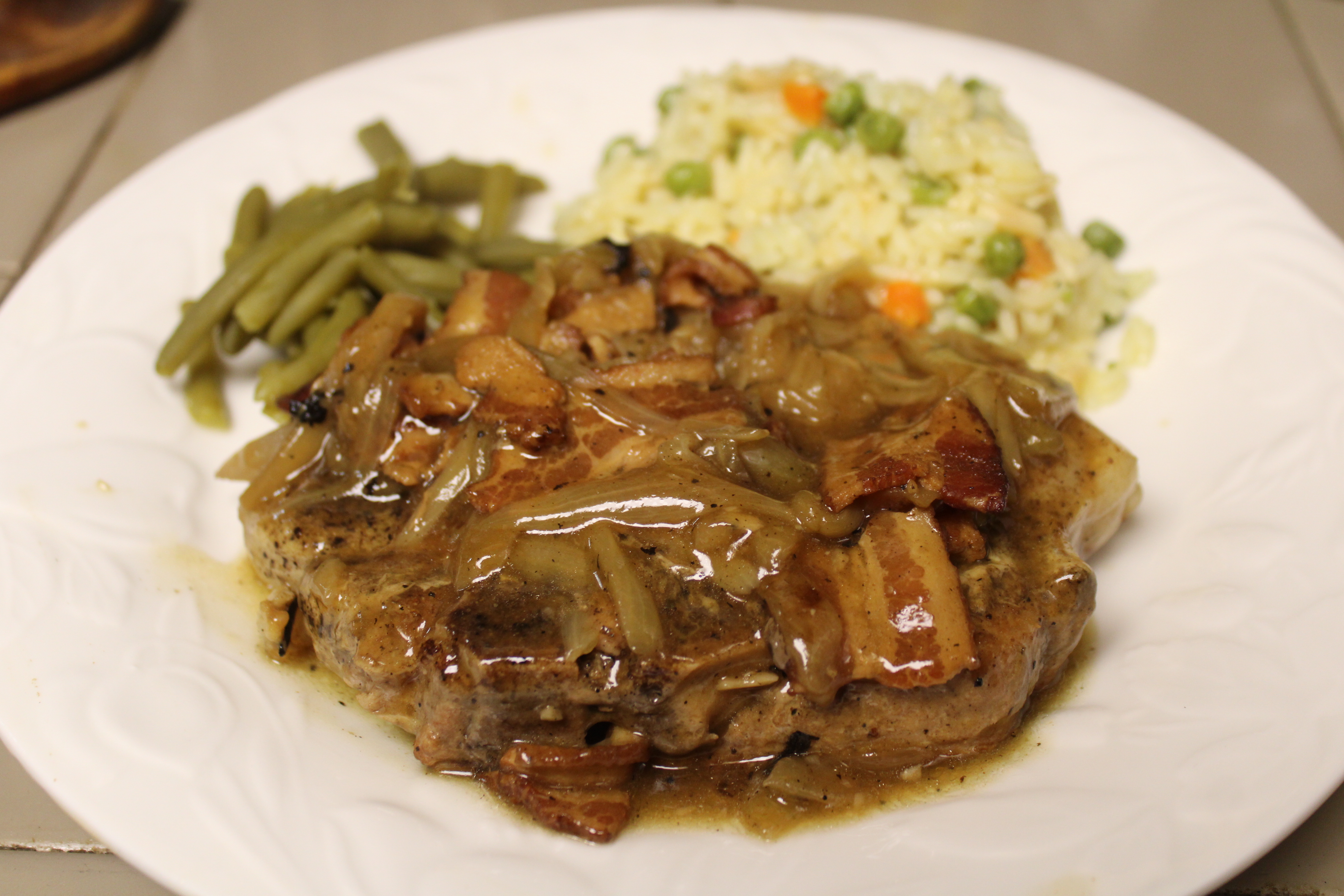 Fluffy Rice Pilaf and Green Beans go well as delicious sides to an effortlessly amazing Pork Chop Supper.