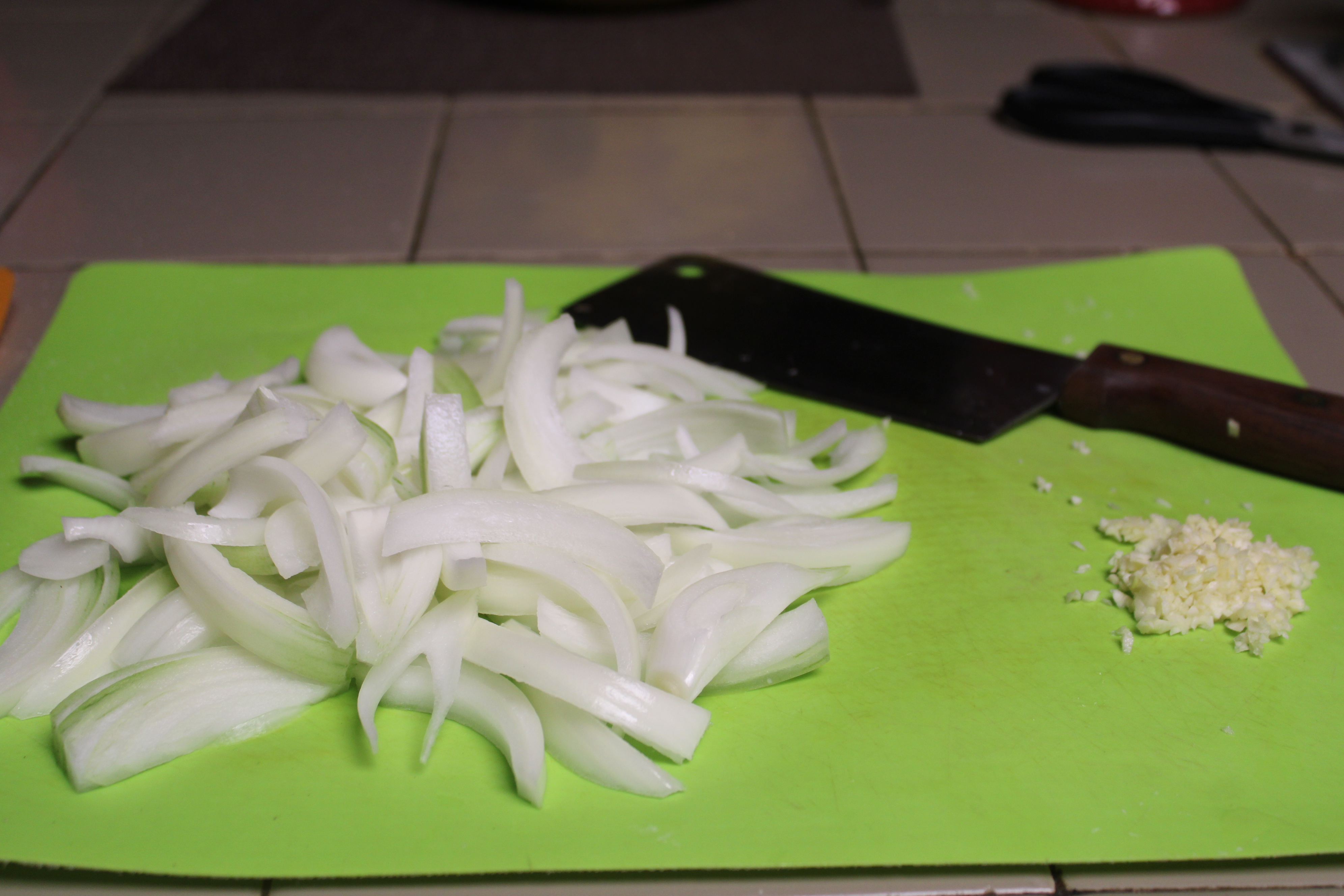 Peel and slice onion from root to tip into slivered slices. Peel and finely mince garlic cloves.