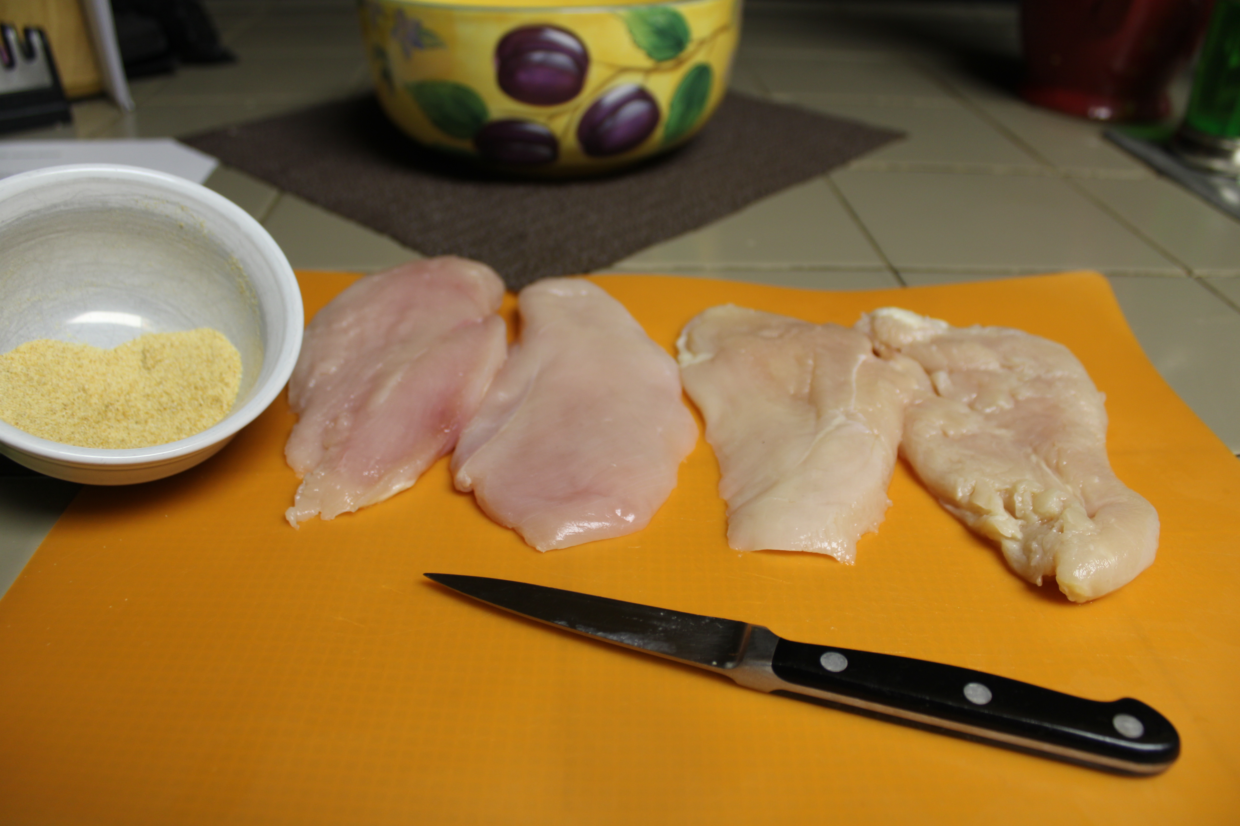 Cut breasts lengthwise into 4 thin breasts. Pat dry with paper towels, set aside. In a small bowl whisk together garlic powder, seasoning salt and onion powder. Sprinkle seasoning mix on one side of the chicken.