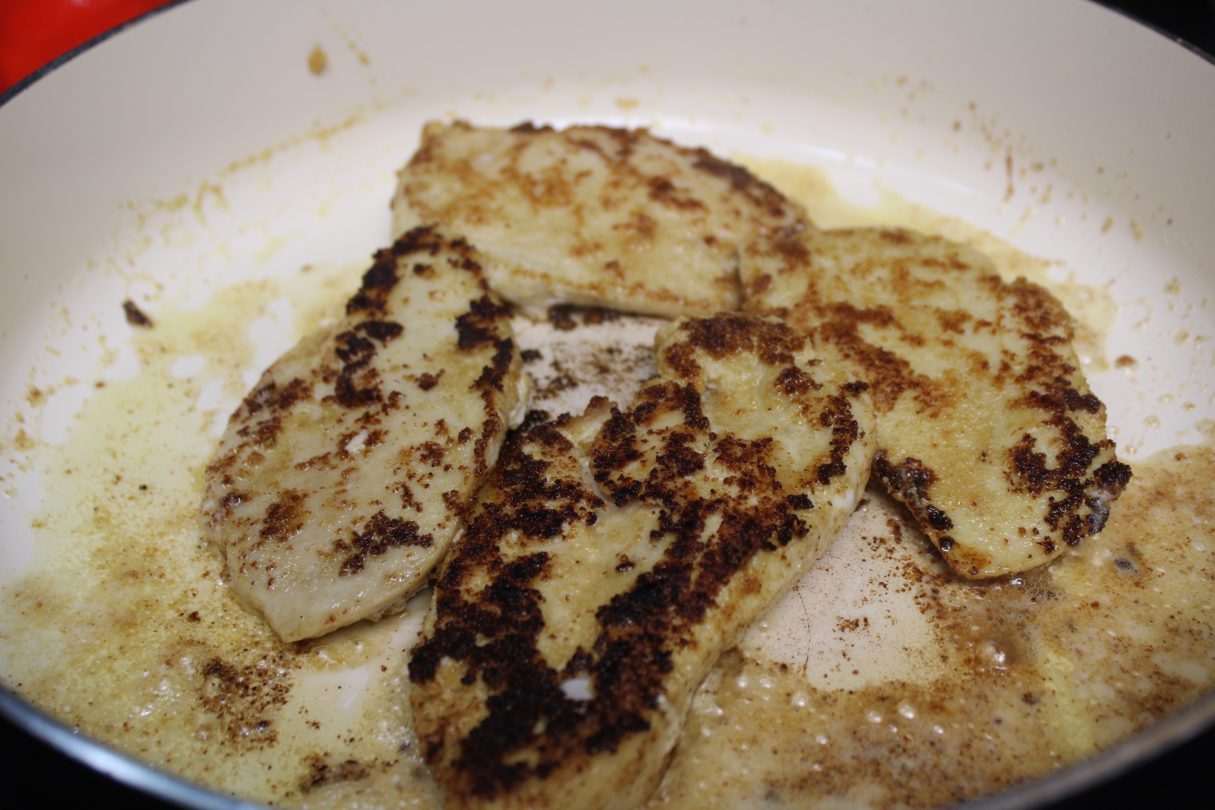 Deglaze the skillet with chicken stock, scraping up the browned bits from the bottom of the pan. Let simmer until slightly reduced. Remove from heat, whisk in remaining 2 tablespoons of butter. Drizzle pan sauce over the breasts and serve.
