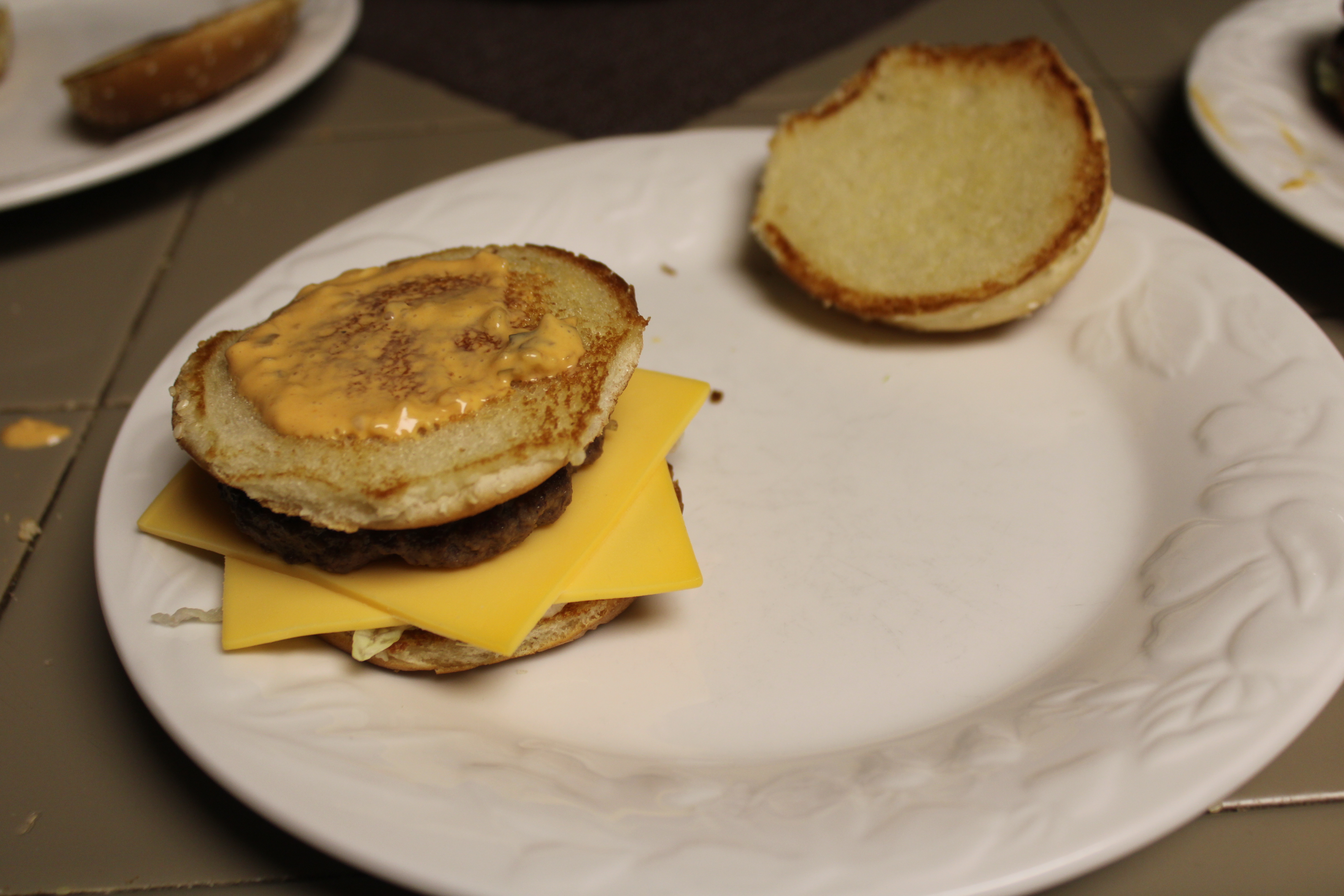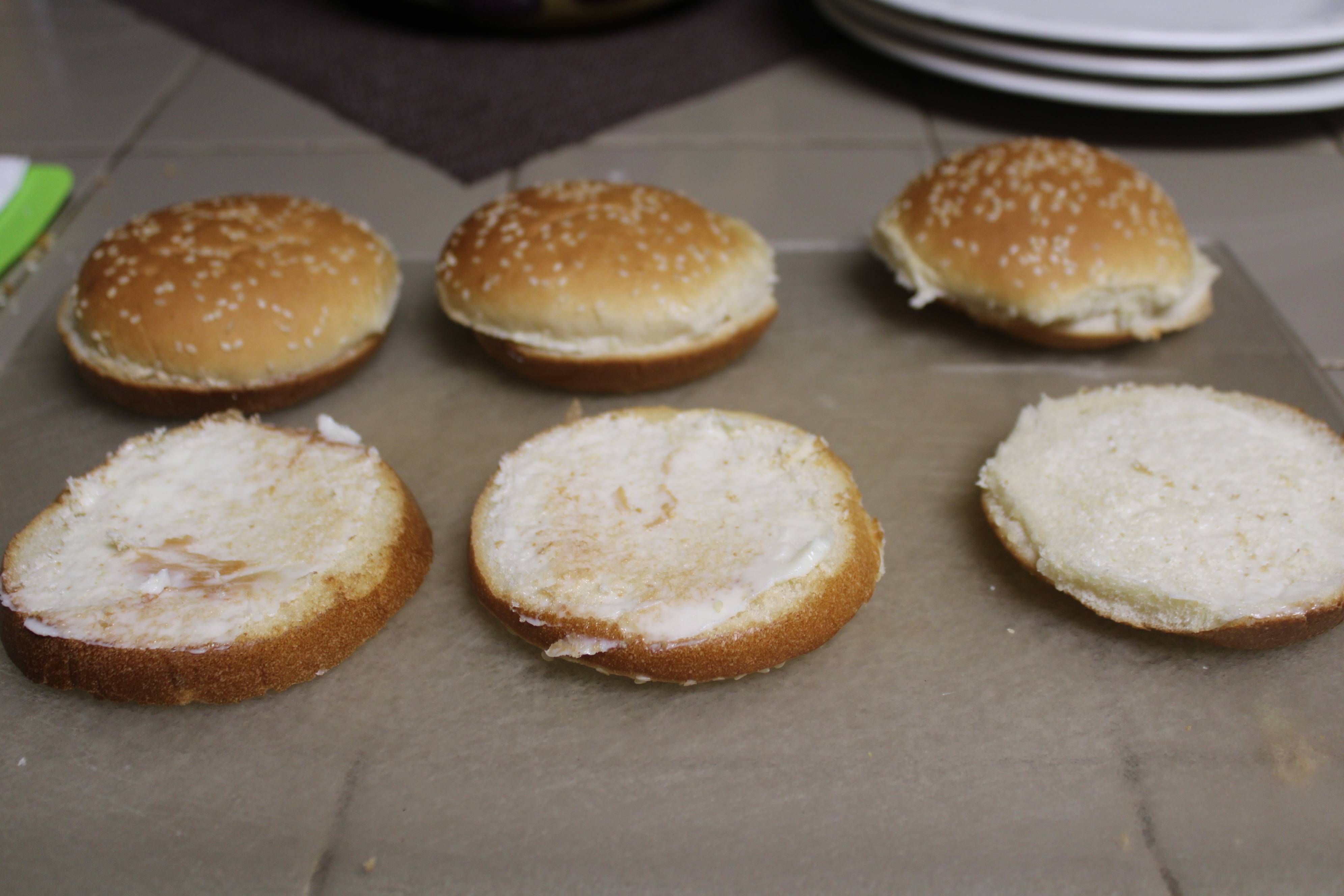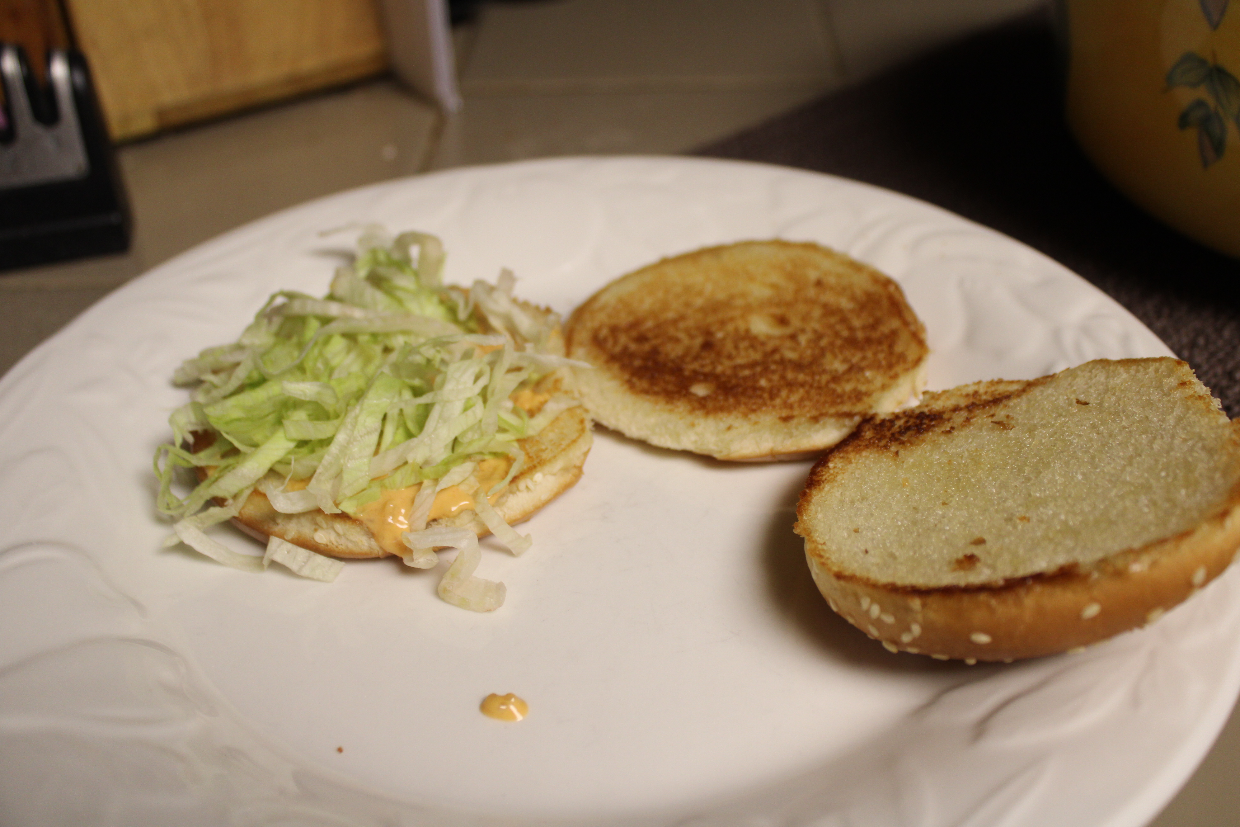 Stack about 4 or 5 lettuce leaves, roll tightly to create a cigar. Slice the rolled lettuce to create shredded leaves. Toss gently to separate. Set aside. With 4 hamburger bottoms, create the middle bun for a Big Mac by trimming the bottom, creating two sliced sides. Set aside.