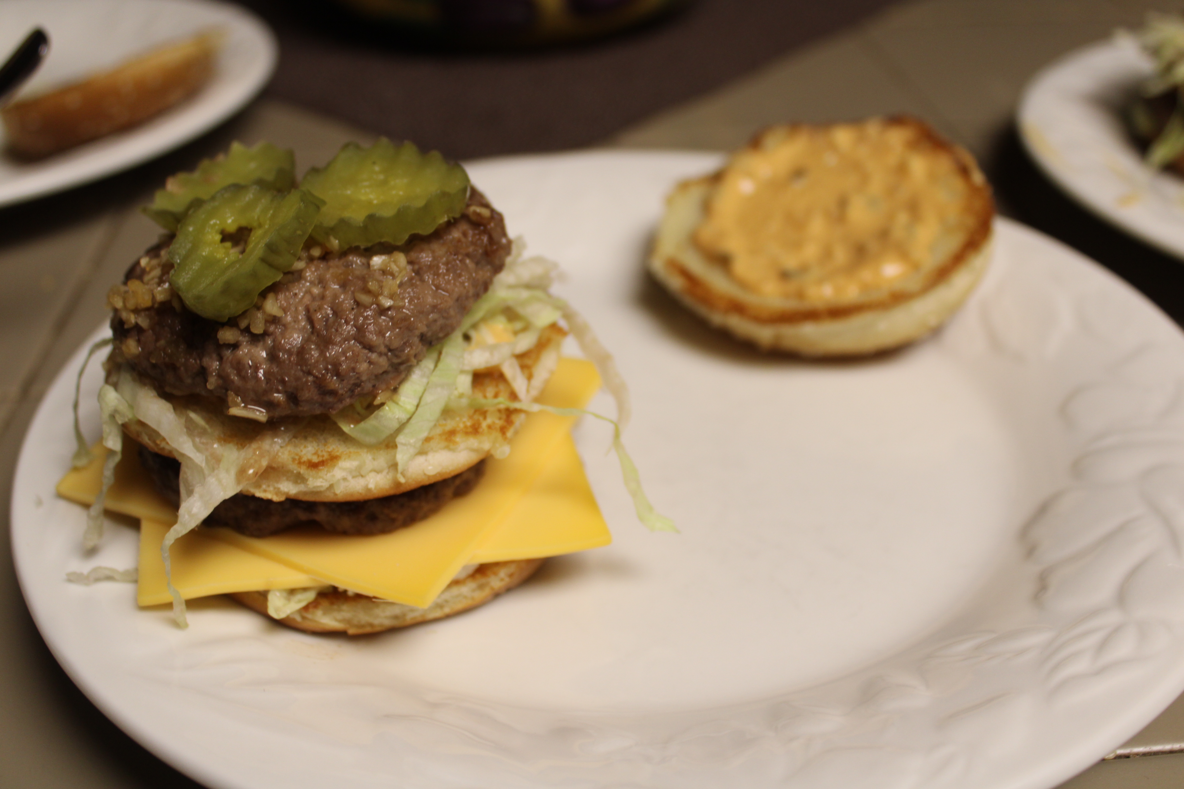 Place burger patties on the griddle and cook 2 minutes per side. Once cooked, scatter onion flakes on each patty along with salt and pepper to taste. Now it’s time to create the home-version signature Big Mac.