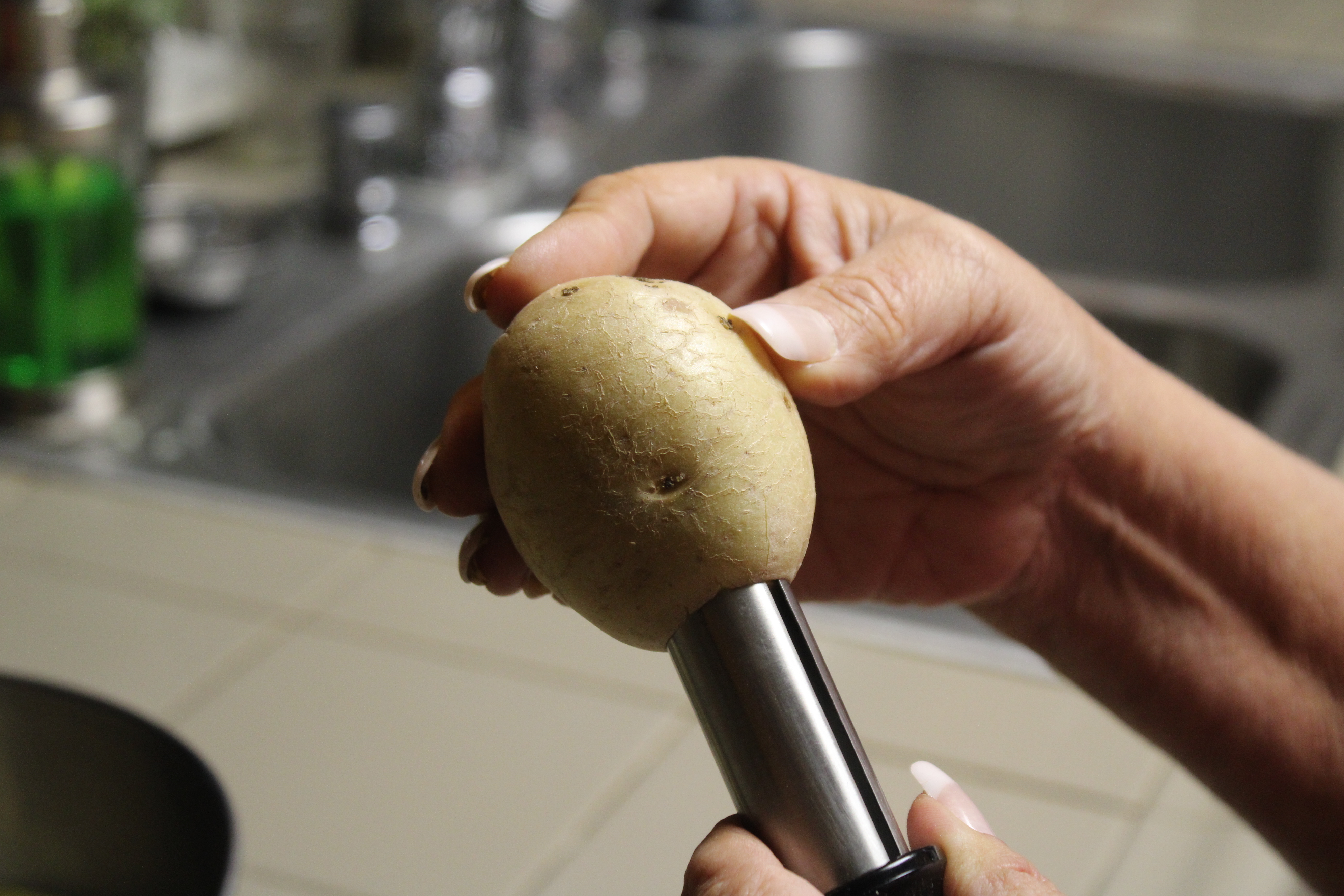 Scrub potatoes, pat dry. Insert an apple corer mid-way up inside the potatoes. With a sharp paring knife, cut around the top of the corer insert. Remove the bottom section of potato. Carefully withdraw the corer. The potato should now resemble a mushroom.