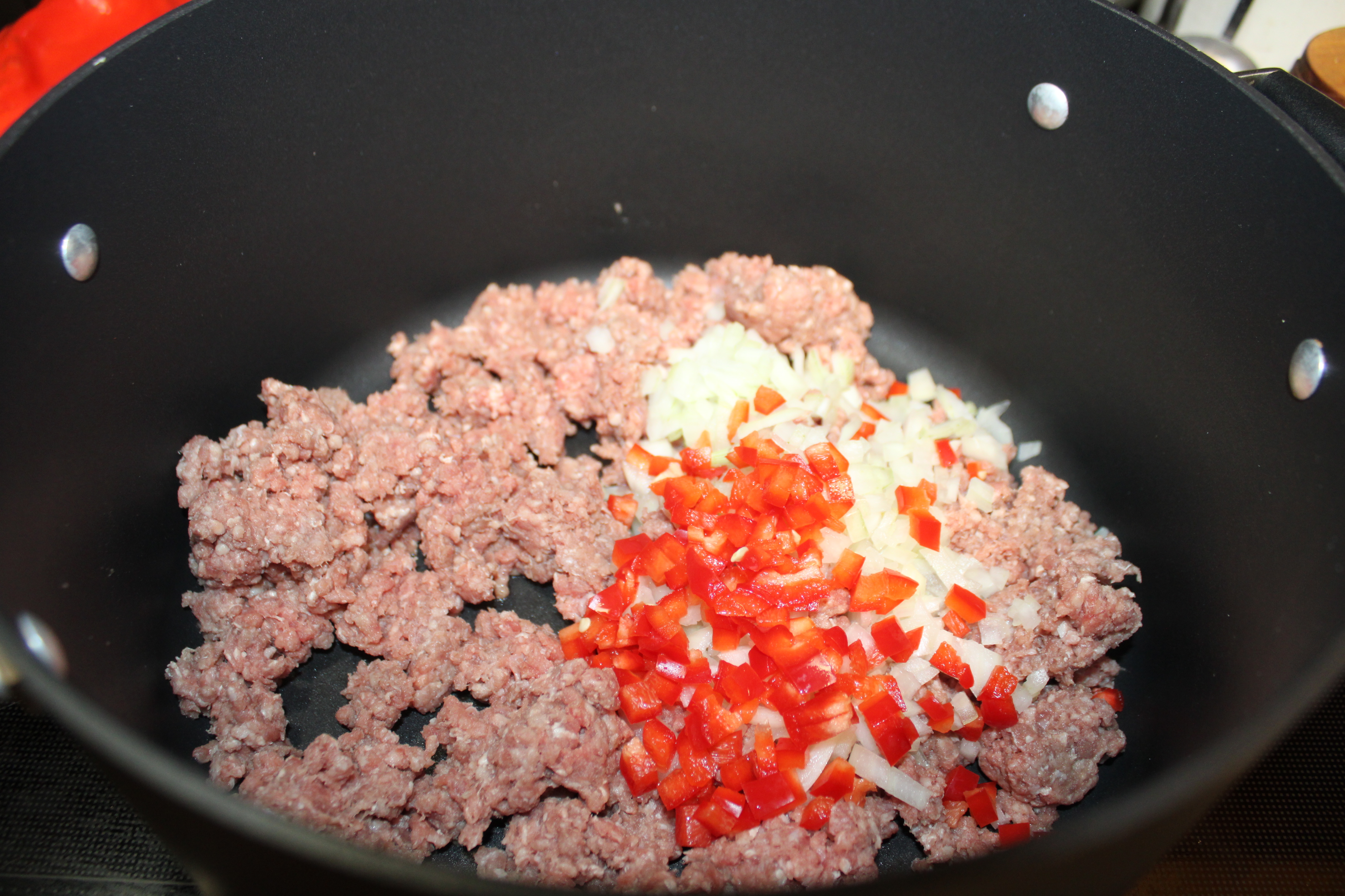 In a 4-quart Dutch oven, cook ground beef with diced onion and bell pepper over medium-high heat. Cook for about 10 minutes, until beef is cooked through, breaking meat into small pieces as it cooks. Drain well.
