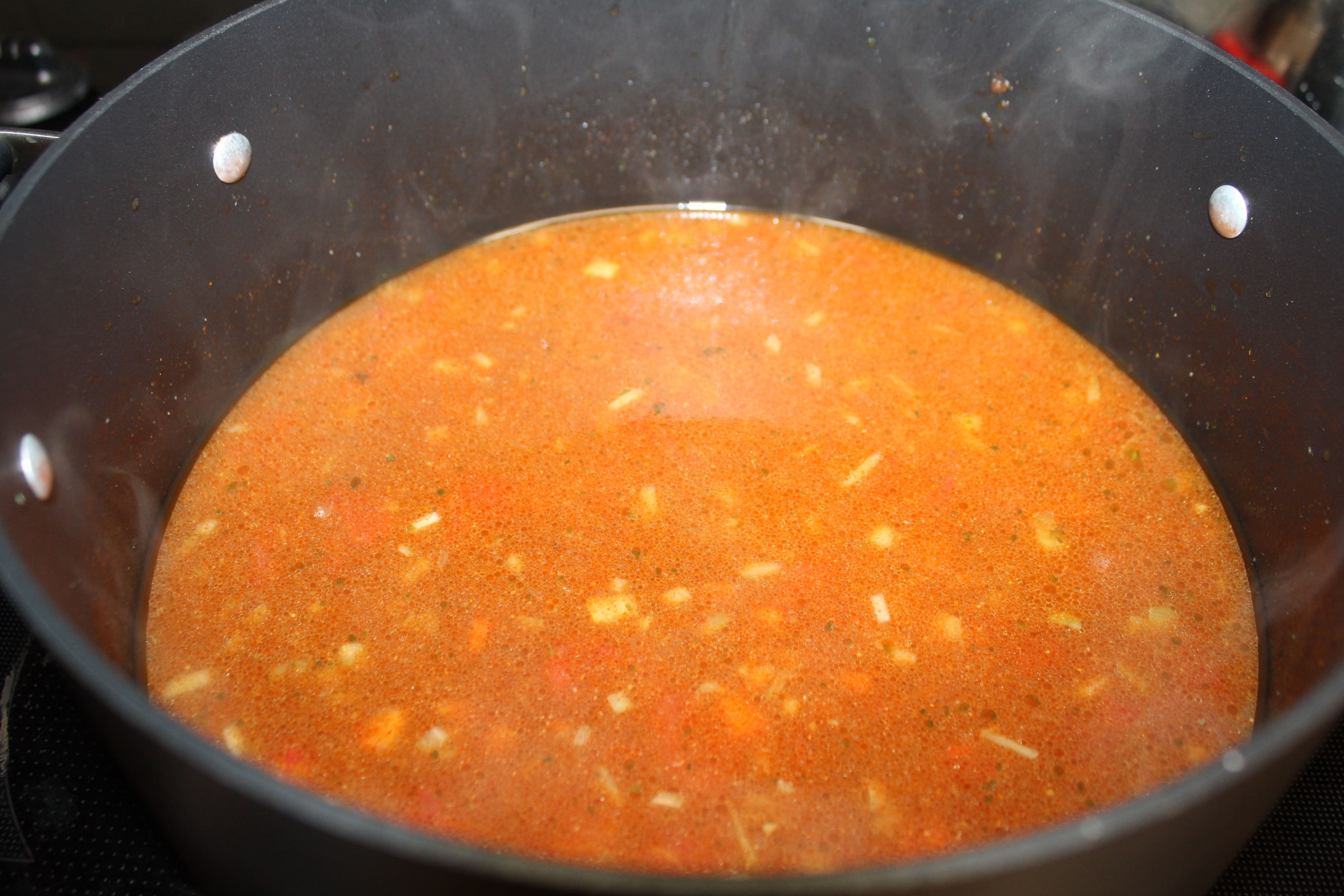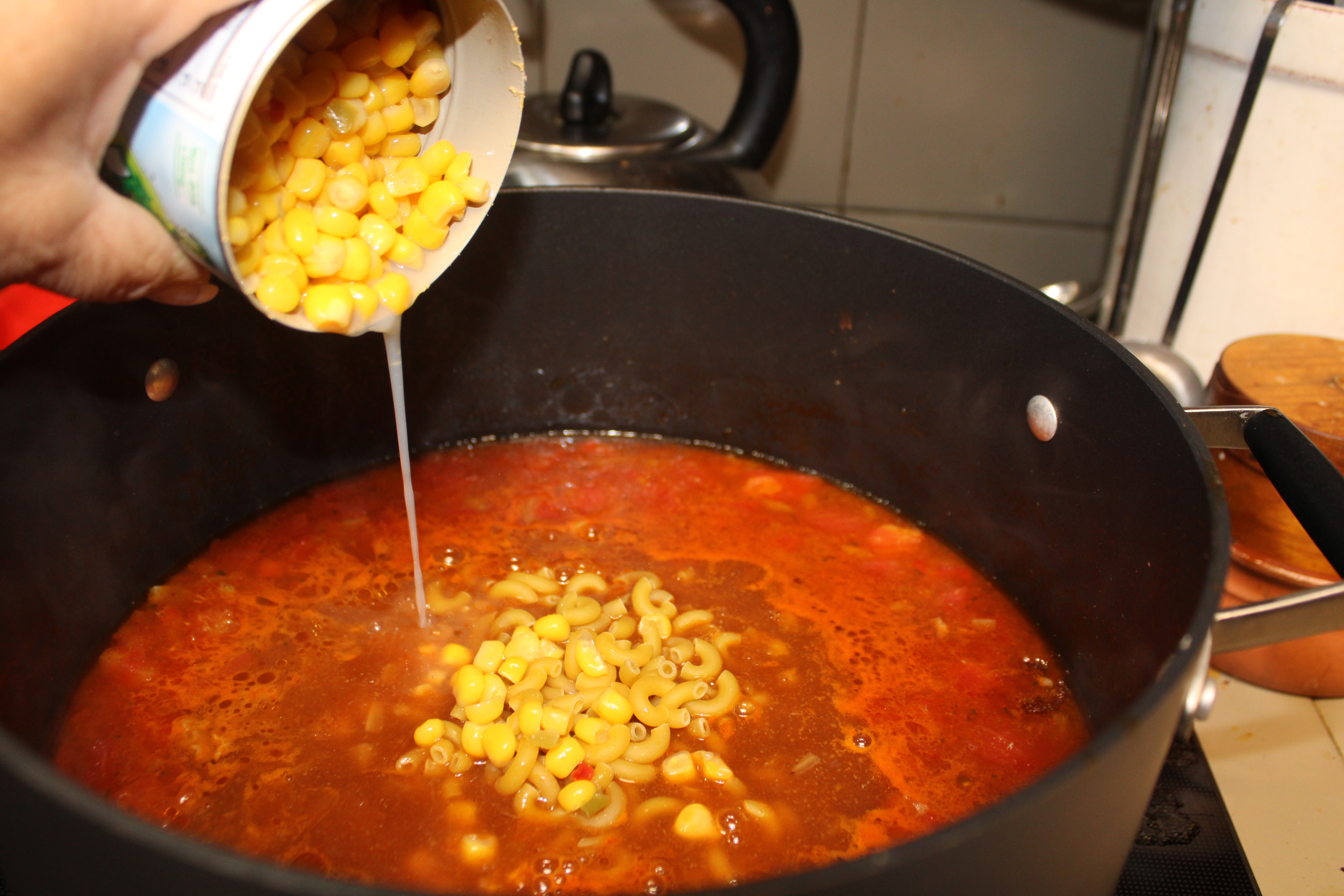 Reduce heat, cover and simmer for 5 minutes for flavors to mingle and marry. Stir in pasta and corn. Return to a boil. Cover, cook 10 minutes longer or until pasta has cooked through.