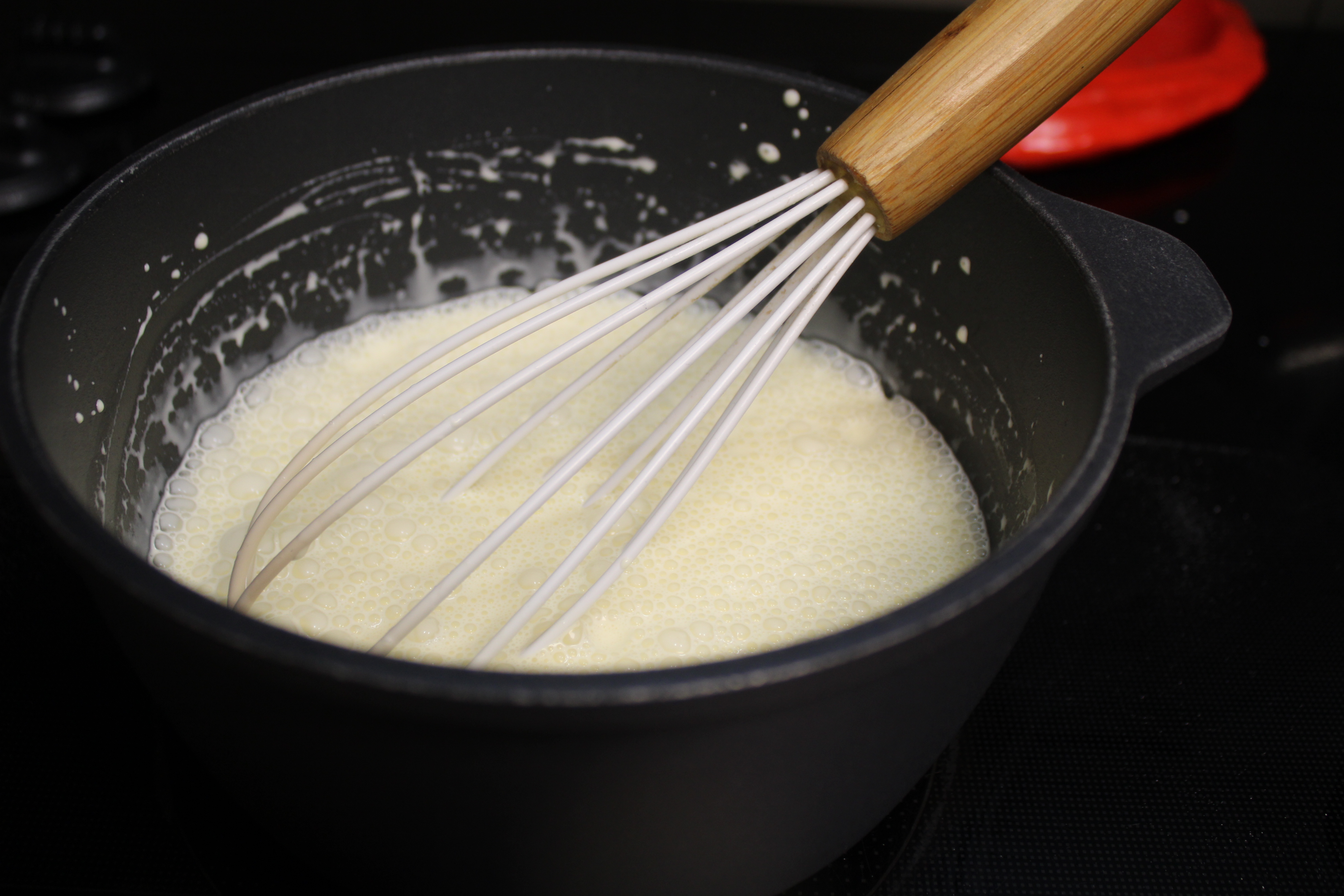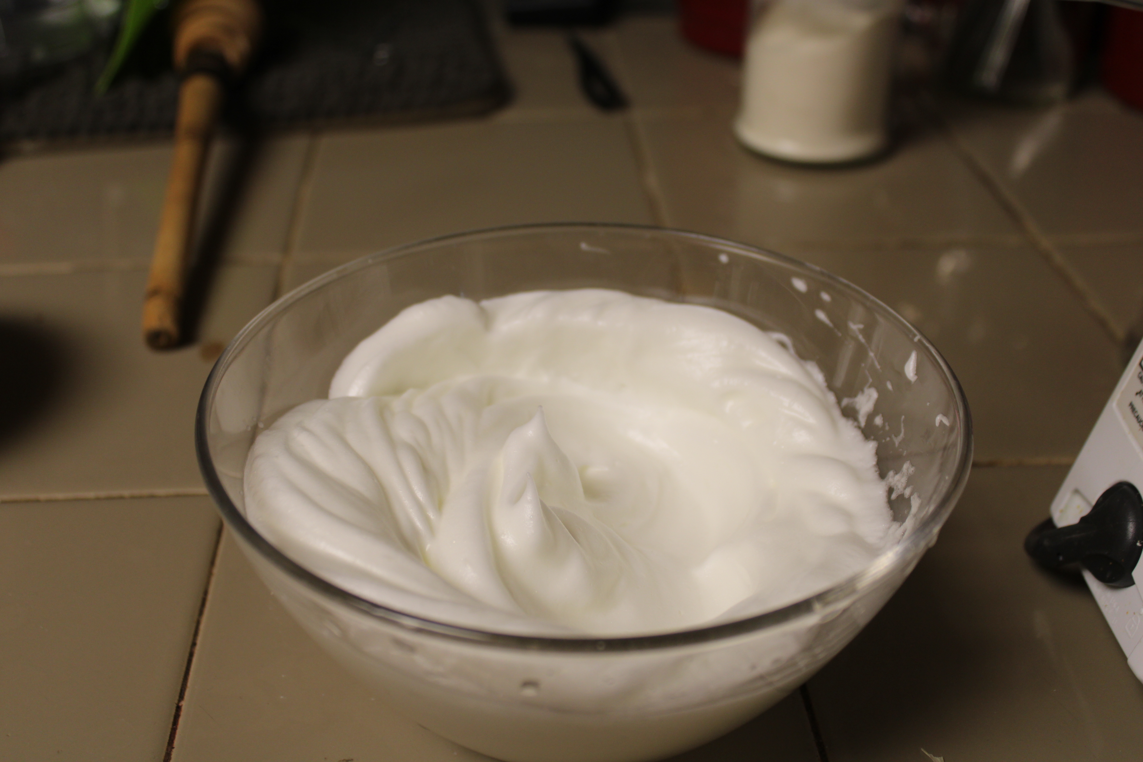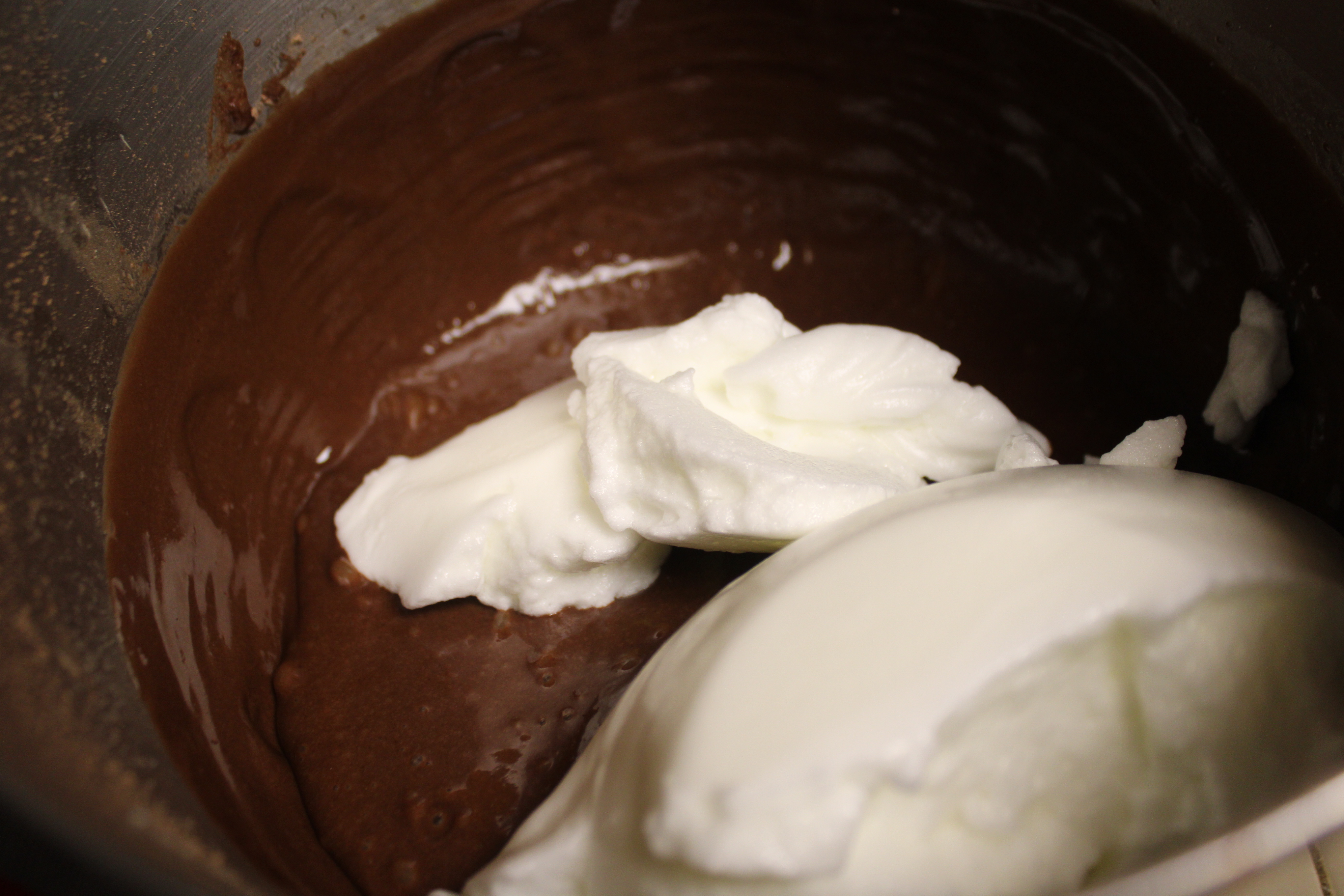 Separate 3 eggs. Set yolks aside for the Pot de Crème, white whites until stiff. Set aside.