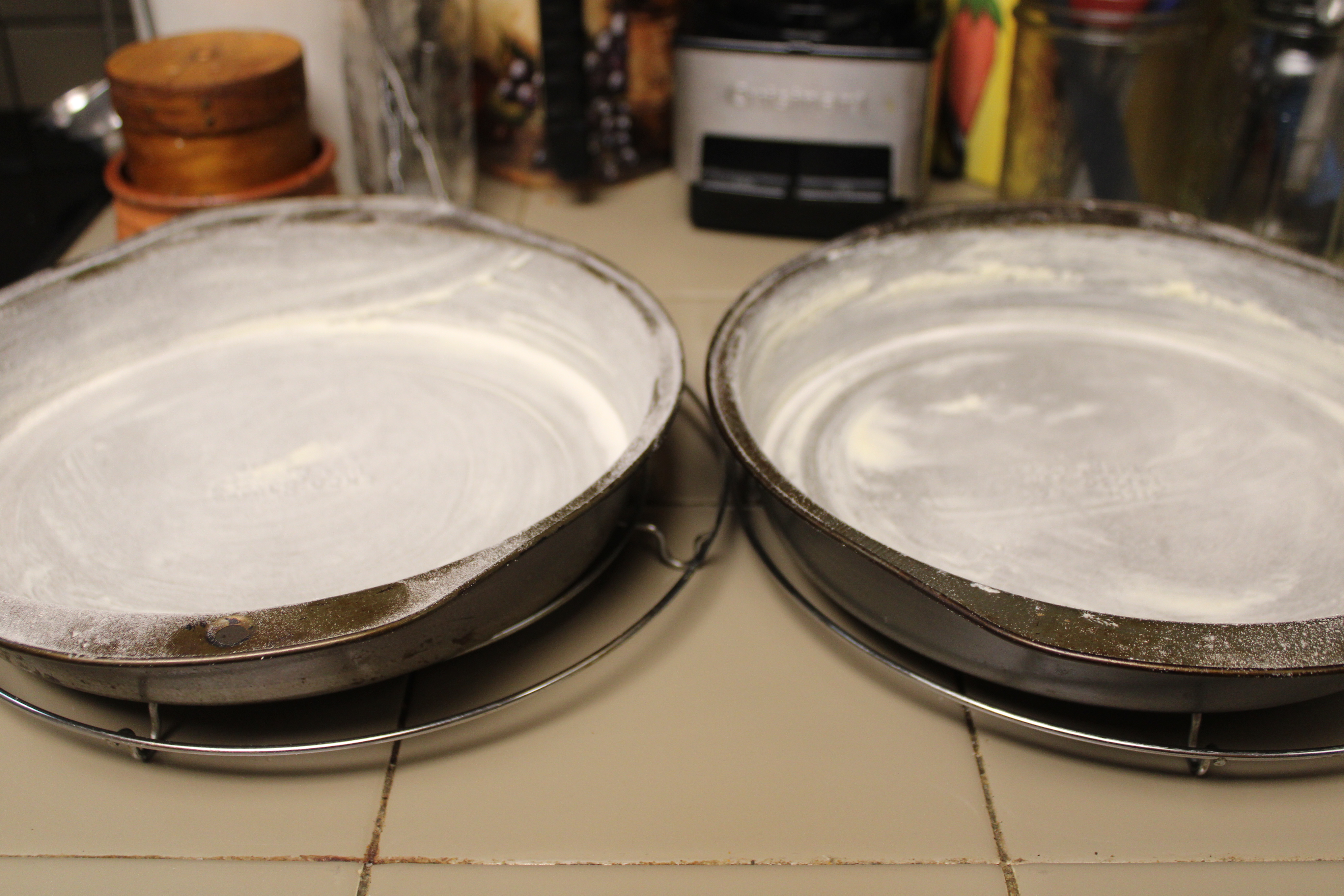 Heat oven to 325-degrees. Grease bottom and sides of two 8-inch round cake pans with shortening or margarine. Sprinkle with a silky flour such as Wondra or cake flour. Shake out excess flour, set pans aside.