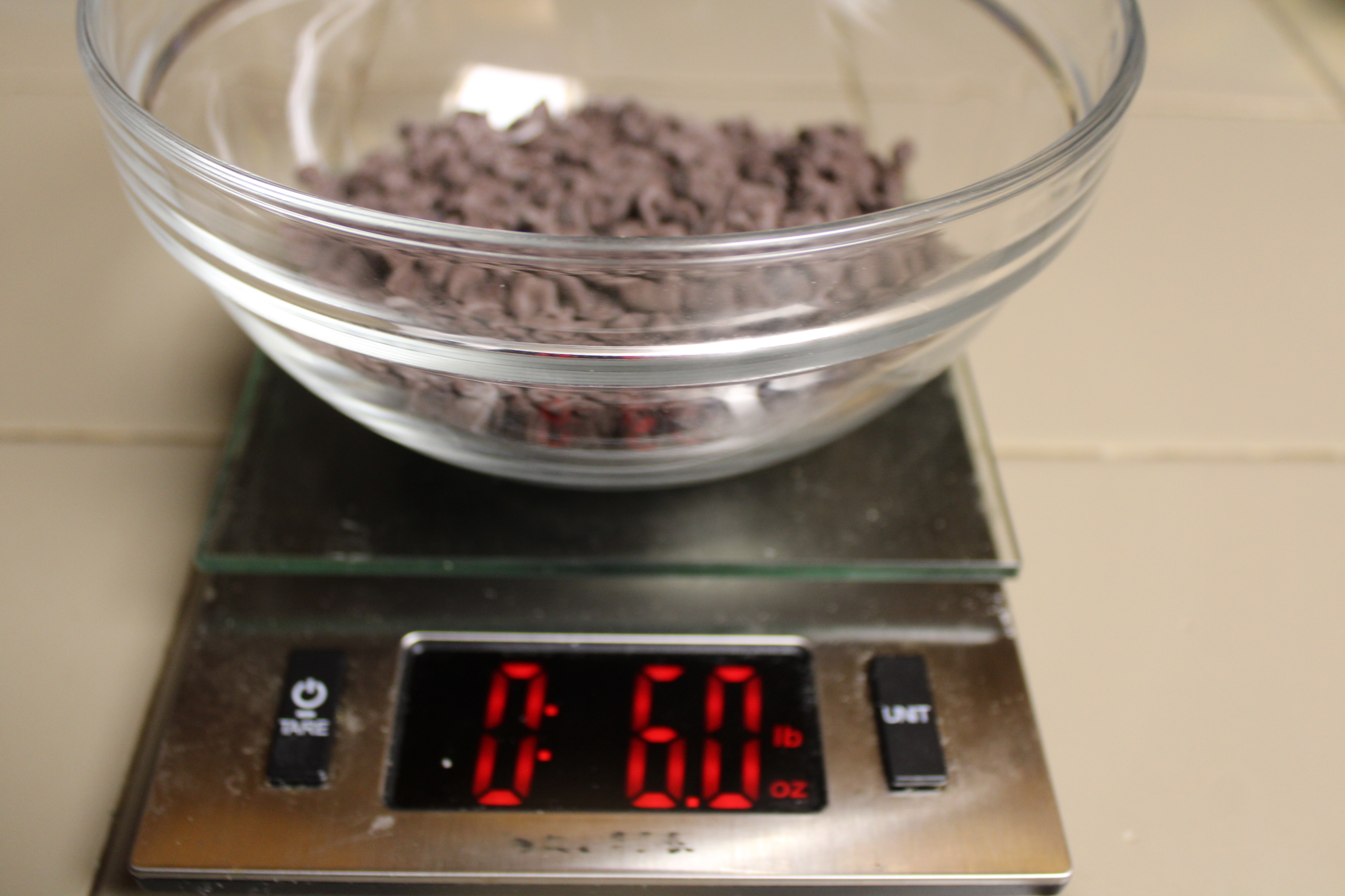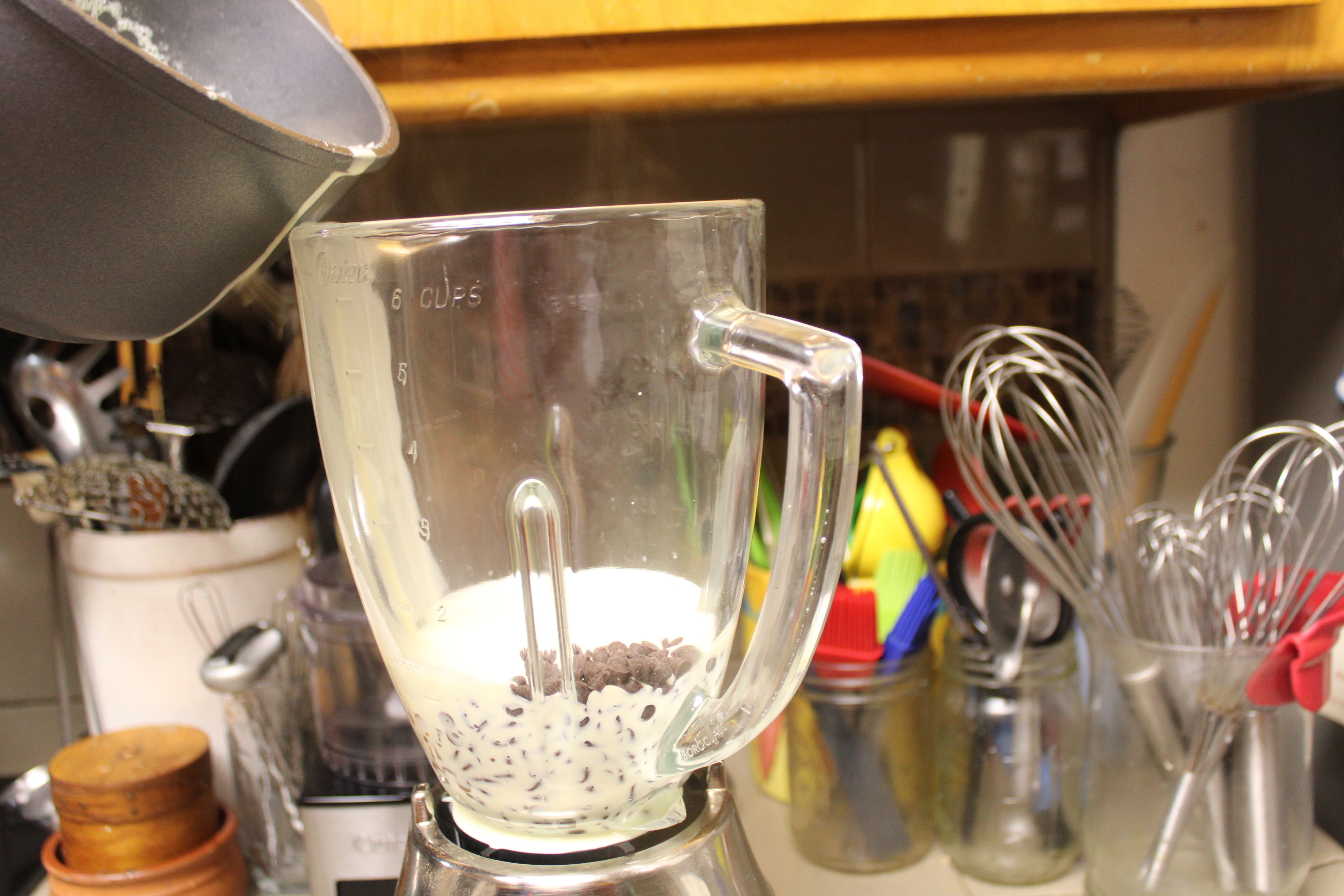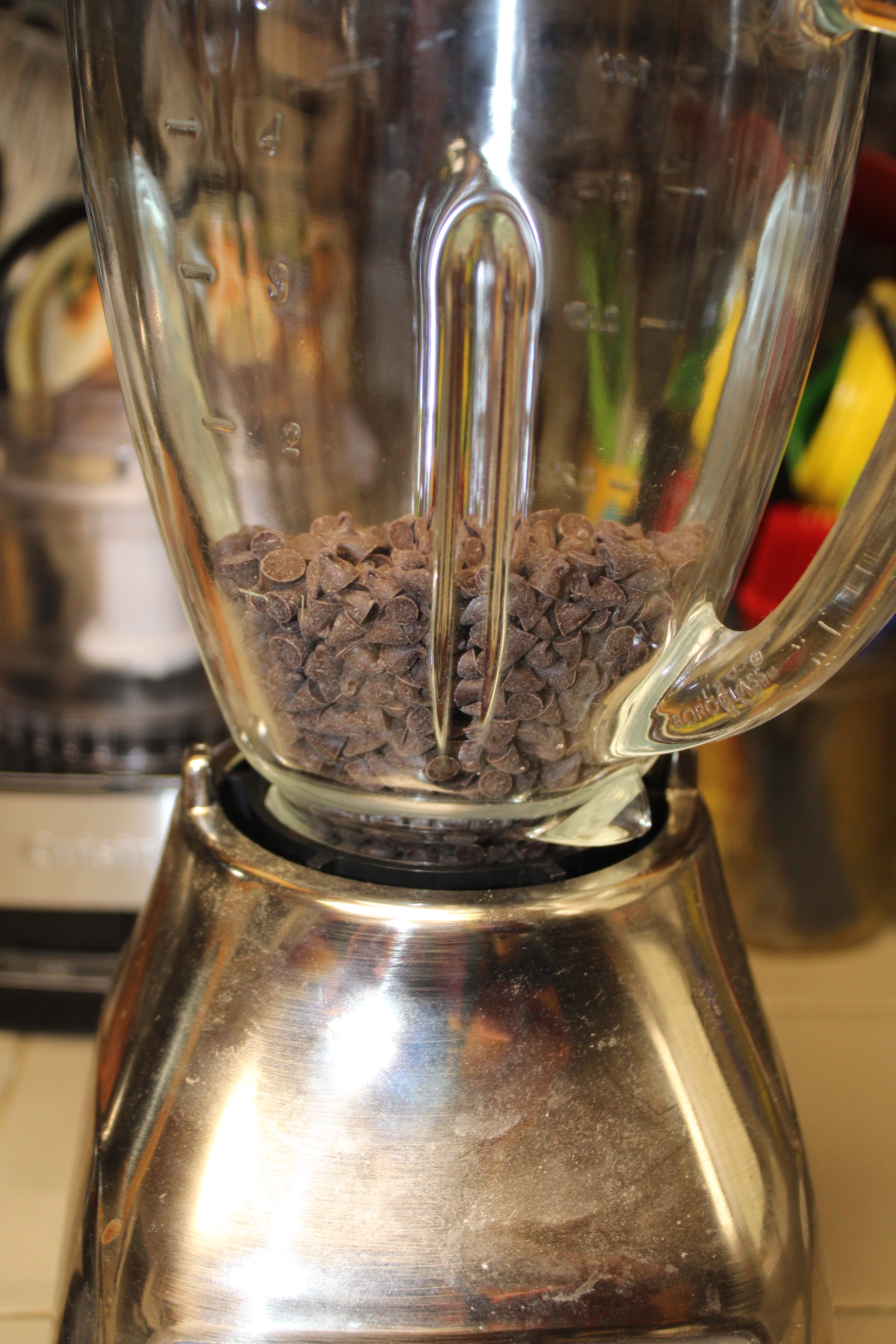 Set yolks on the counter to take the chill off, aside. Weight chips and place chocolate into in a blender and set aside.