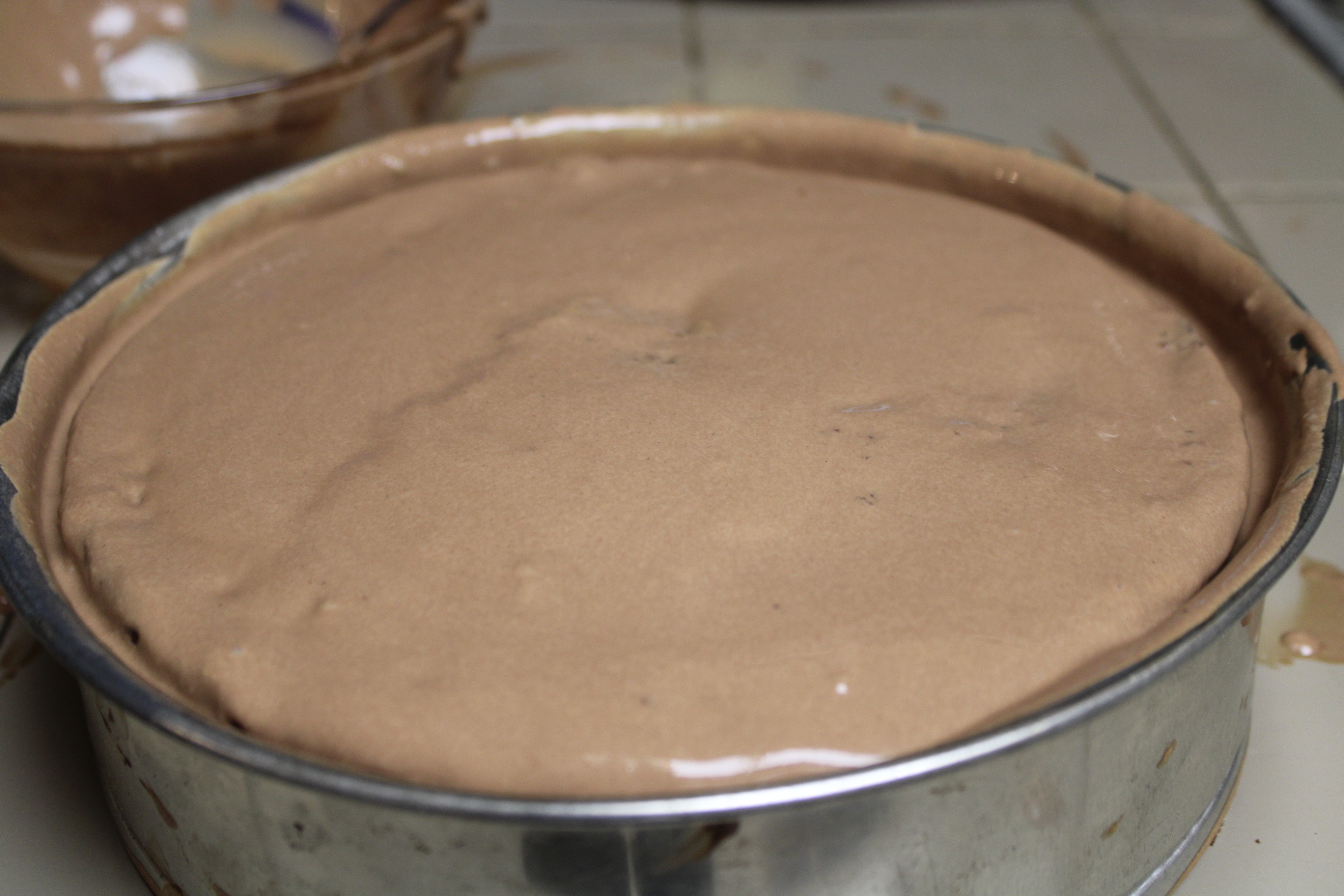 Increase speed to medium, beat for 2 minutes. Gently fold stiff whites into the cake batter. Divide batter evenly between the prepared cake pans. (About 2 cups per pan)