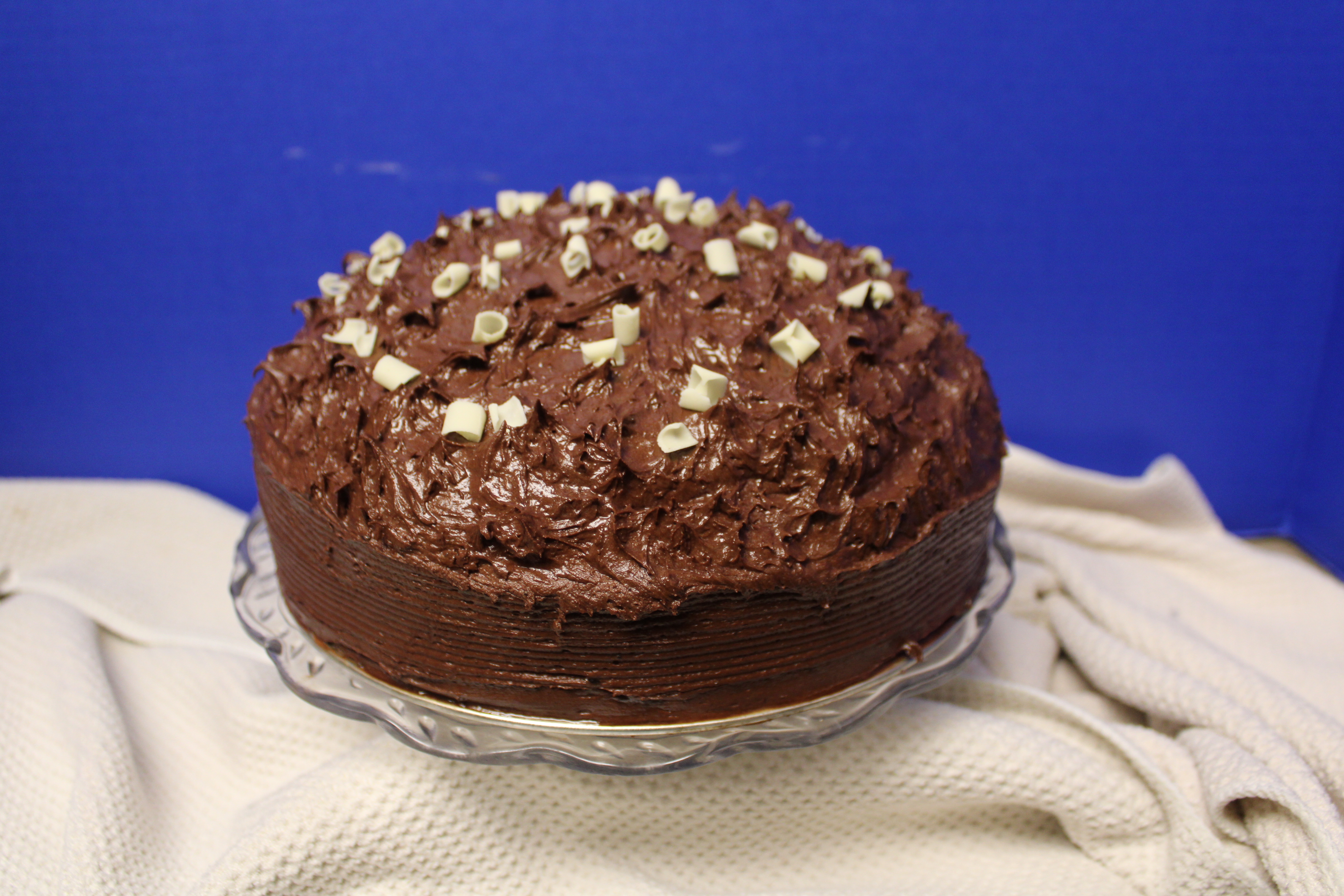 Fully frost sides, turning cake for an even spread. Finish frosting top. With a knife create rises in the top of the frosting. Garnish with White Chocolate Curls if desired. CAREFULLY transfer cake to a footed Cake Platter. Chill until ready to serve.