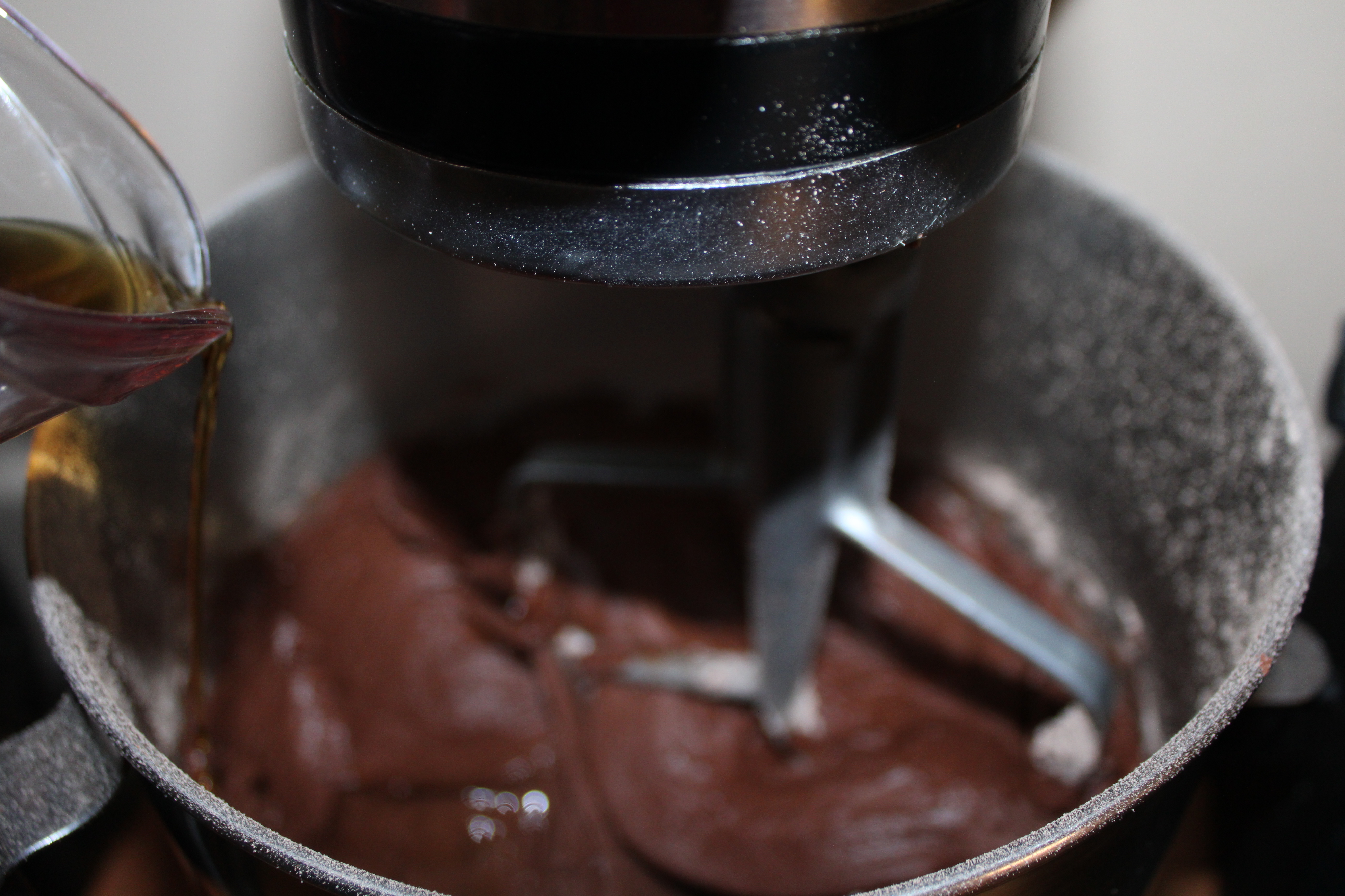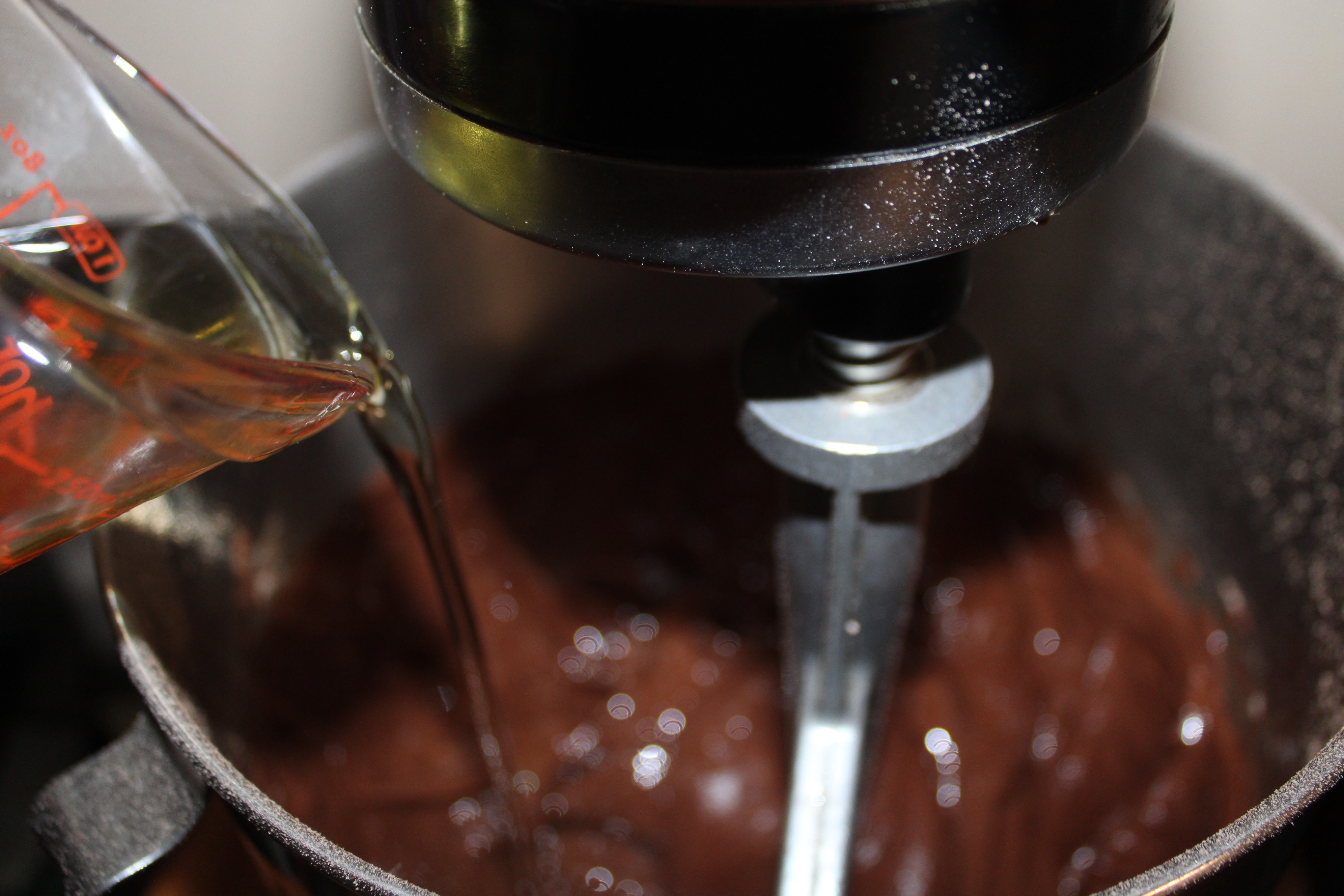In the bowl of a stand mixer, blend cake mix with cocoa powder. Add warmed water, coffee and oil. Beat on low speed, adding eggs one egg at a time. Continue to beat at low speed until batter is moistened, about 30 seconds.