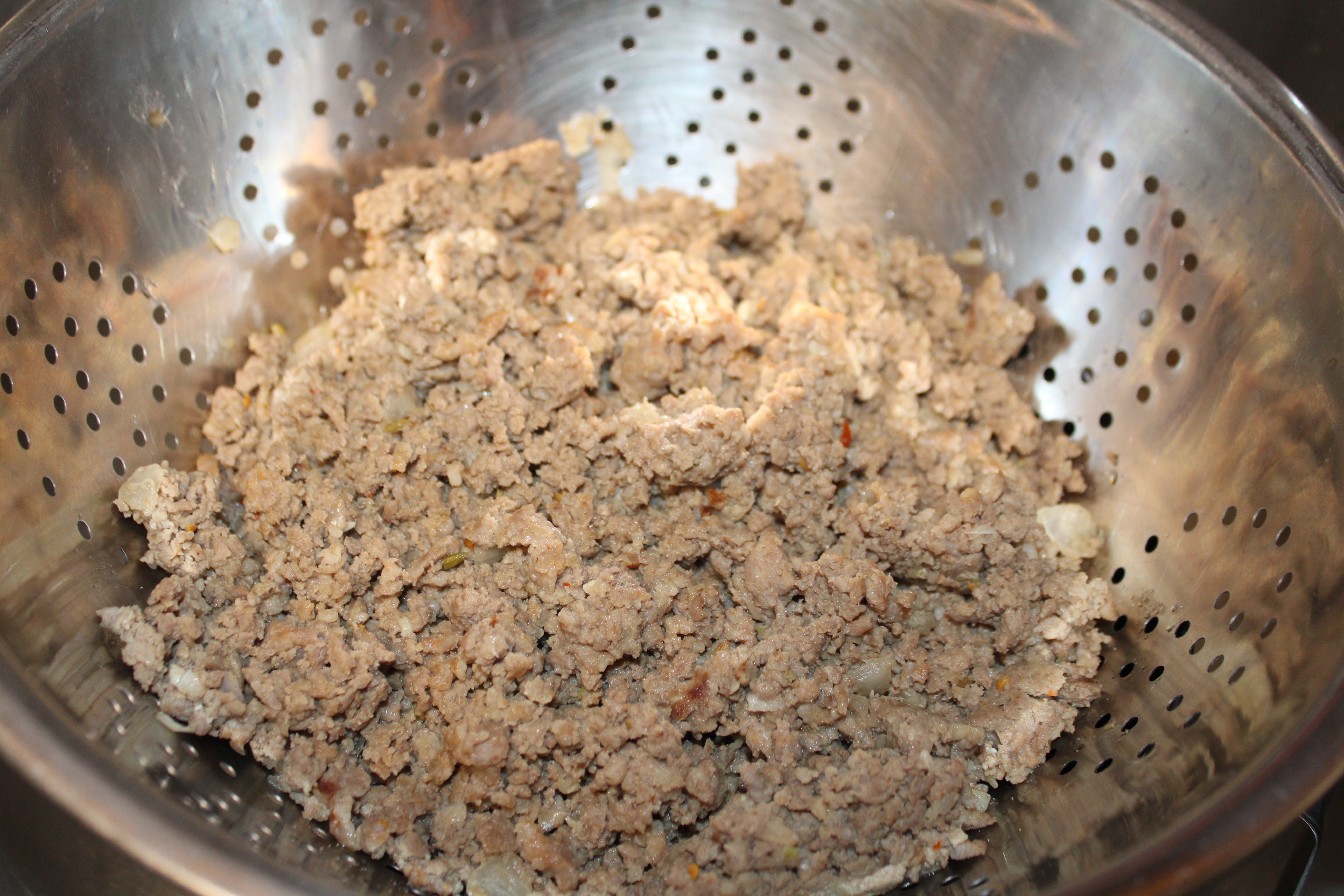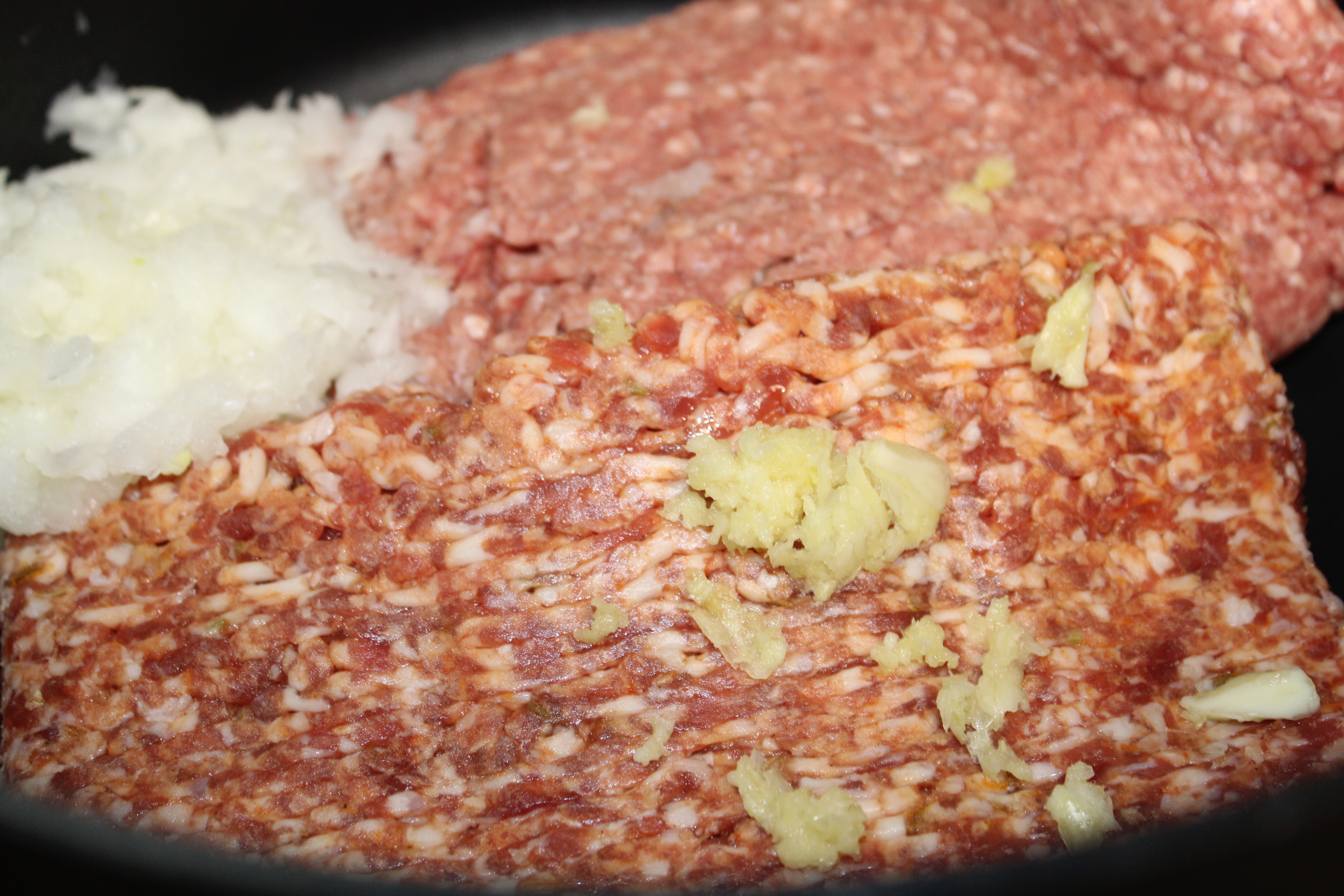 Cook sausage, ground beef and onion together in a Dutch Oven over medium heat until beginning to brown. Press garlic into the meat mixture, continue to cook, breaking meat apart until it is well browned. Drain well.