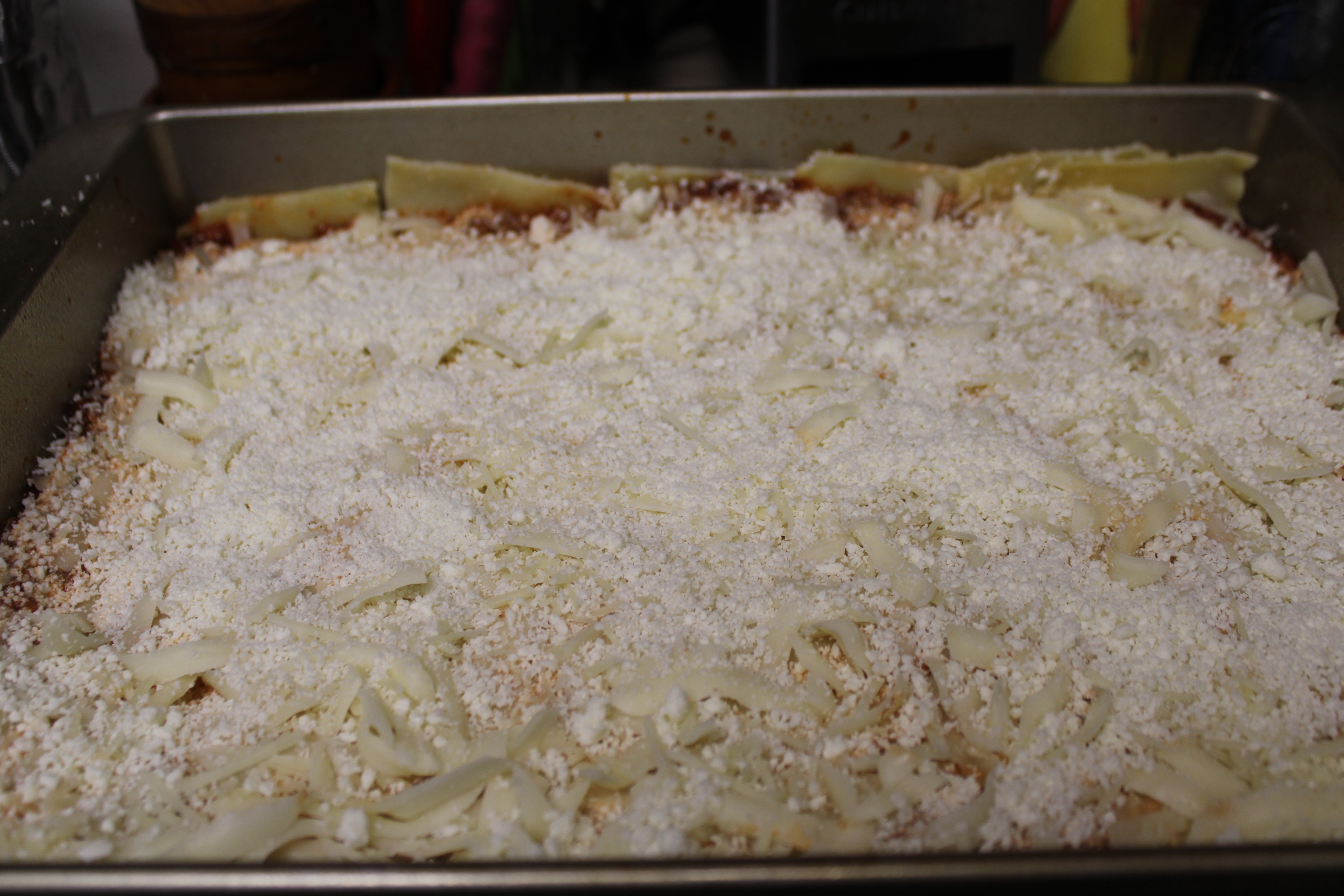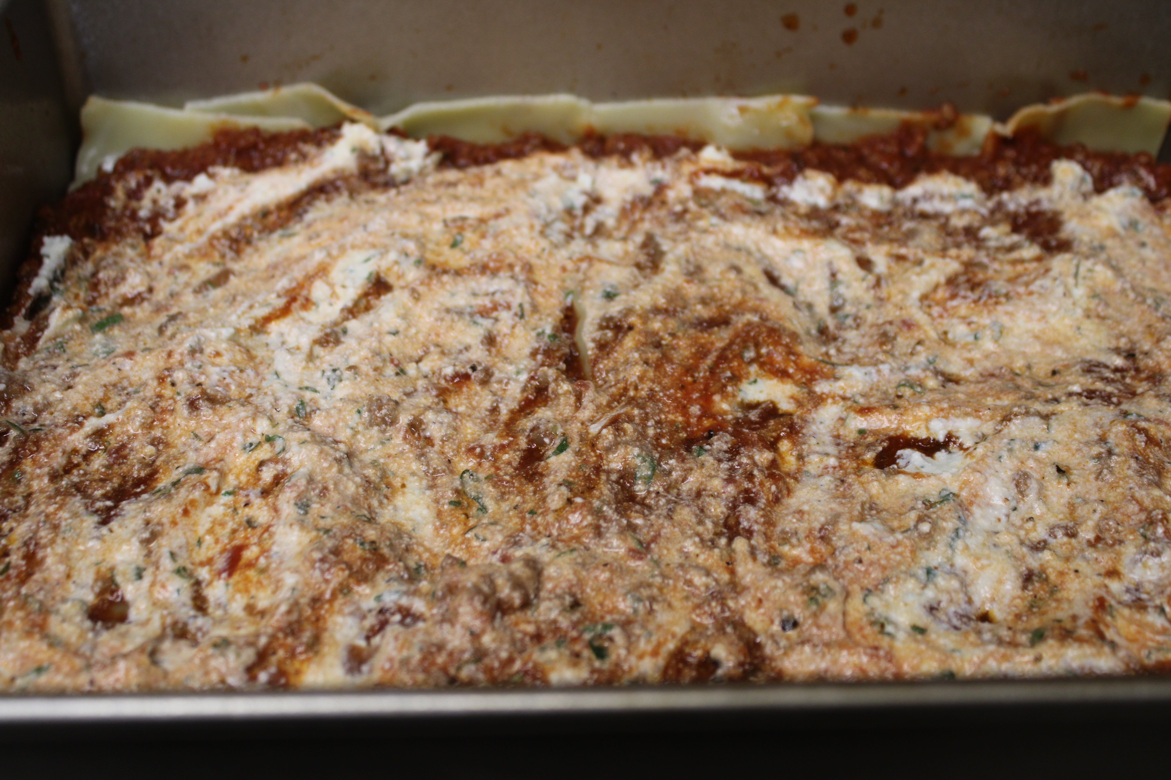 To assemble: Spread 1-1/2 cups of meat sauce in the bottom of the baking dish. Arrange 6 noodles over the meat sauce, overlapping slightly. Spread with 1/2 of Ricotta cheese mixture, top with 1/3 of the Mozzarella Cheese. Spoon 1-1/2 cups meat sauce over the Mozzarella. Repeat a second layering of noodles, meat and then cheese . Finish with Parmesan Cheese for a beautiful browning layer of cheese.