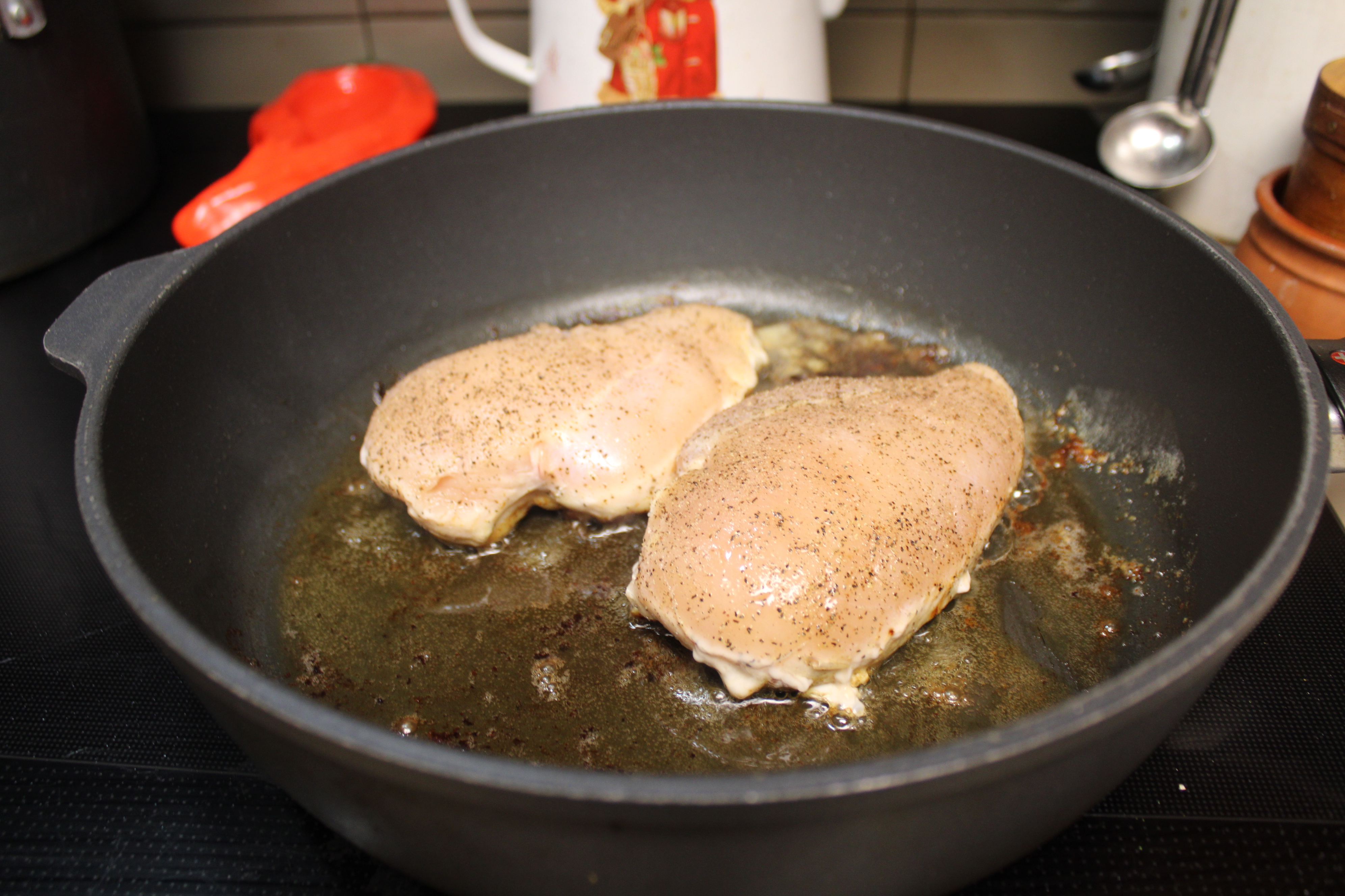 Heat olive oil over medium-high heat in a large sauté pan. Add chicken, season with salt and pepper. Let cook for about 6 minutes per side or until chicken is cooked through and beautifully golden.