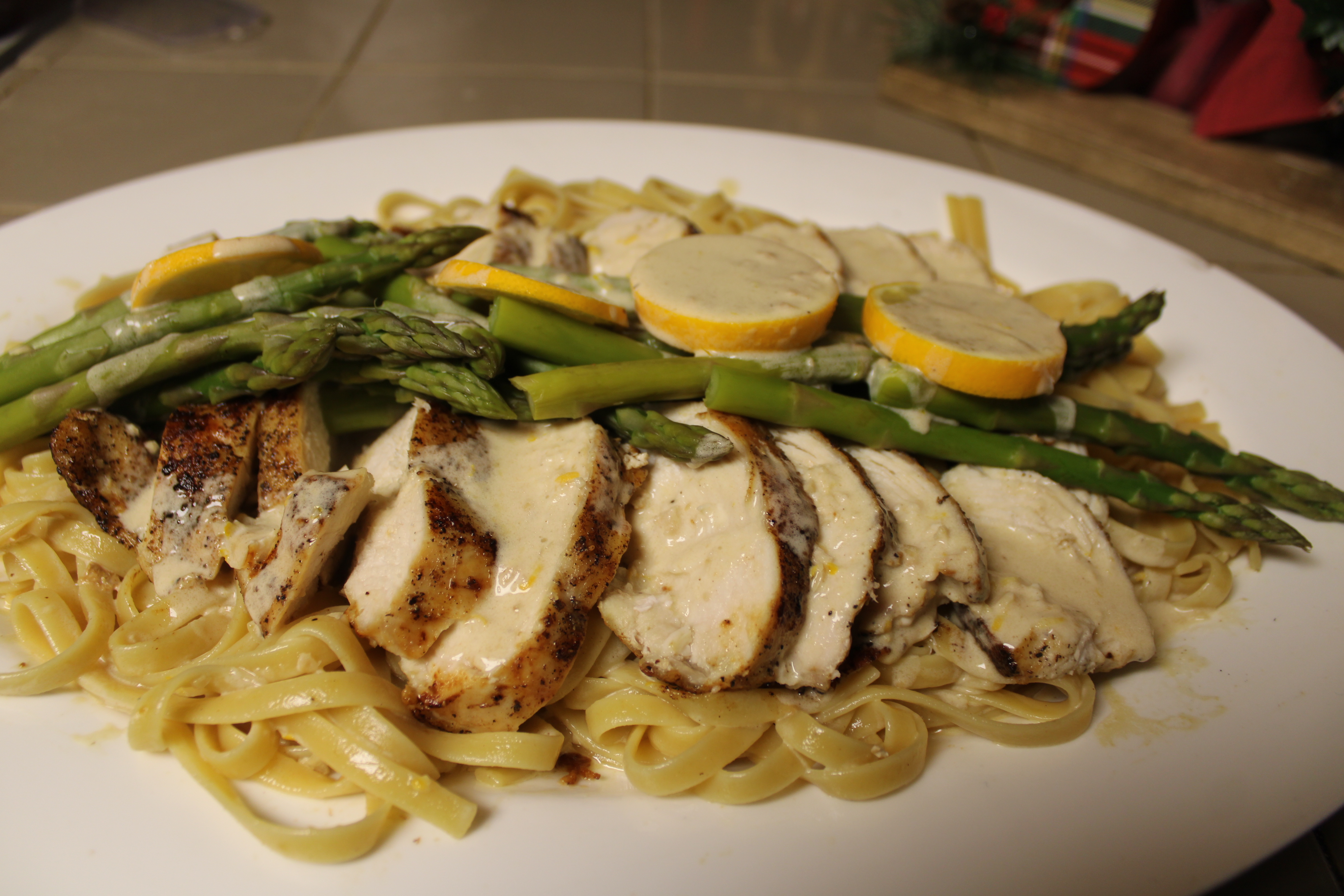 Fan chicken slices out over the pasta. Adorn platter with asparagus. Serve with warm bread and a simple salad for a beautiful supper.