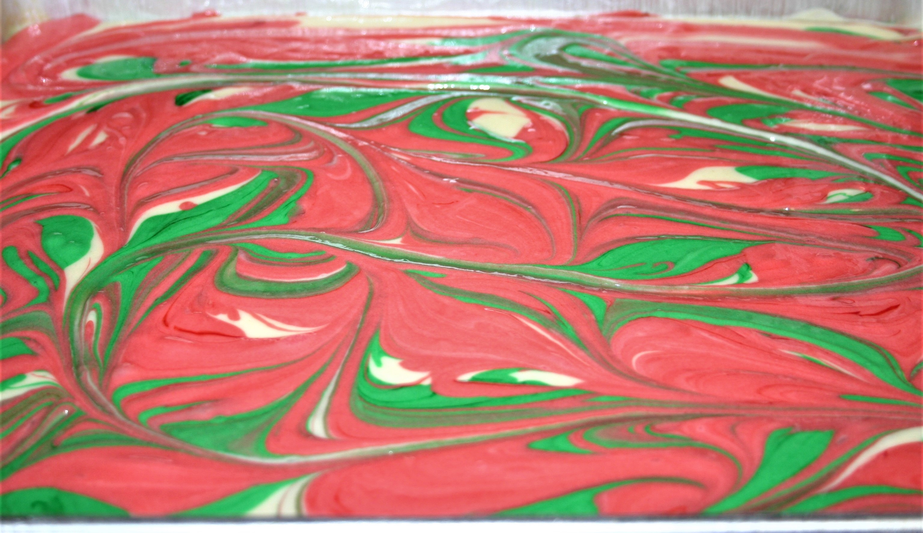 Using a spoon, drop tinted batter throughout pan. With a knife, swirl tinted batter to create red and green “marbling” throughout cake.