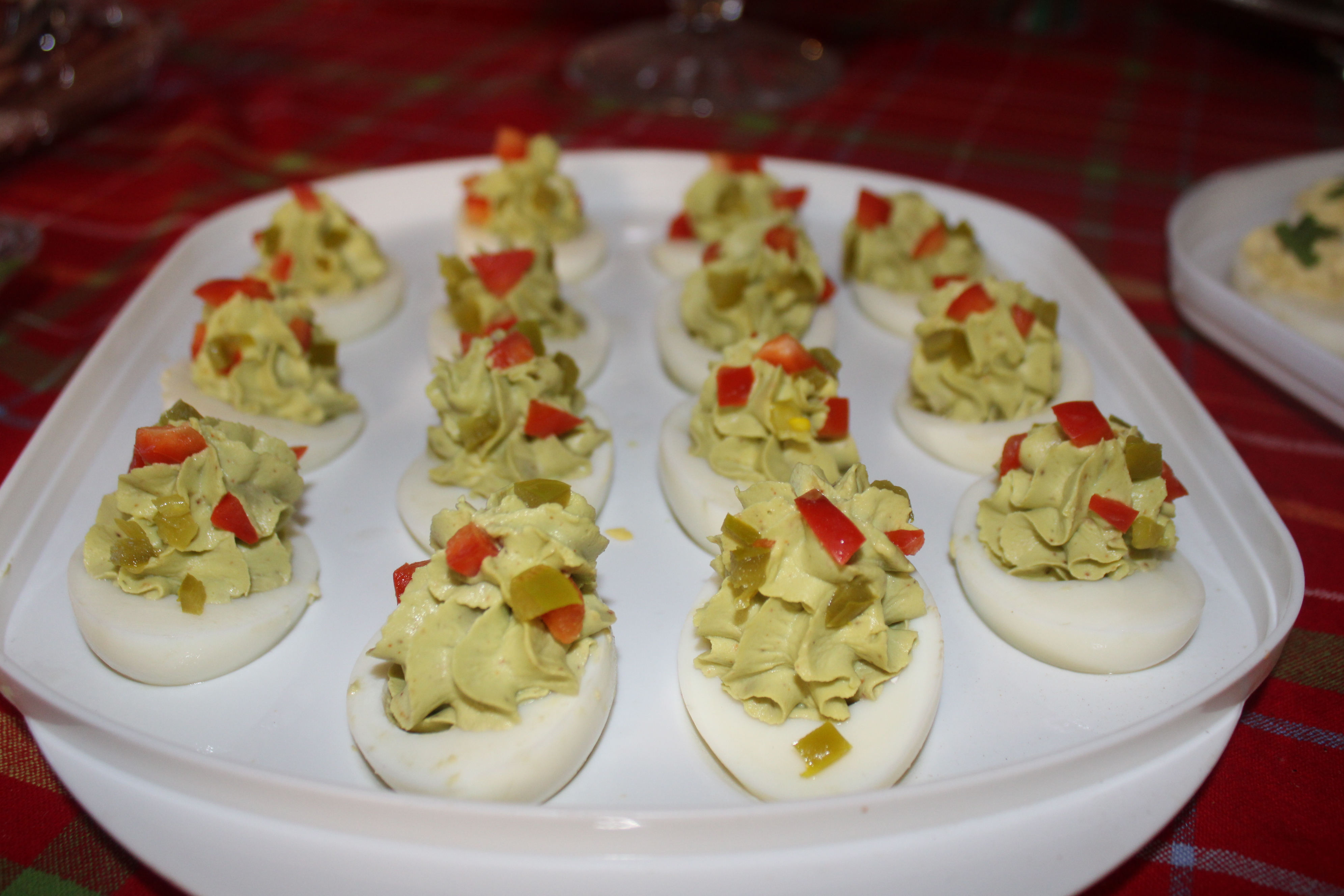 Dice red ball pepper and Jalapeños, garnish the deviled eggs with diced peppers. Serve immediately or refrigerate, covered, and allow flavors to deepen.