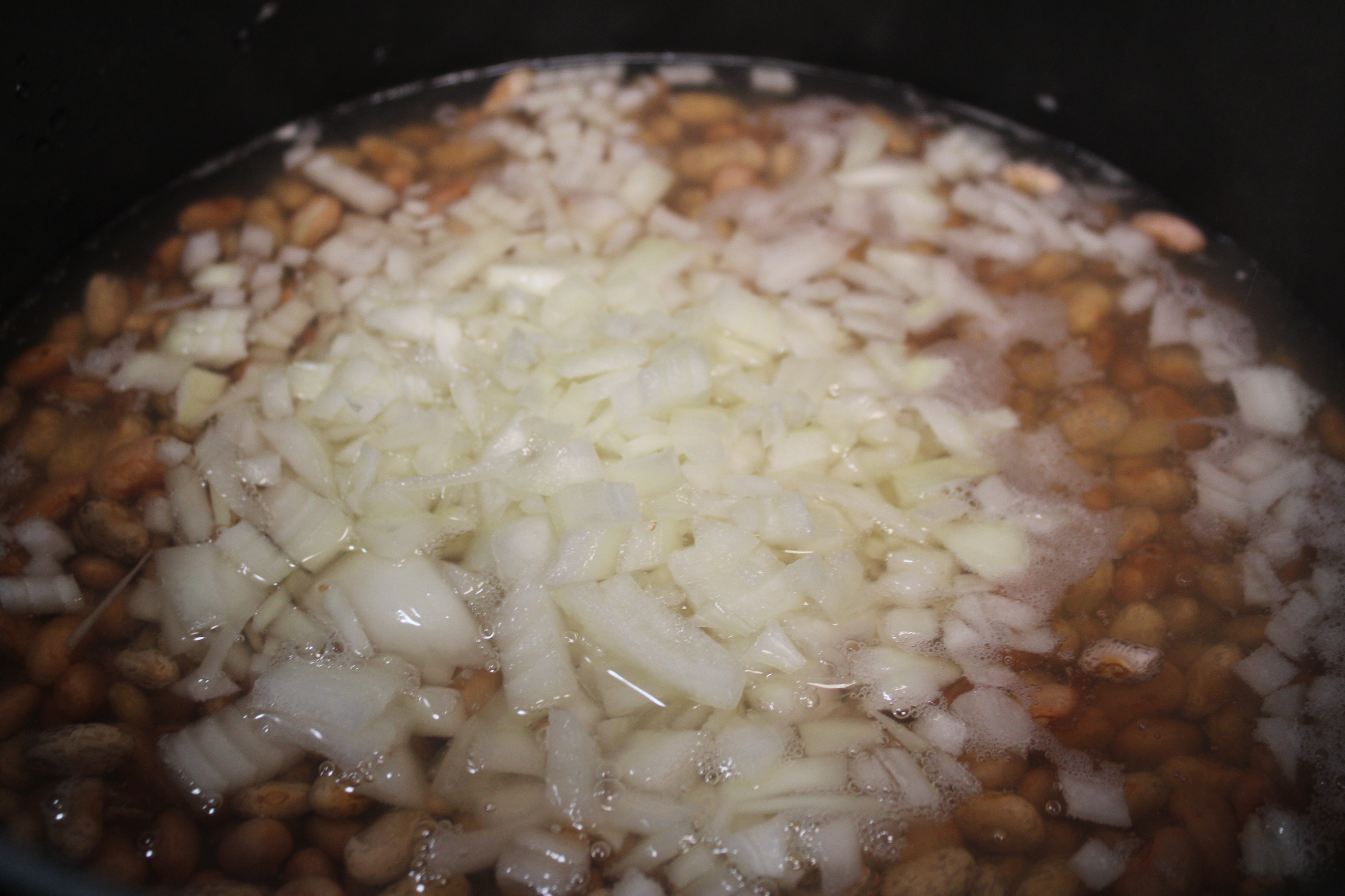 Peel and dice onion while the pot comes to a boil. Lower heat, add onion and let simmer until beans are tender but firm, about 3 hours, adding more water as necessary.