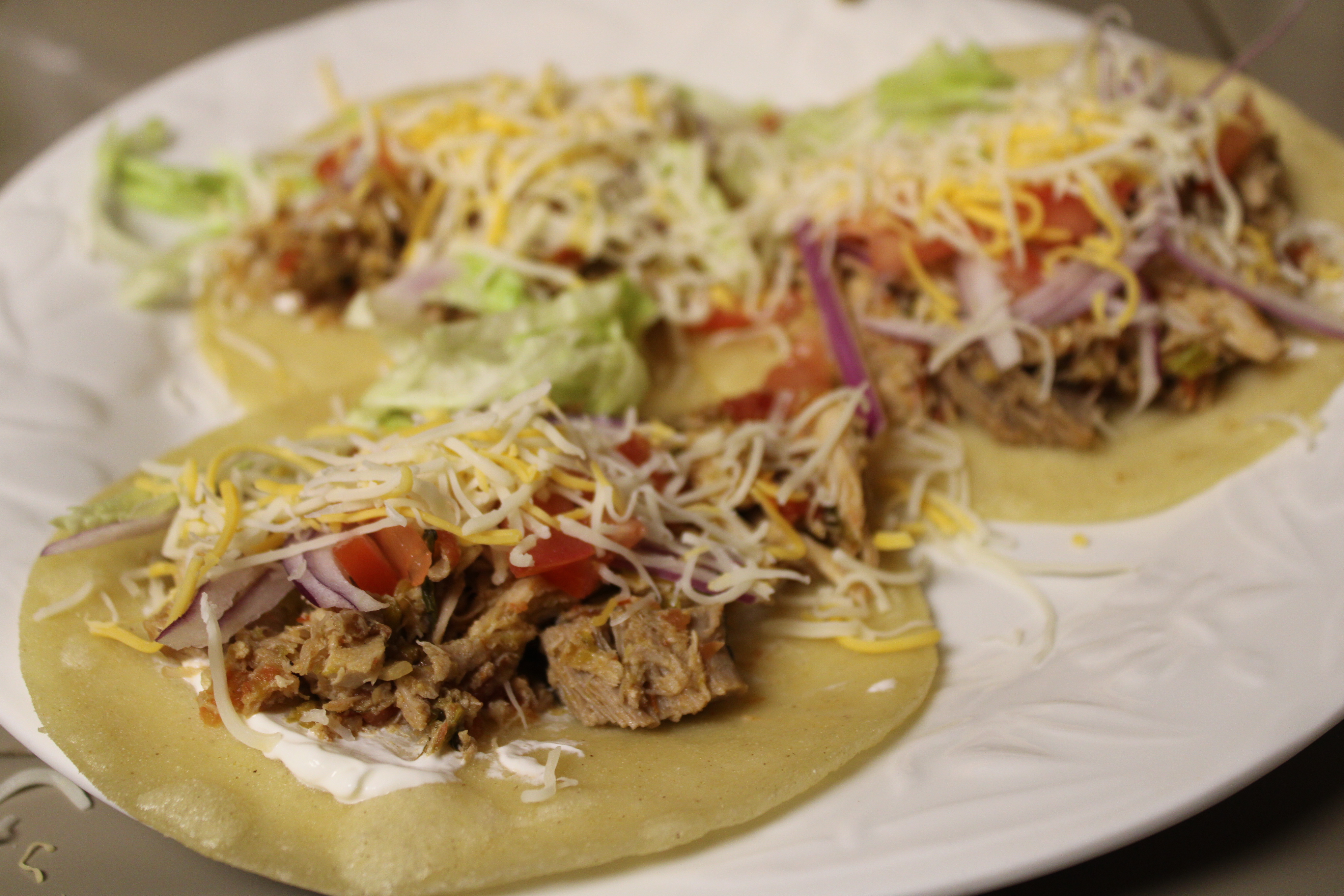 To assemble, spread sour cream as desired on the tortillas. Ppoon about 2/3 cup meat mixture onto each tortilla, top with a few sliced onions, diced tomatoes, and shredded lettuce as desired. Finish with some cheese and hot peppers if desired, fold tortillas like a taco.