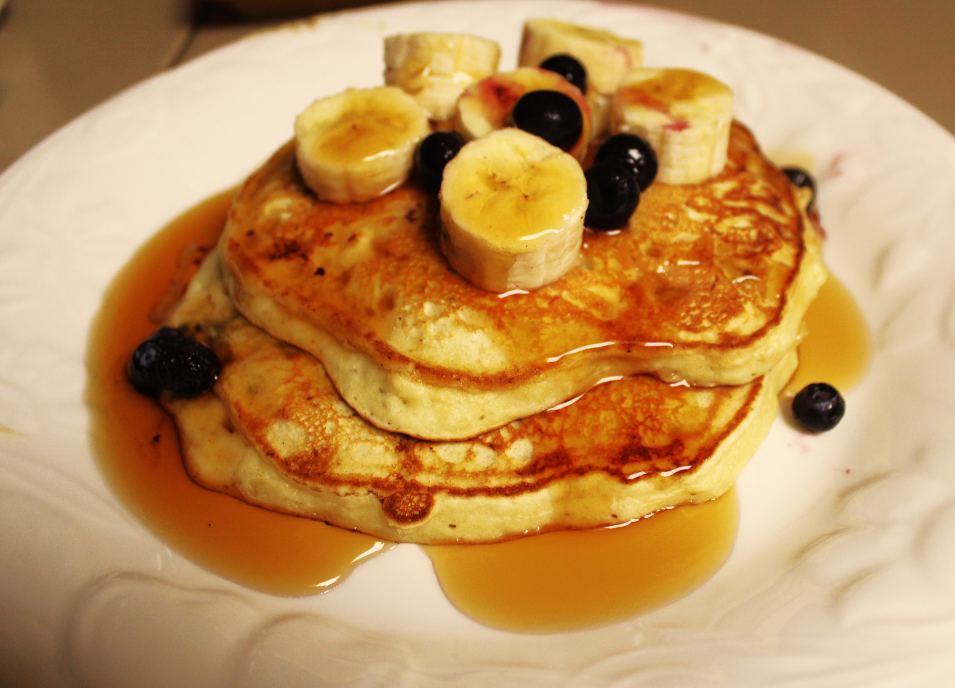 Stack pancakes, garnish with sliced bananas and a scattering of blueberries. Delicious with syrup and a side of meat such as bacon or sausage.