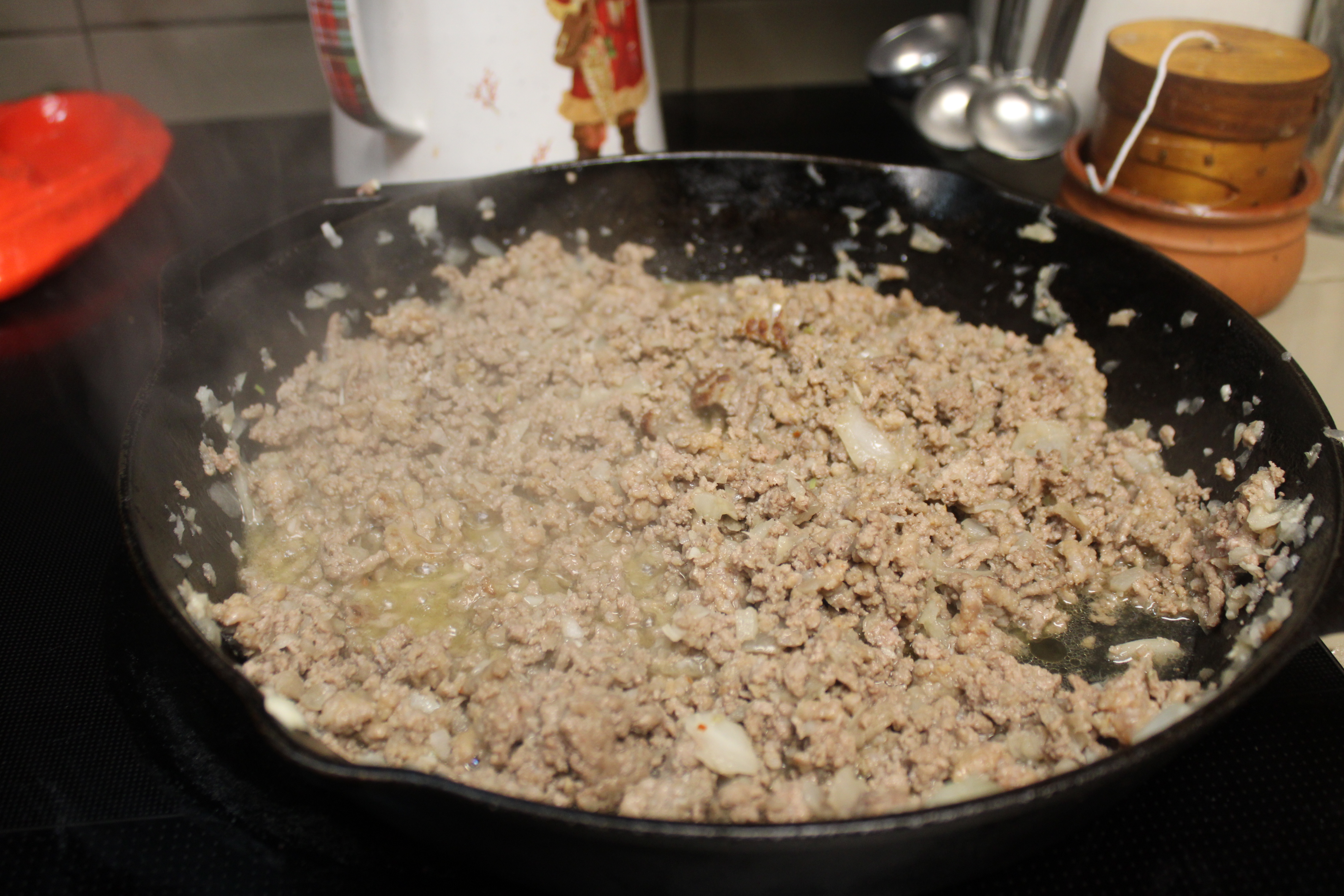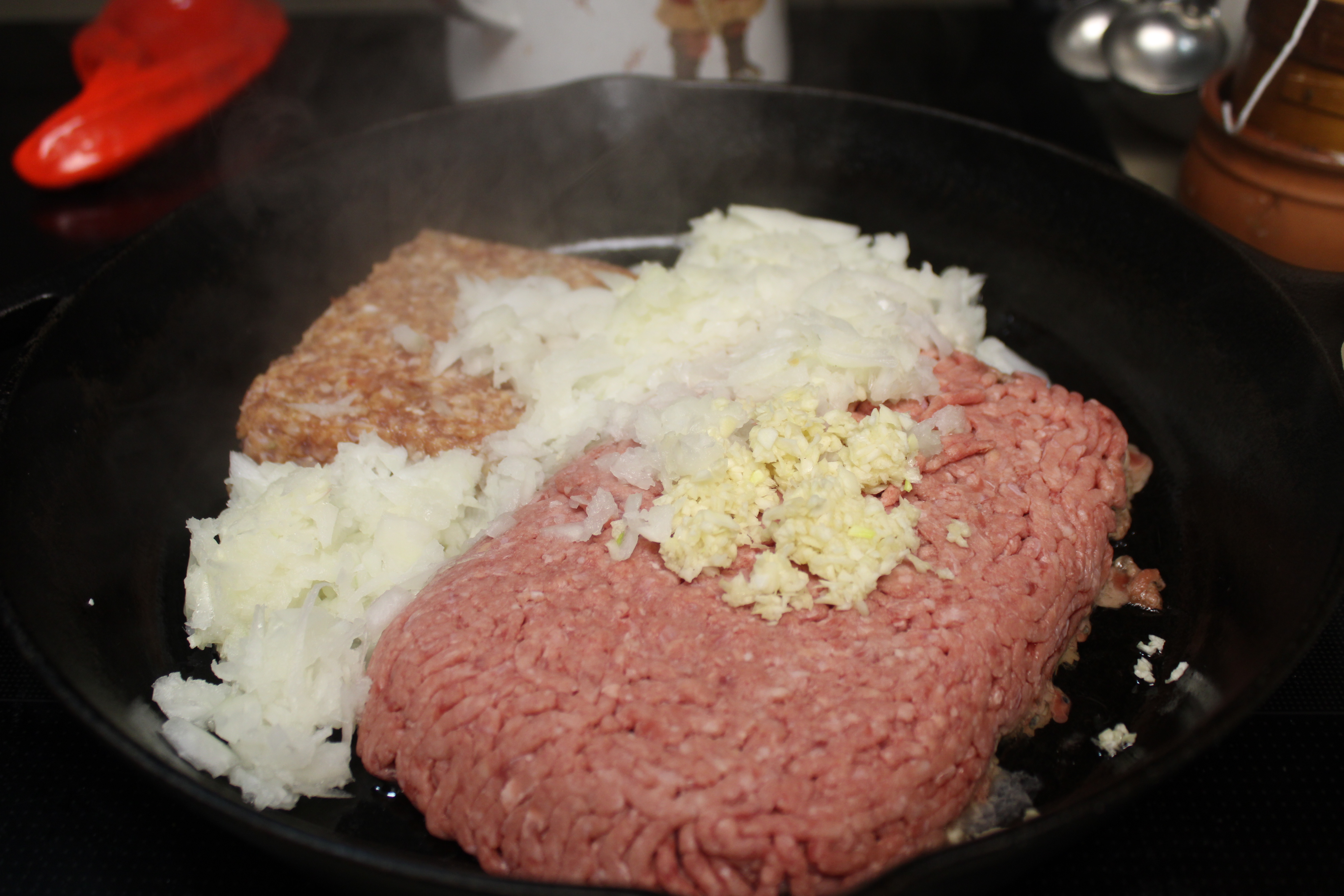 Heat a cast iron skillet over medium-high heat. Cook beef, sausage, onions and garlic until the meats are cooked through. Drain well, transfer to a 5-quart slow cooker.