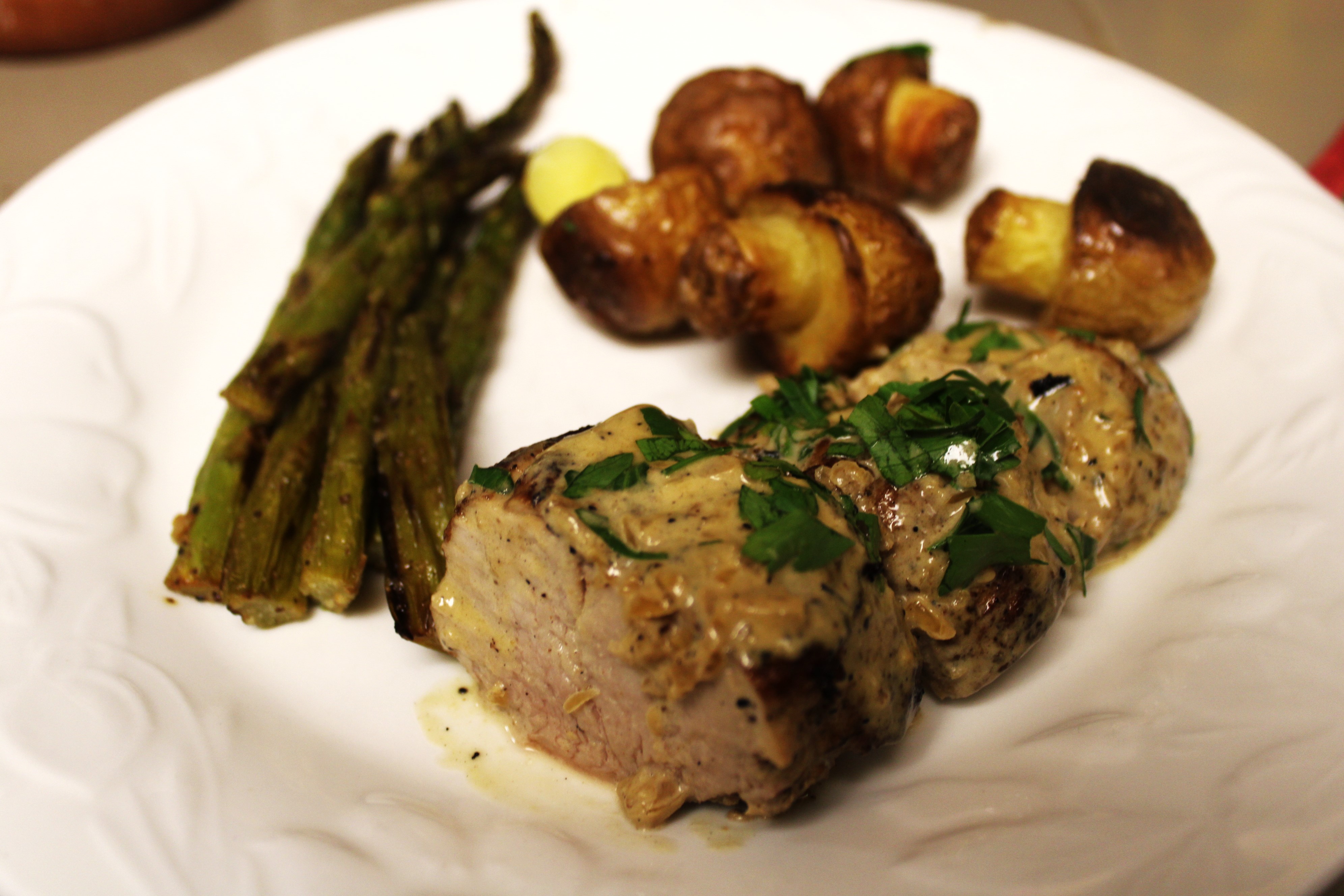 Slice the pork tenderloins into medallions on the serving platter. Pour Dijon Cream Sauce over the sliced pork. Garnish with snipped parsley. Serve and enjoy.