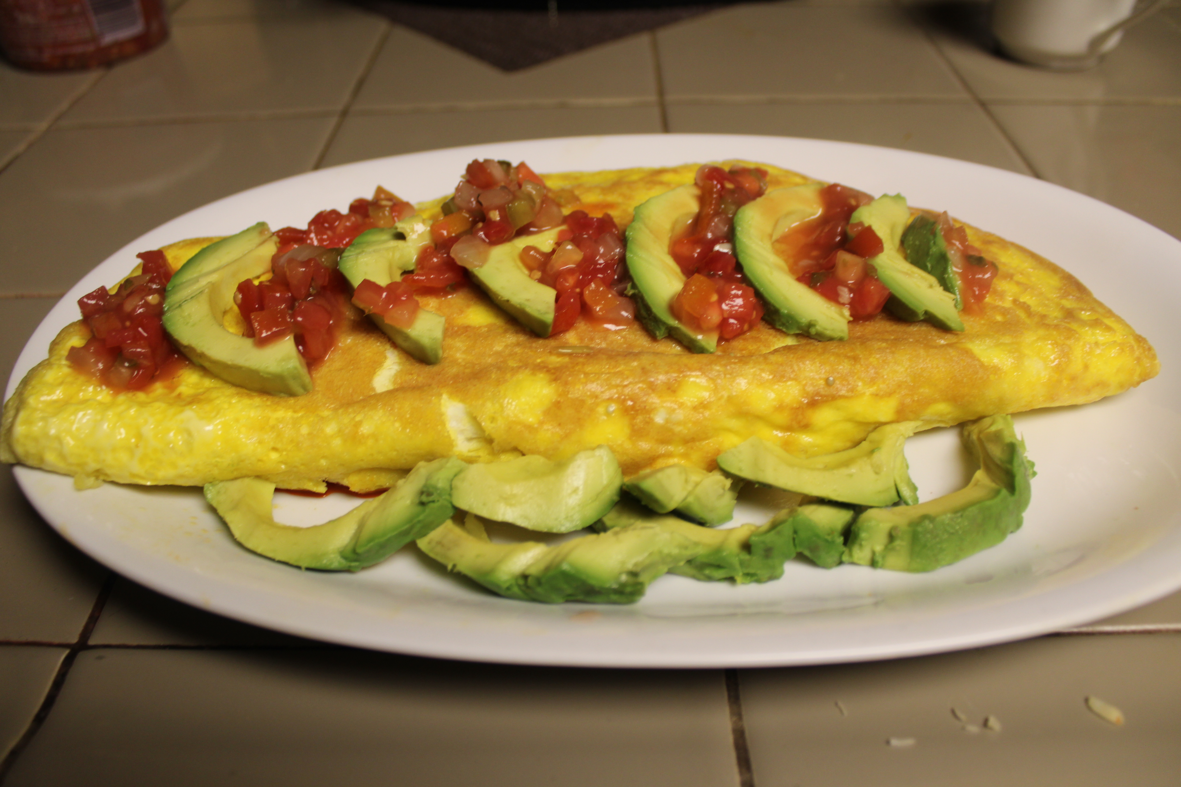 Slide omelette onto a platter. Garnish with salsa and sliced avocado. To serve, cut omelette into thirds or quarter and serve with shredded potatoes.