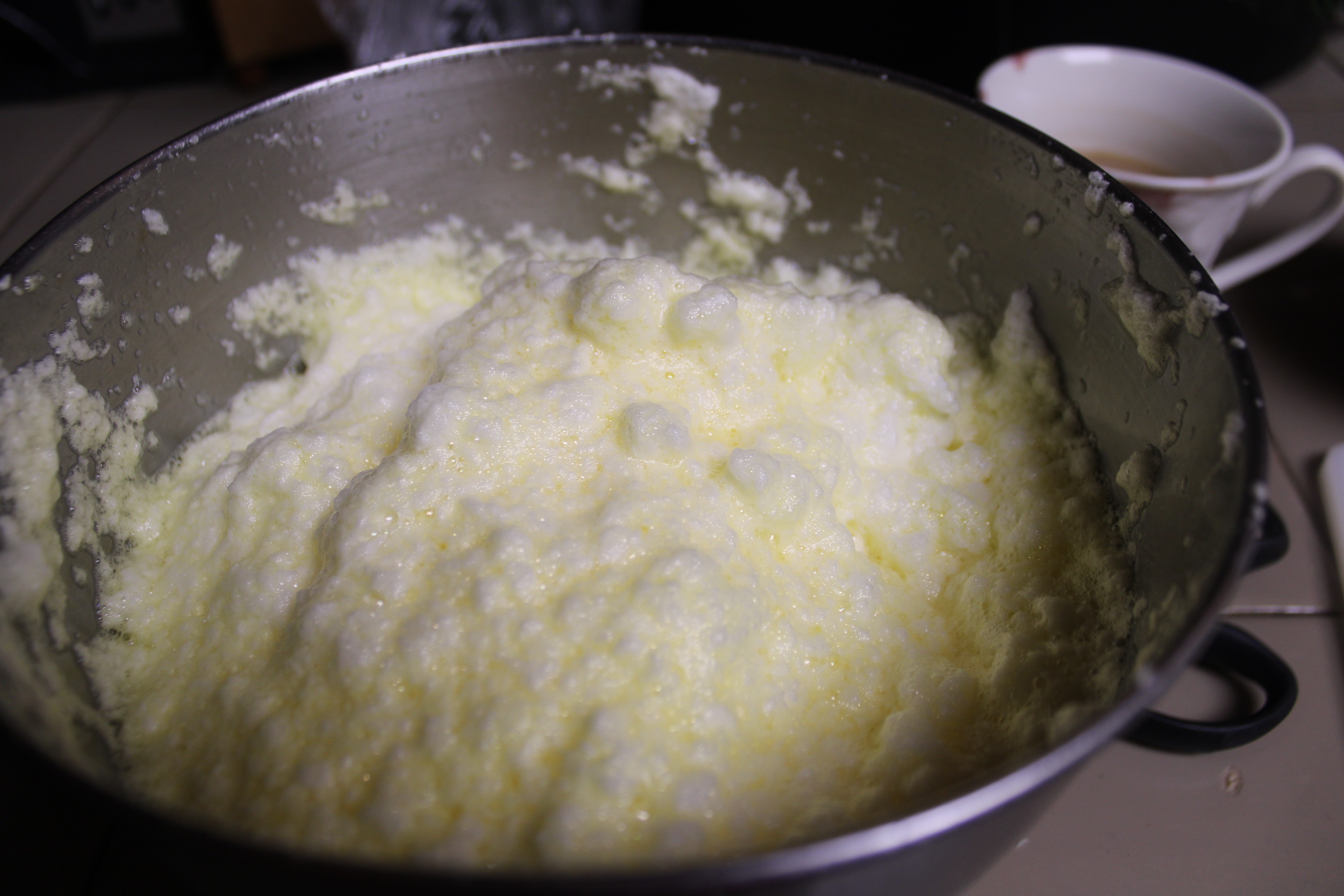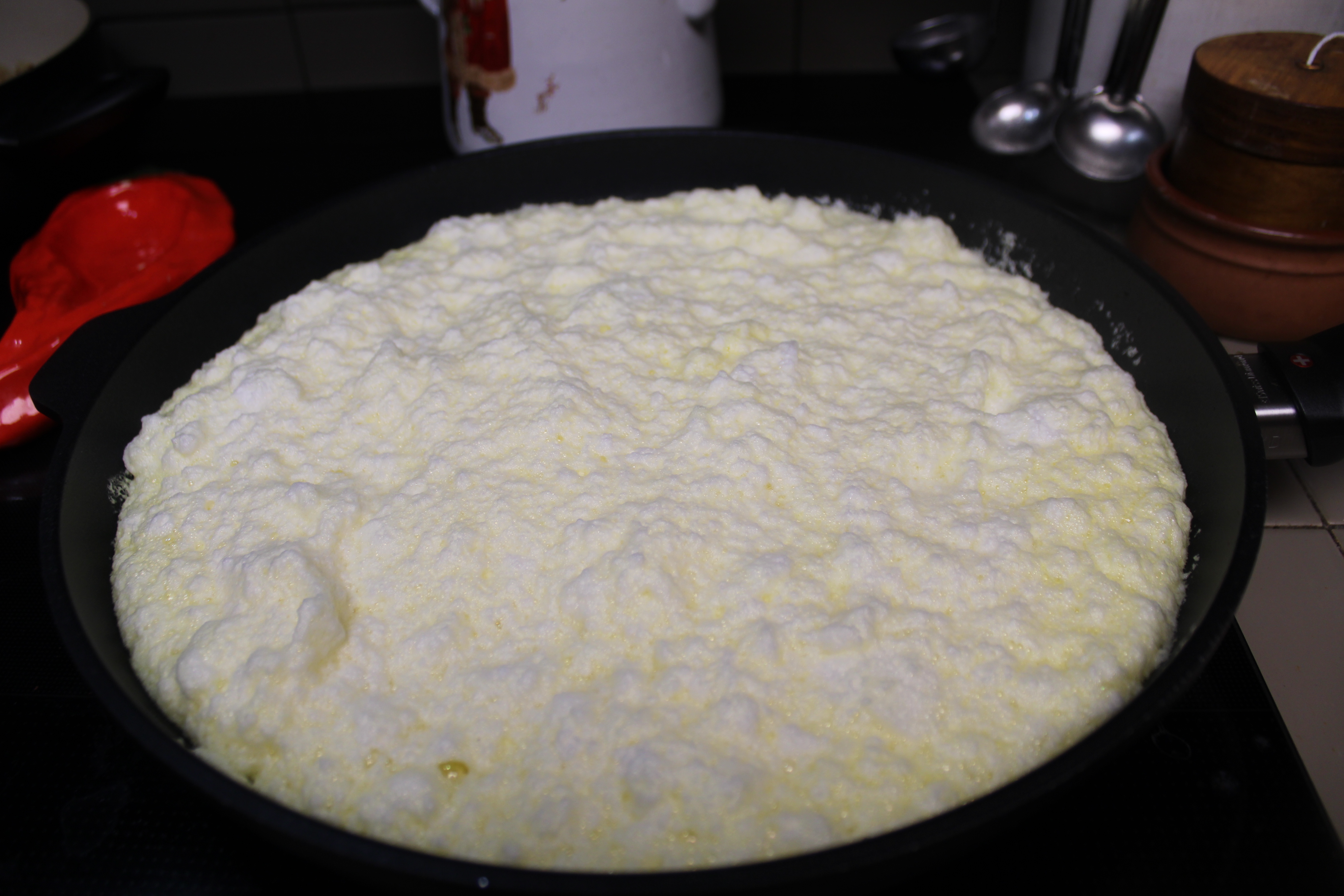 Separate eggs. Place yolks in a mixing bowl, whites in a large, deep bowl. Whip egg whites to a stiff peak. Whisk yolks vigorously. Add salt and HOT water, mix well.