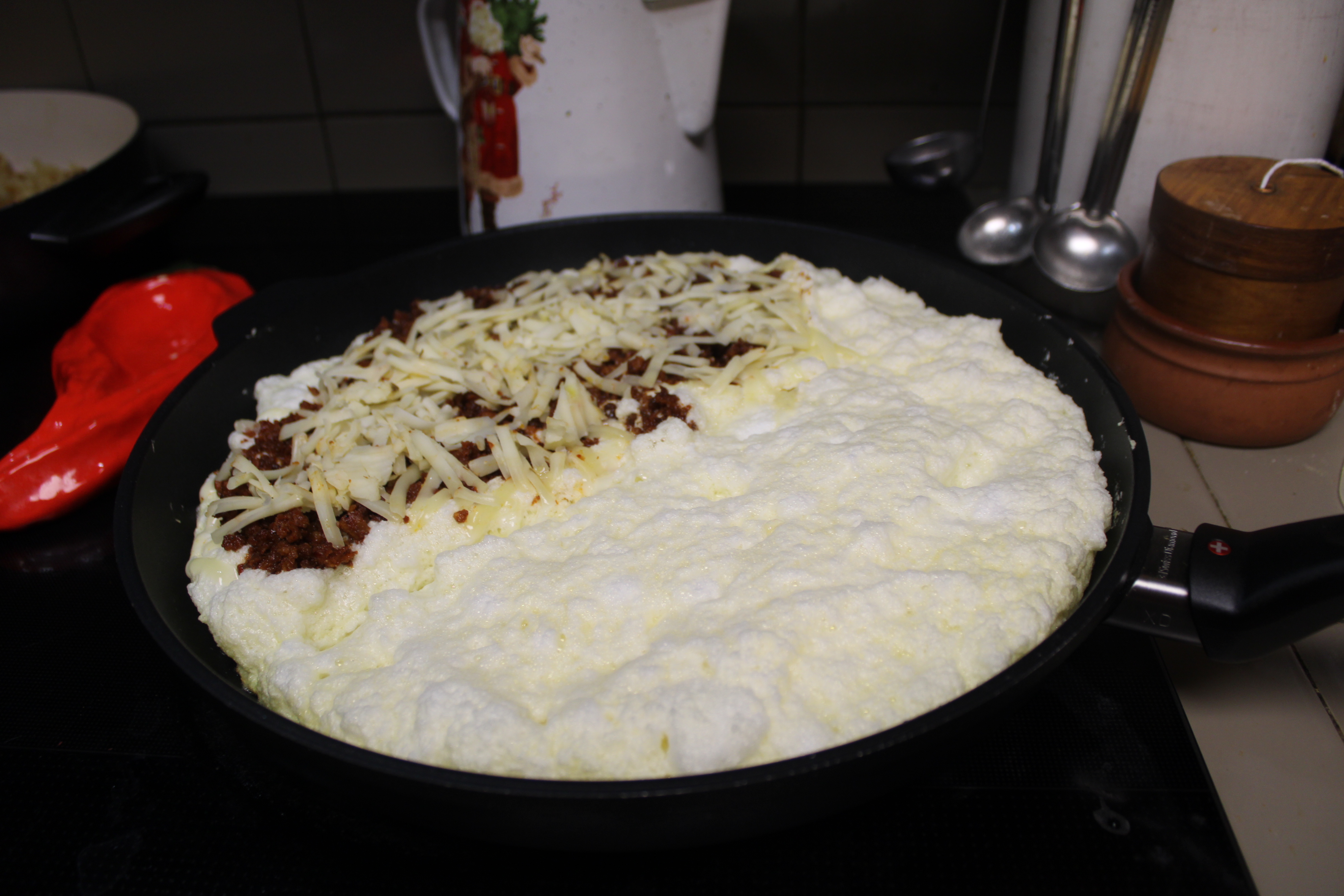 Pour egg mixture into the warmed pan. Cook omelette until lightly browned on the bottom, tops nearly dry. With a spatula, cut a line down the middle of the raised omelette without cutting in half. This is a guide for both the filling as to help with the fold. Spread chorizo over one side of the omelette, top with grated cheese. Carefully fold the empty half of the omelette over the filled side. Remove from heat, cover skillet with a lid and let the residual heat melt the cheese.
