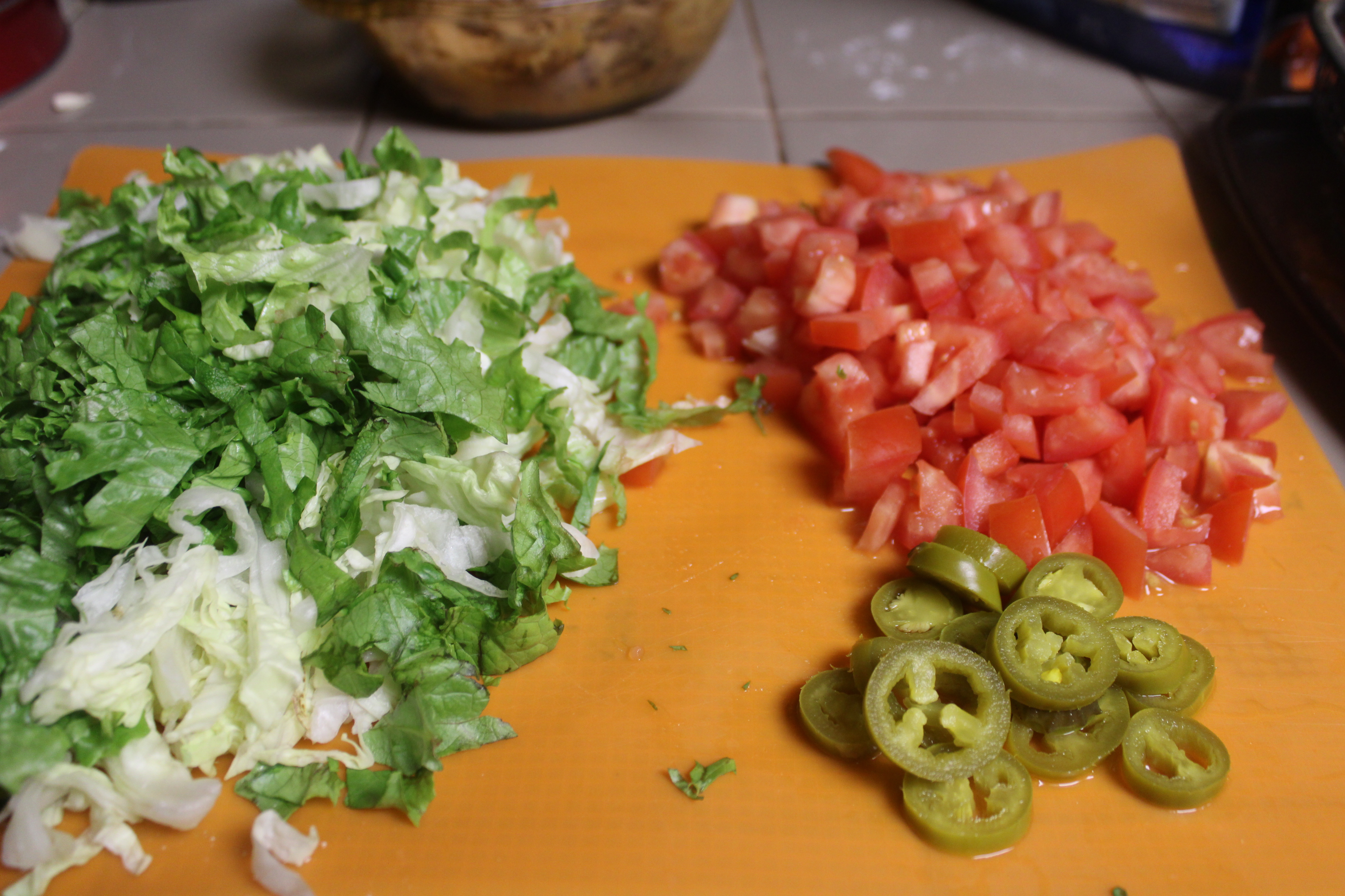 Split tomatoes open, remove seeds. Dice tomatoes, set aside. Stack lettuce leaves together, roll tight to chiffonade cut. Drain Jalapeño Peppers. Have shredded cheese and sour cream at the ready.
